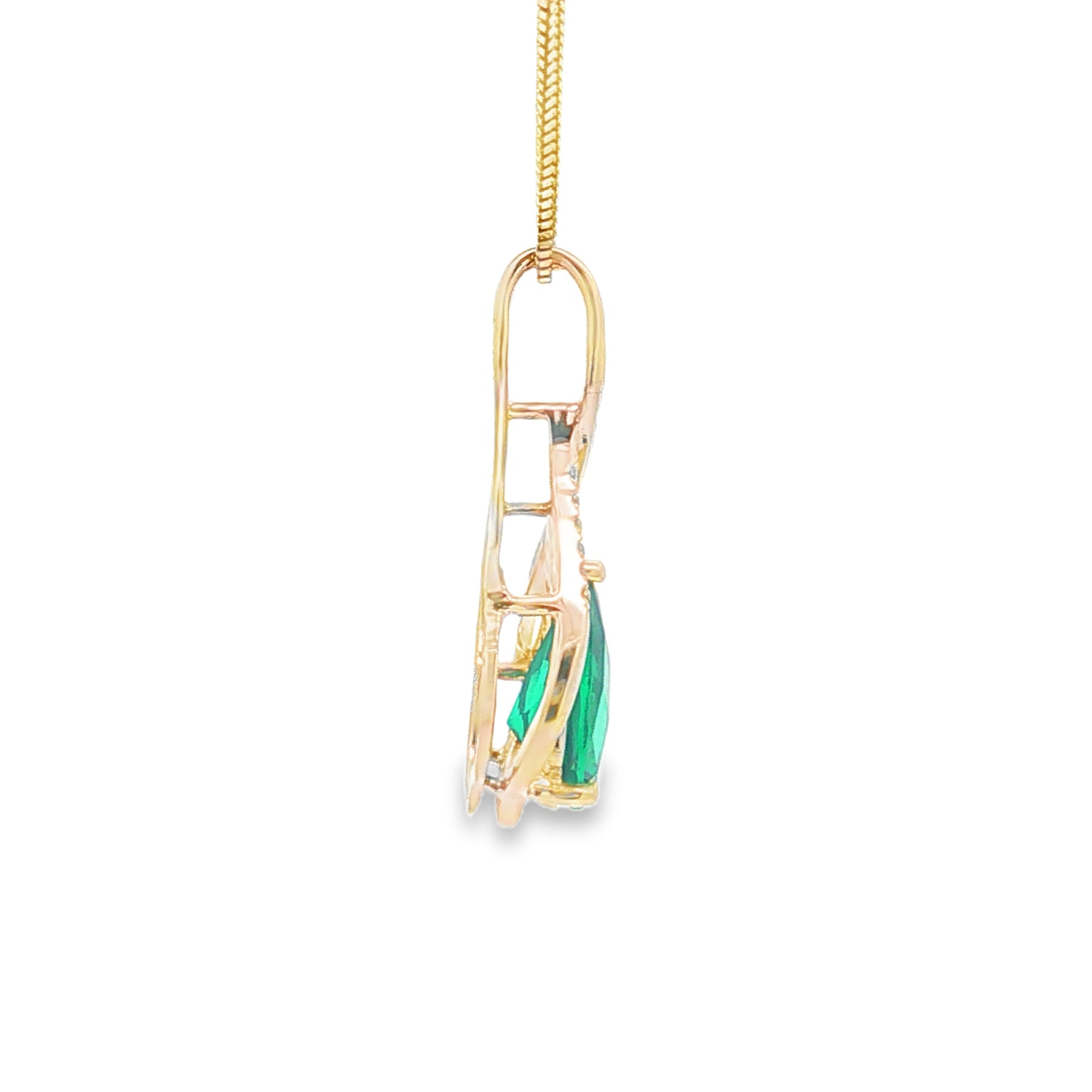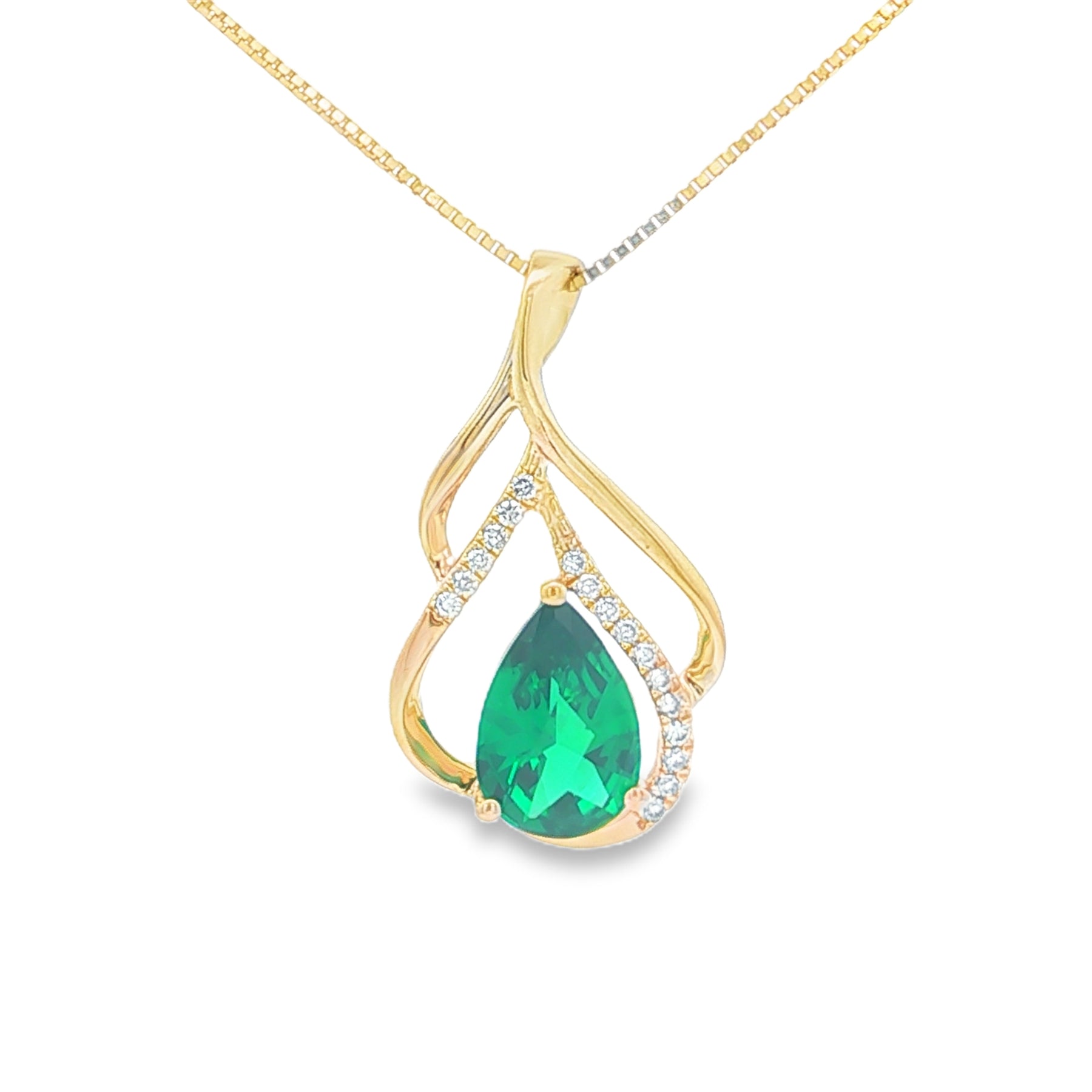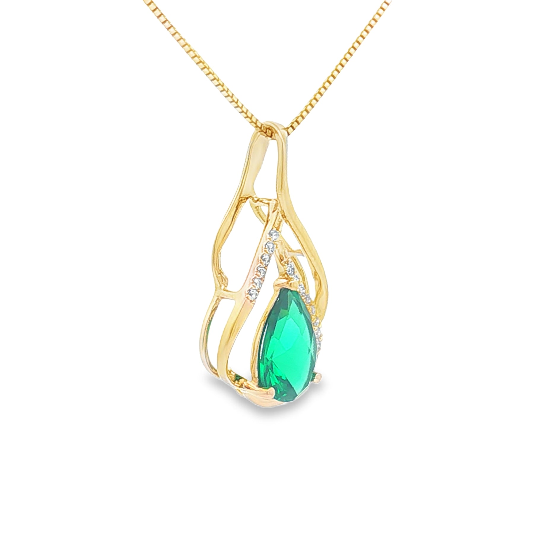 This elegant 14K yellow gold necklace features a 1.06ct lab-grown pear-shaped emerald wrapped in a flowing teardrop design accented by .05ct diamonds. The vibrant emerald sits at the heart of the open gold frame, creating a bright, luxurious centerpiece. Finished with an 18" chain and spring ring clasp, this piece brings color, sparkle, and sophistication to any look.