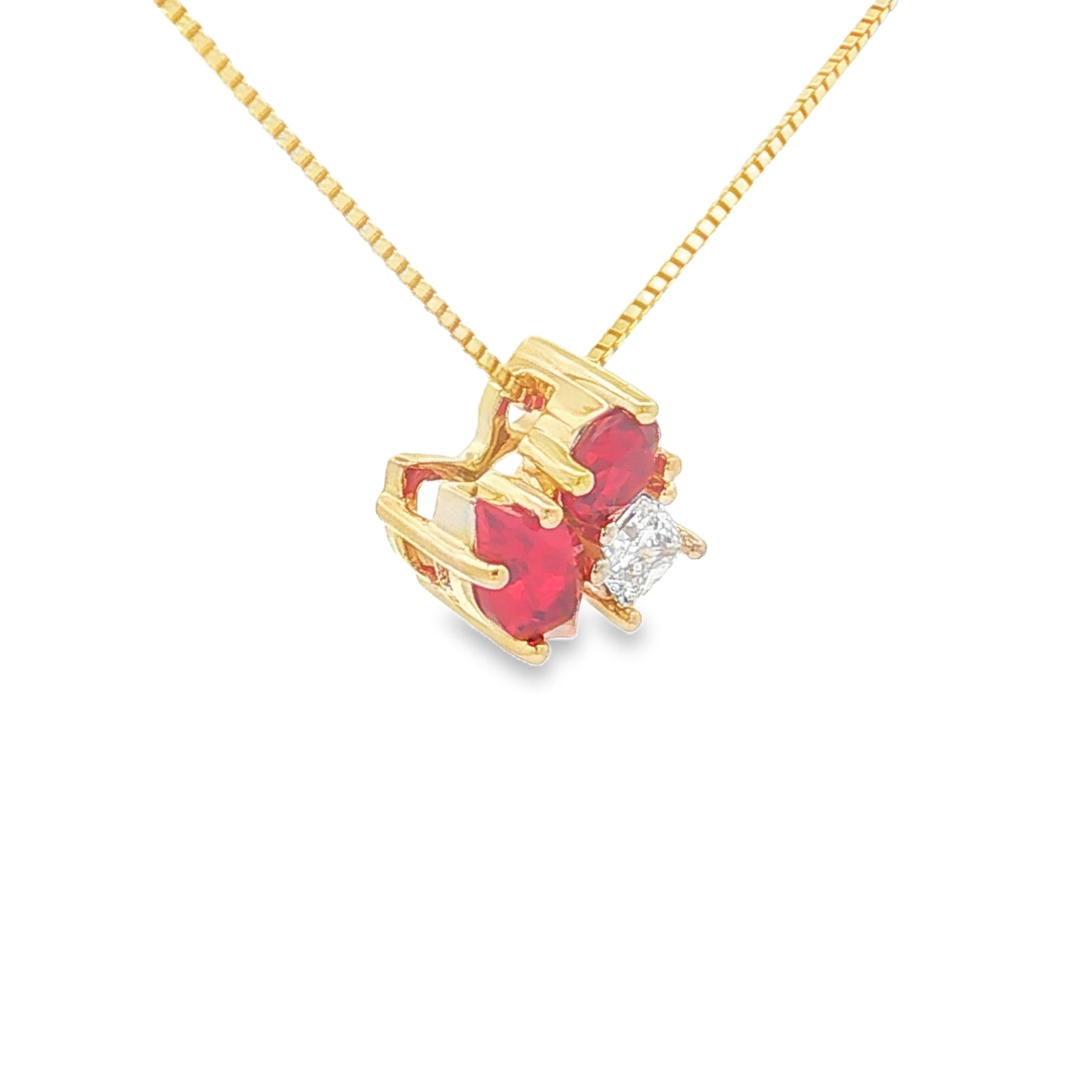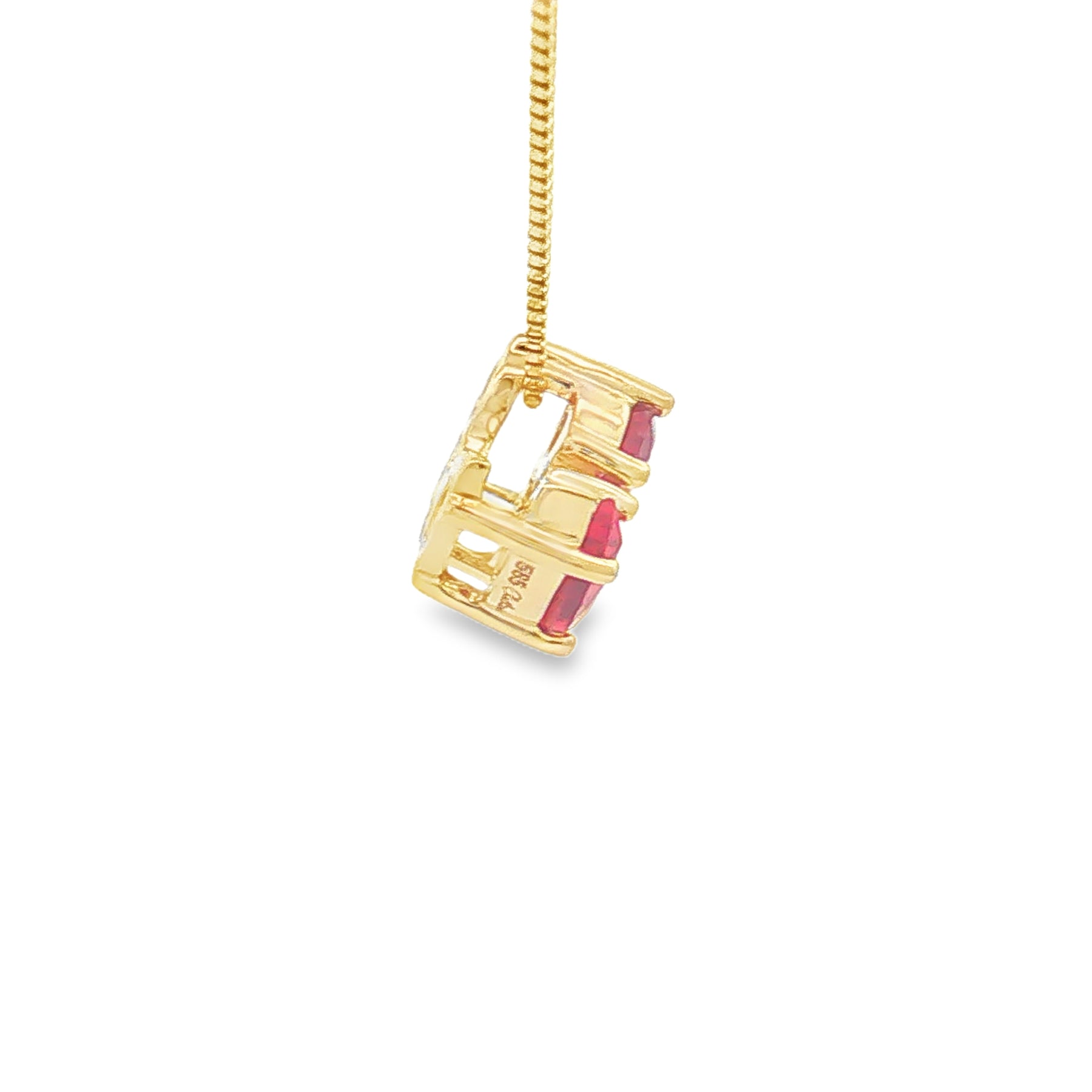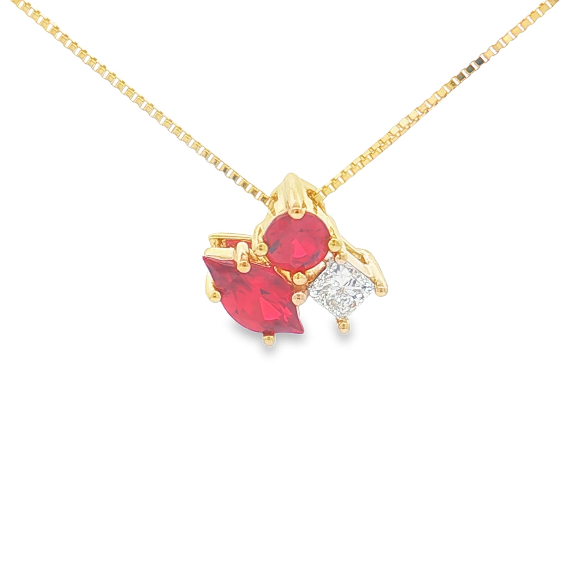 This vibrant 14K yellow gold necklace showcases a colorful cluster of .58ct lab-grown rubies paired with a .15ct natural diamond, blending bold red brilliance with classic sparkle. Set on an 18" chain with a secure spring ring clasp, this piece brings together multiple stone shapes for a playful yet elegant lookโperfect for adding a touch of color to any collection.