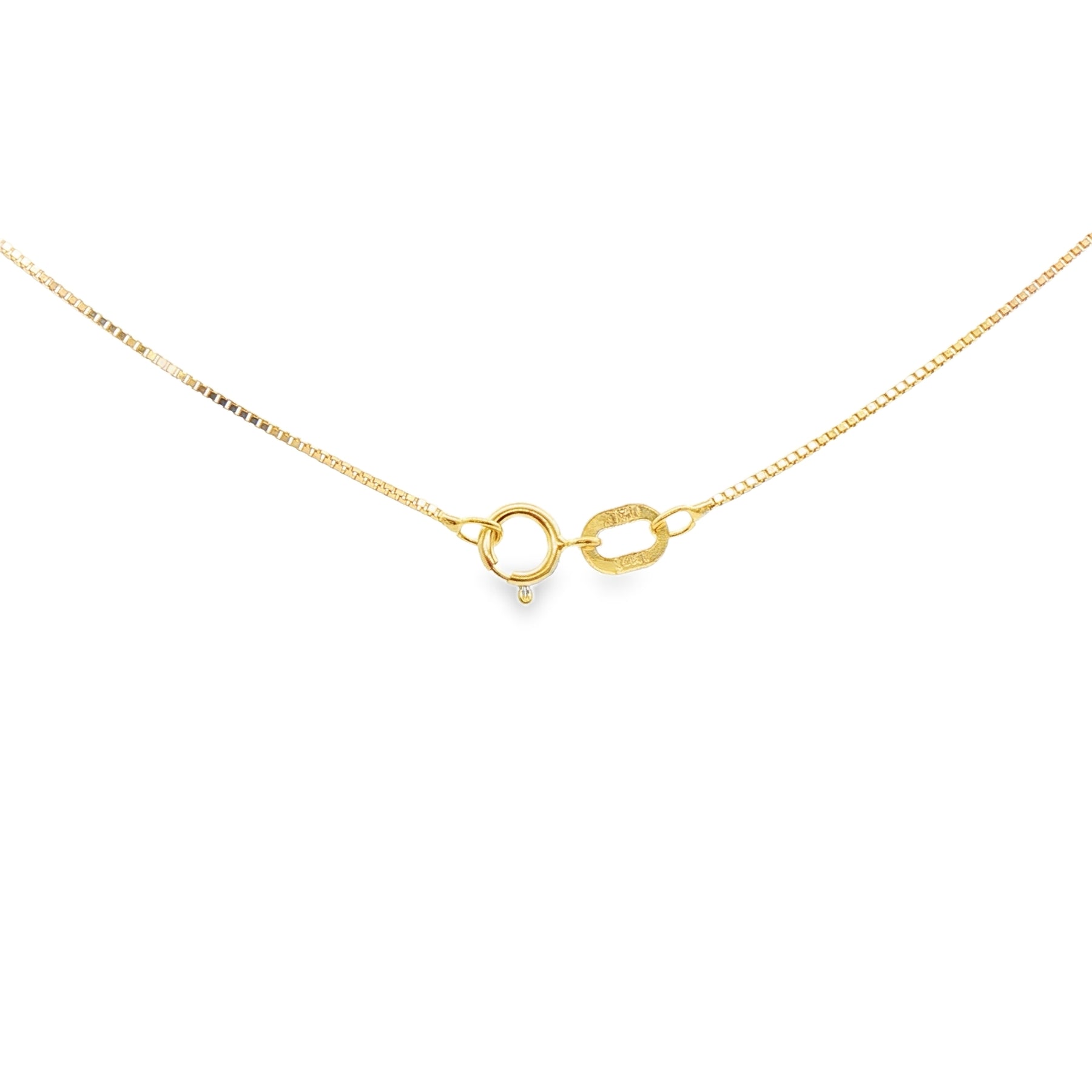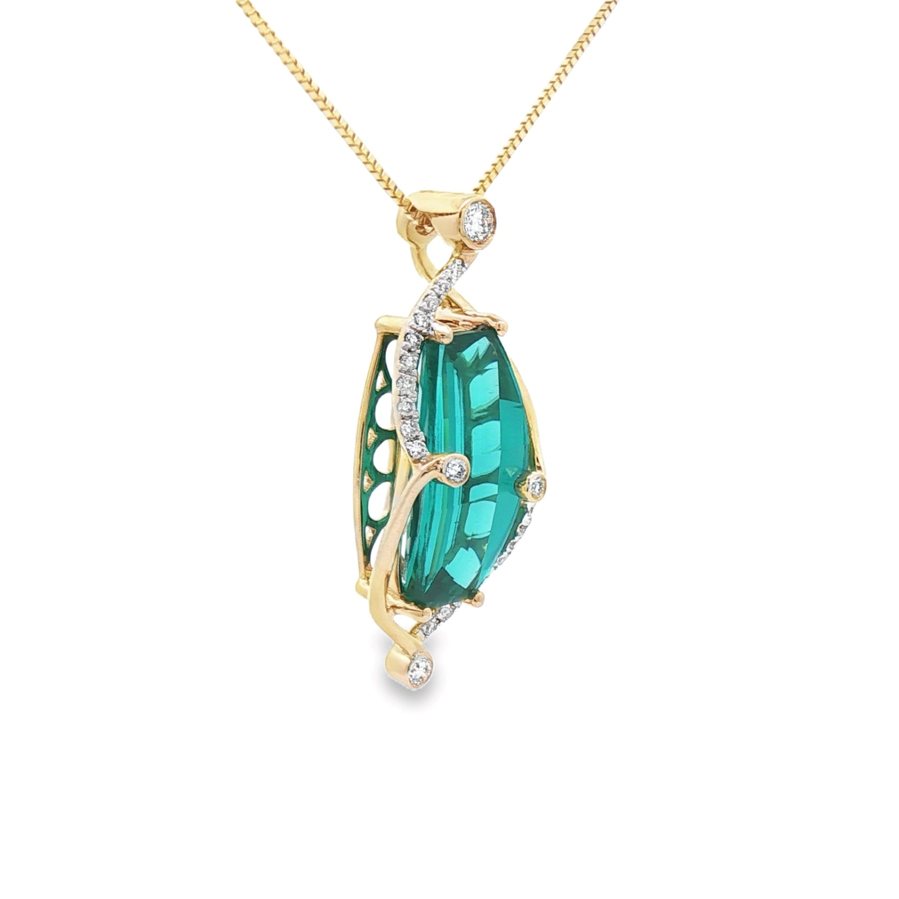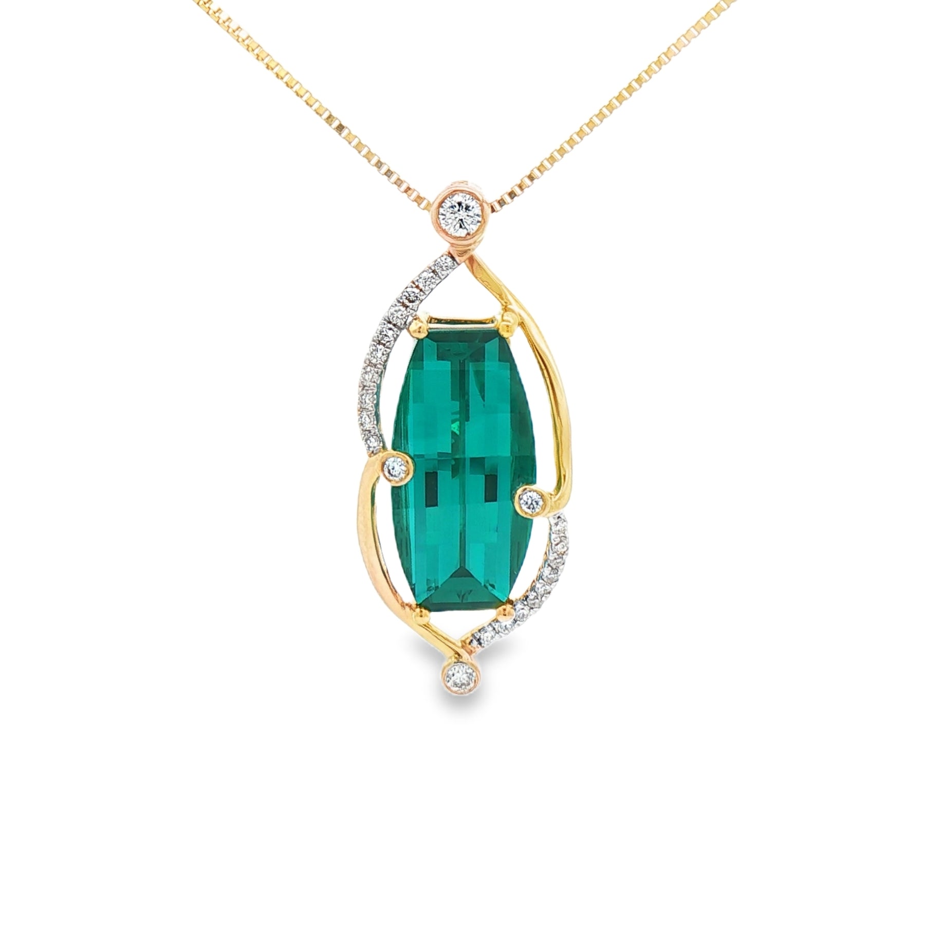 Crafted in 14K yellow gold, this pendant showcases a vibrant 5.1 carat paraiba garnet accented by .13 carats total weight of diamonds. The elongated green center stone is set in a graceful two-tone inspired design and suspended from an 18" box chain with a secure spring ring clasp.