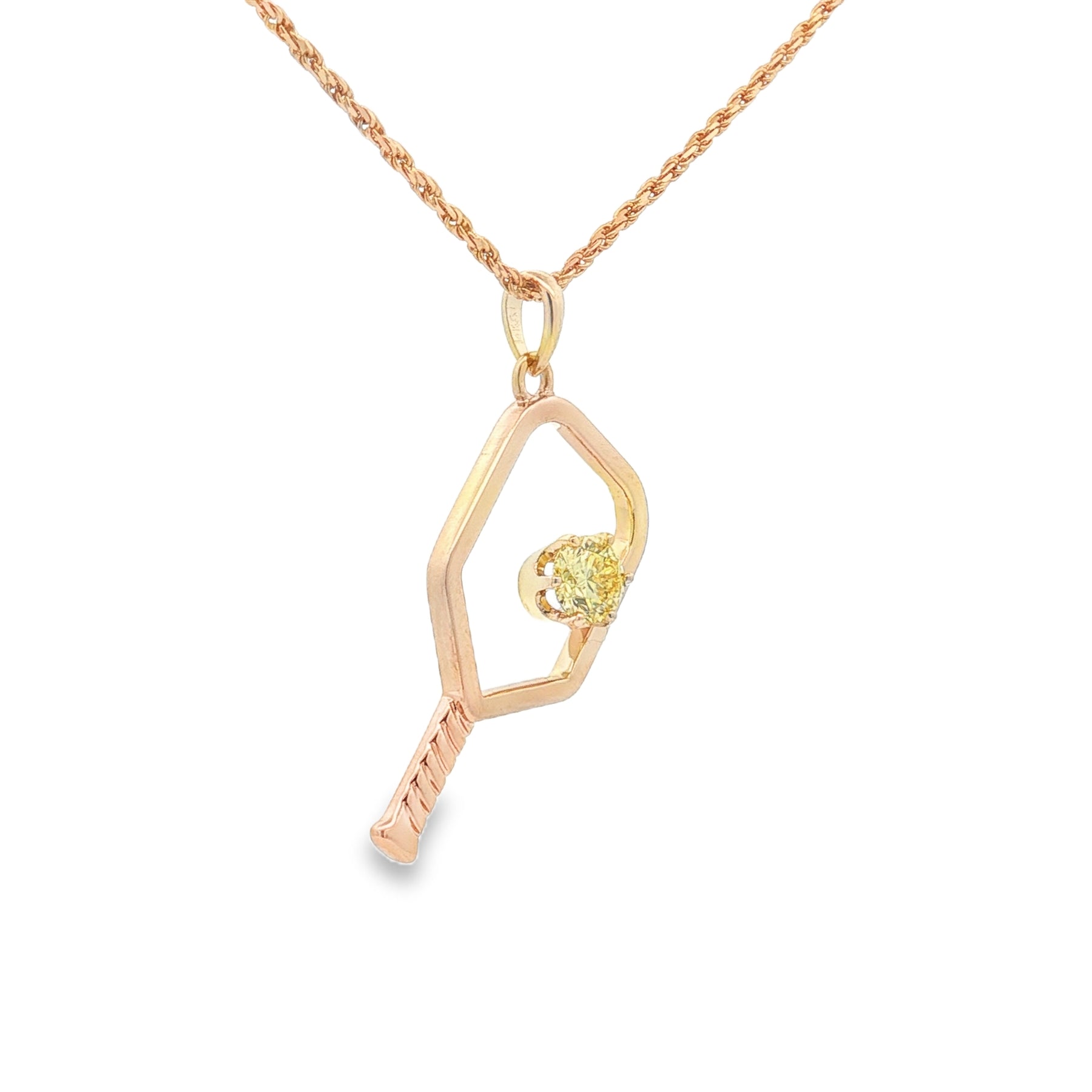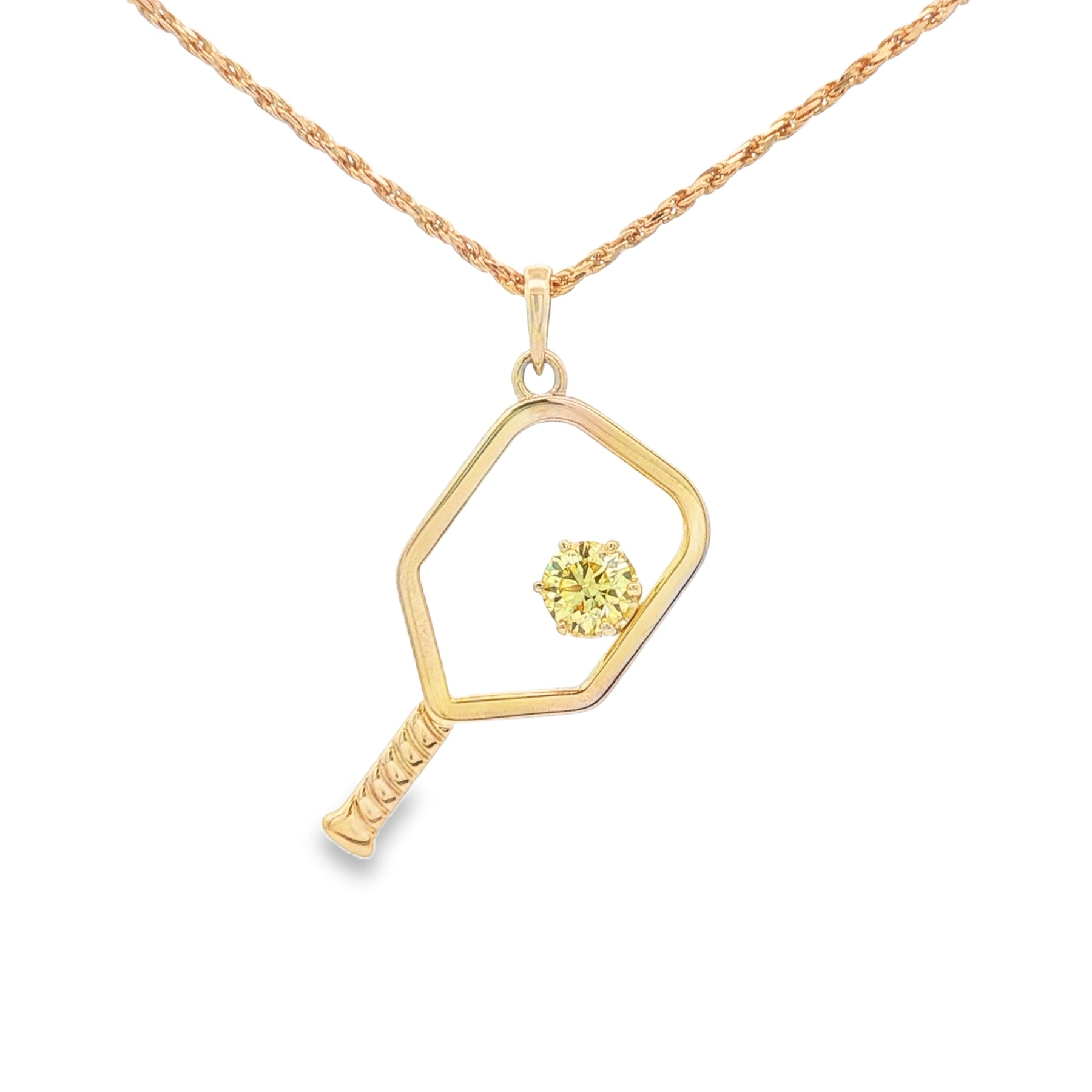 Celebrate your love for the game in style with this 14K yellow gold pickleball paddle pendant, featuring a dazzling .5ct round lab-grown yellow diamond (VS2 clarity) that captures the energy of every match. Hanging on a 20-inch 1.3mm rope chain with a secure lobster clasp, this piece blends sporty flair with luxury brilliance ā a perfect match for both on and off the court.