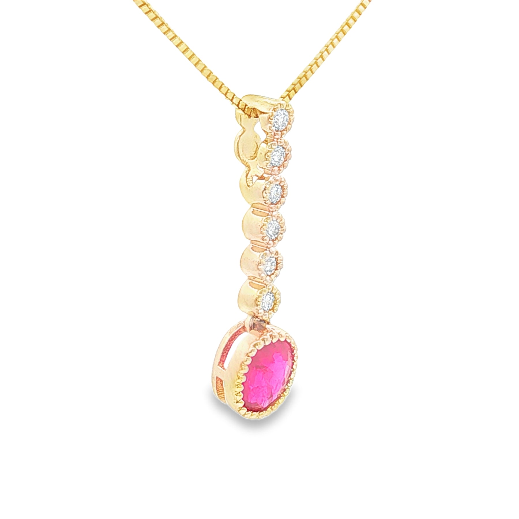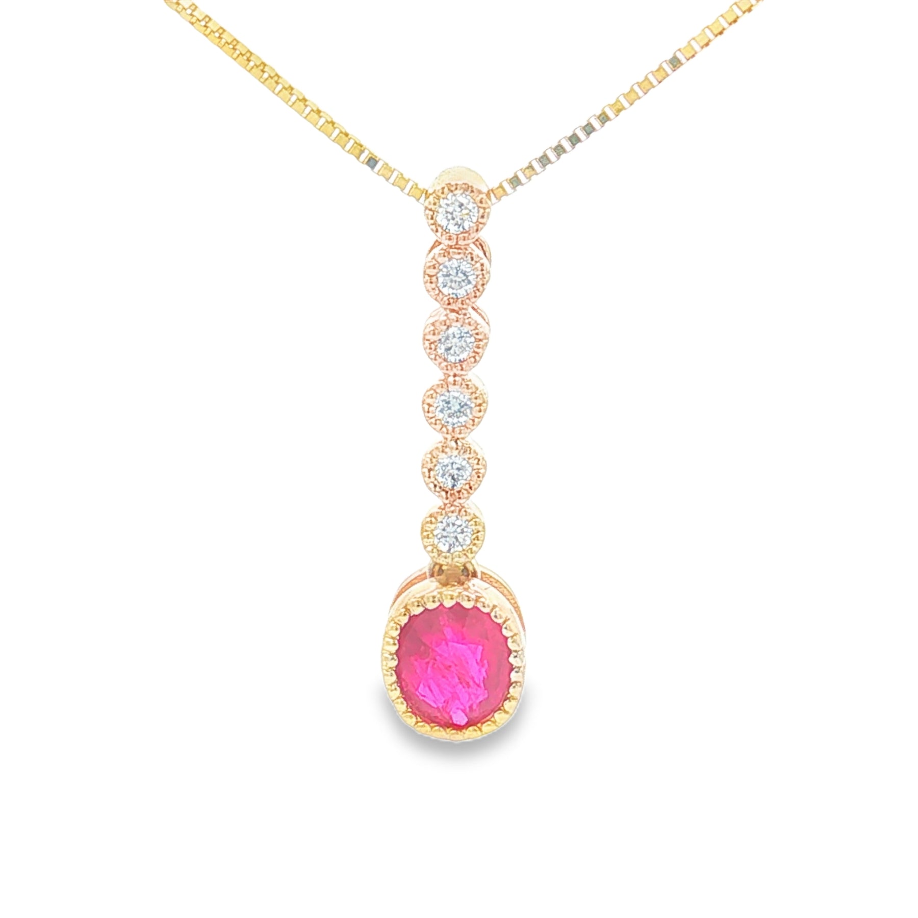 This elegant 14K yellow gold necklace showcases a vivid .38ct oval ruby suspended beneath a vertical cascade of .07ct round diamonds. The rich red ruby adds a bold pop of color, while the diamonds create a graceful line of sparkle leading the eye down to the center stone. Finished with an 18" chain and spring ring clasp, this necklace brings classic beauty to any jewelry collection.