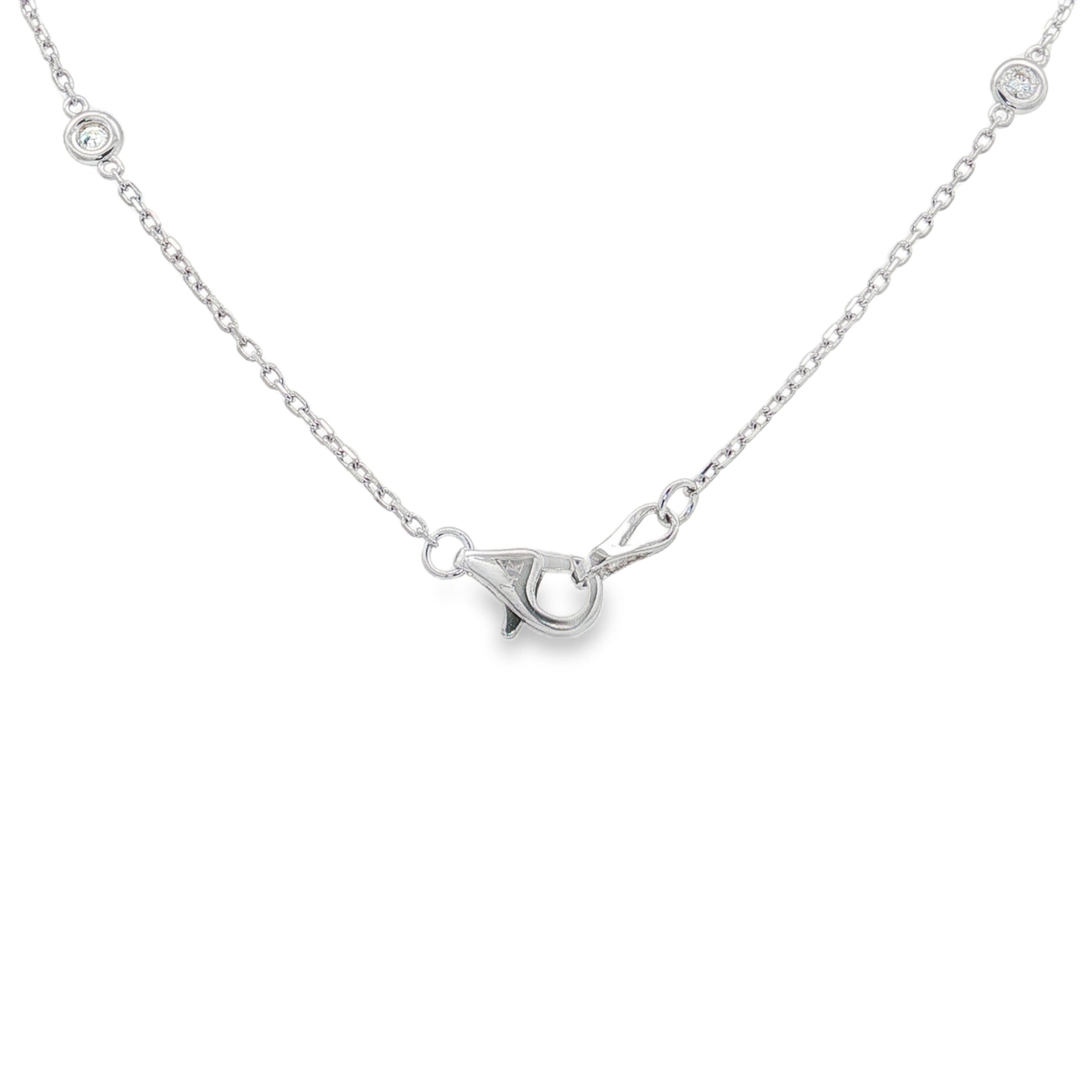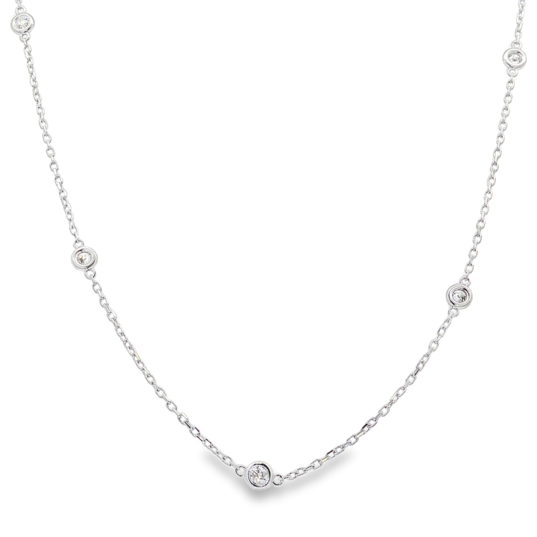 Crafted in timeless 14K white gold, this elegant necklace features .51 carats of round natural diamonds bezel-set along an 18" chain. Each diamond shimmers with brilliance, creating a sophisticated look that layers beautifully or shines on its own. Secured with a durable lobster clasp for everyday elegance. Details: š Diamonds: .51ct total weight, natural round cut šØ Metal: 14K white gold š Length: 18" š Clasp: Lobster clasp š©ā Elegant & versatile design Use our web chat or text us at 937-898-8670 for sizing or length adjustment options.
