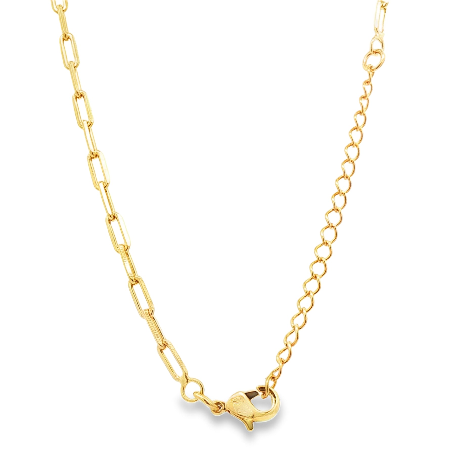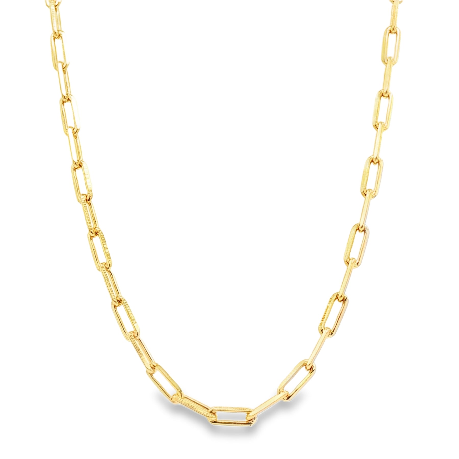 This modern paperclip link necklace is crafted in gold plated metal and features elongated rectangular links measuring 6.8mm x 2.6mm. Designed with a 17.5" length plus a 2" extender, it offers flexible styling for everyday wear or layering. The clean geometry and polished finish give this necklace a refined, contemporary look that pairs effortlessly with both casual and elevated styles.