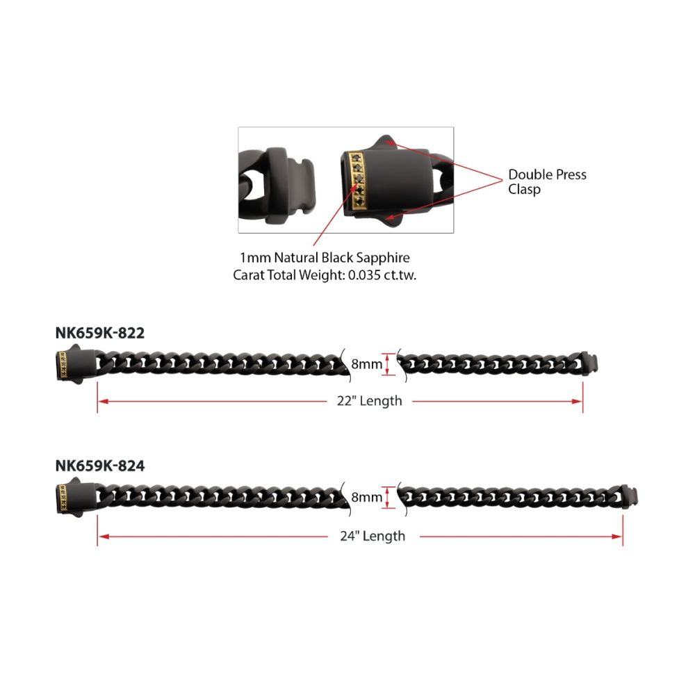 This black IP steel Miami Cuban chain features a matte finish and an 18K gold-IP double press box clasp set with a genuine black sapphire, delivering bold, modern style perfect for solo wear or layering.