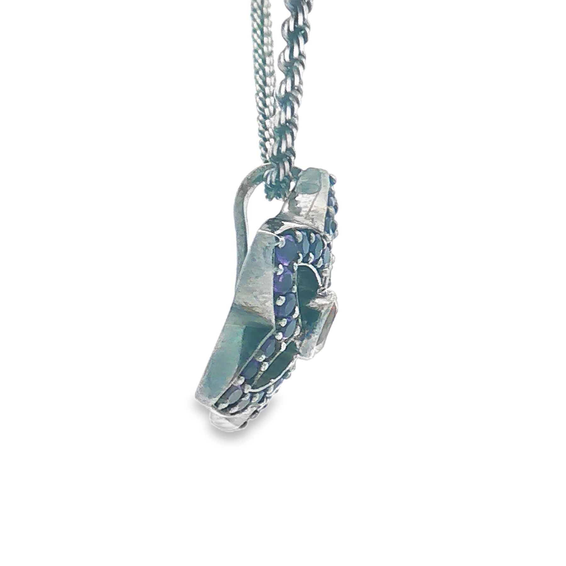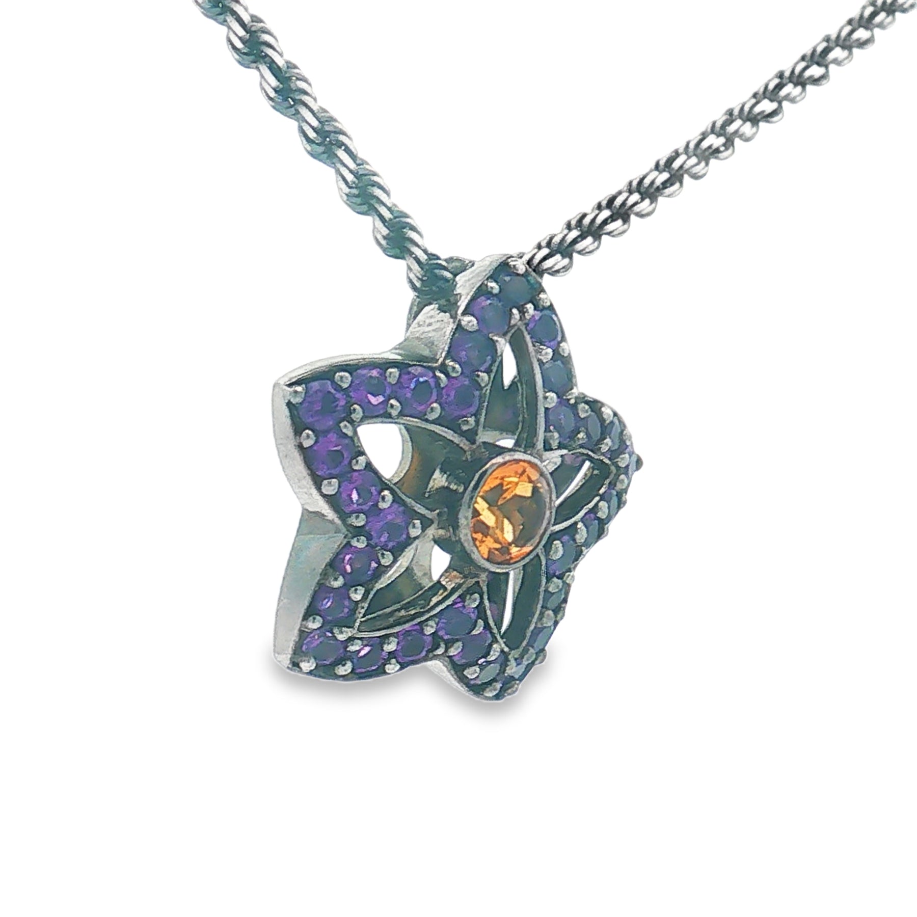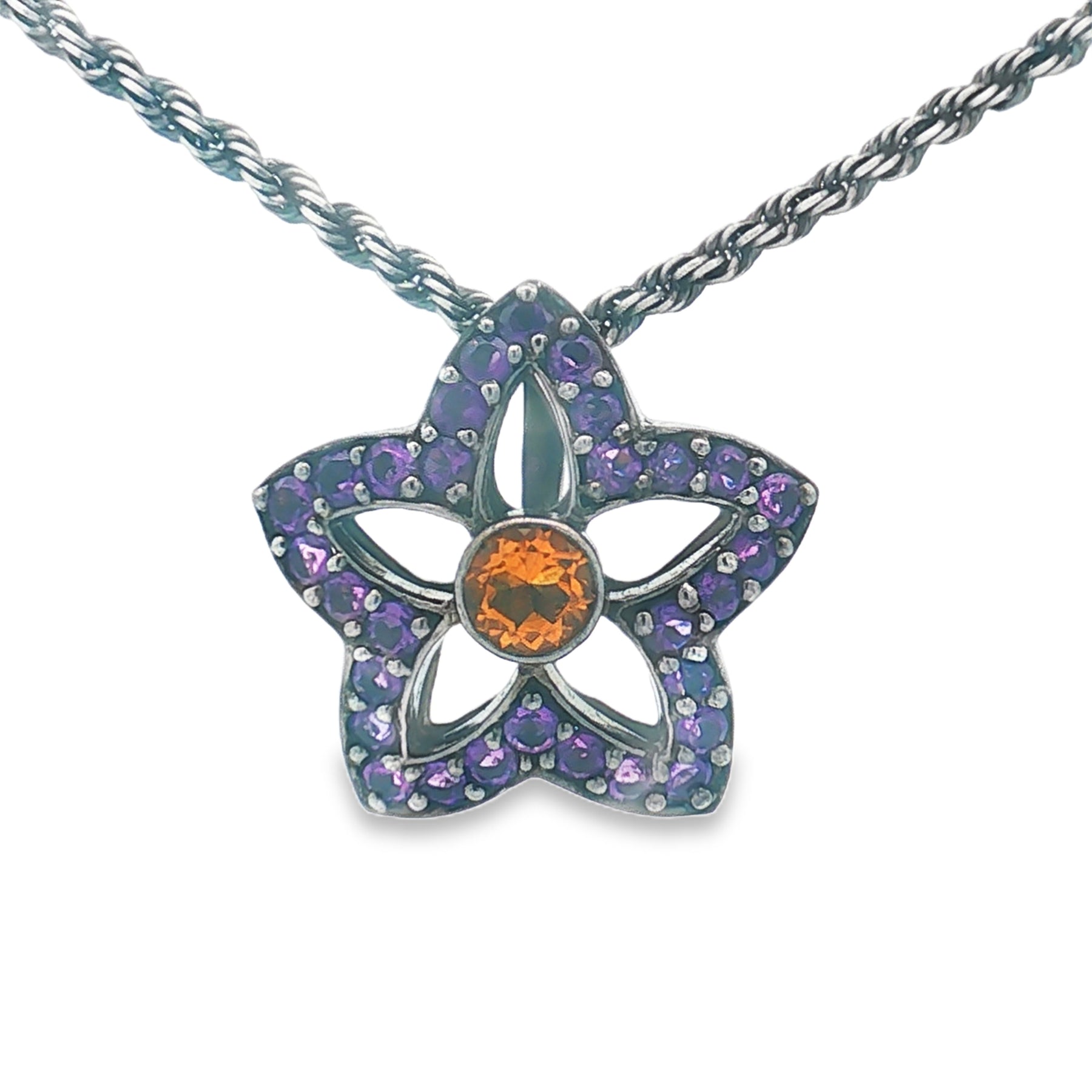 This bold pendant showcases a .65ct golden citrine framed by 1.45ct of vibrant amethyst in a striking star-shaped design. Crafted in black-plated sterling silver, it delivers a rich, modern contrast that stands out beautifully. The pendant hangs from an 18" rope chain with a secure lobster clasp.