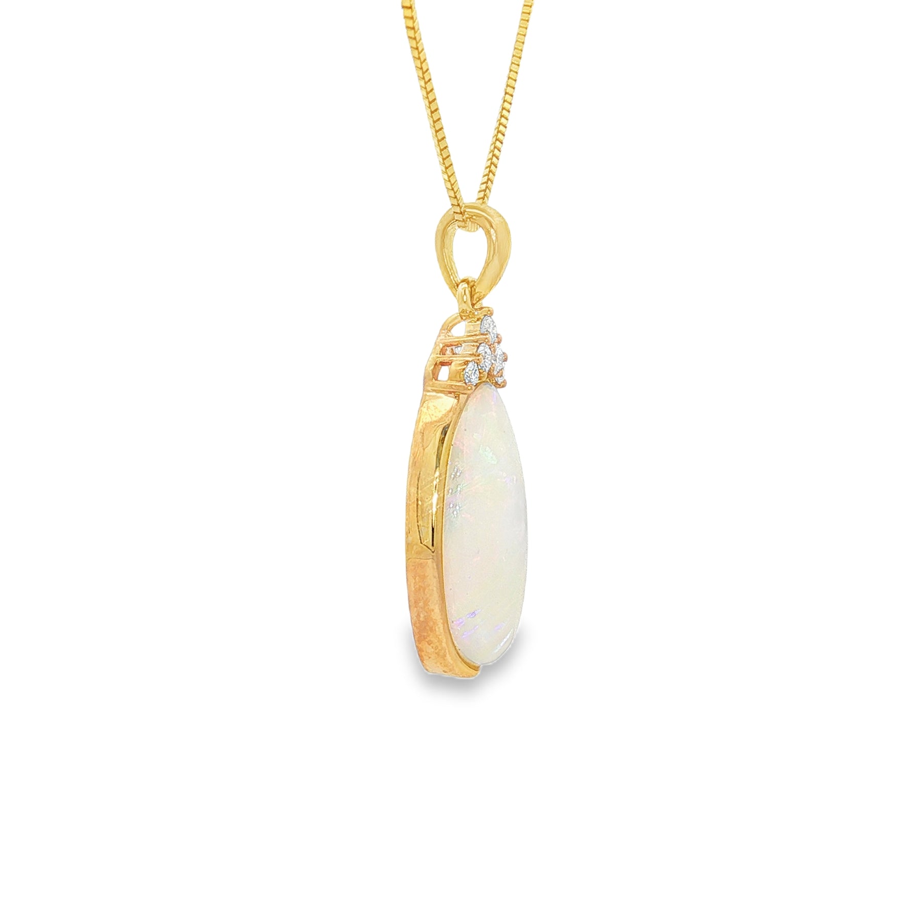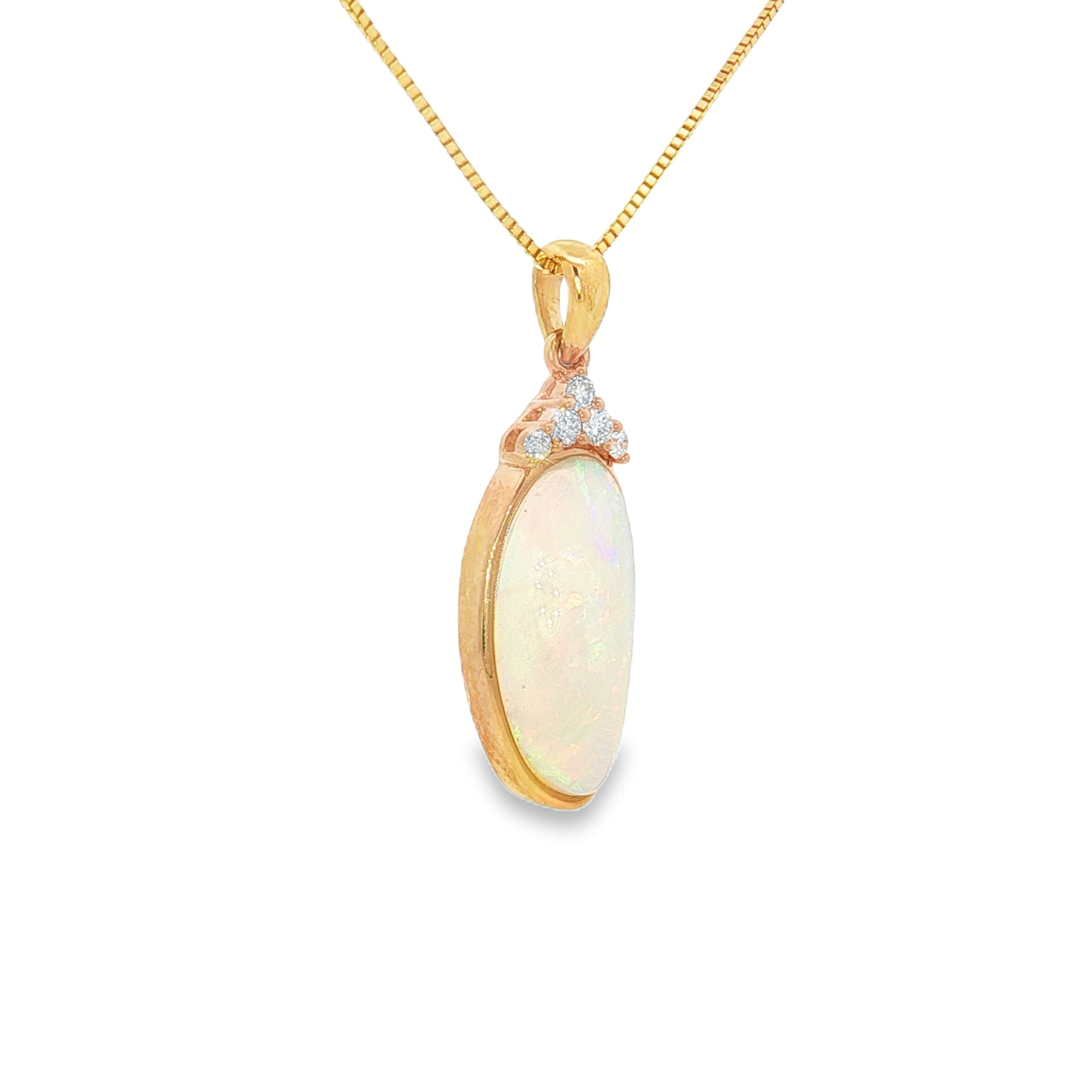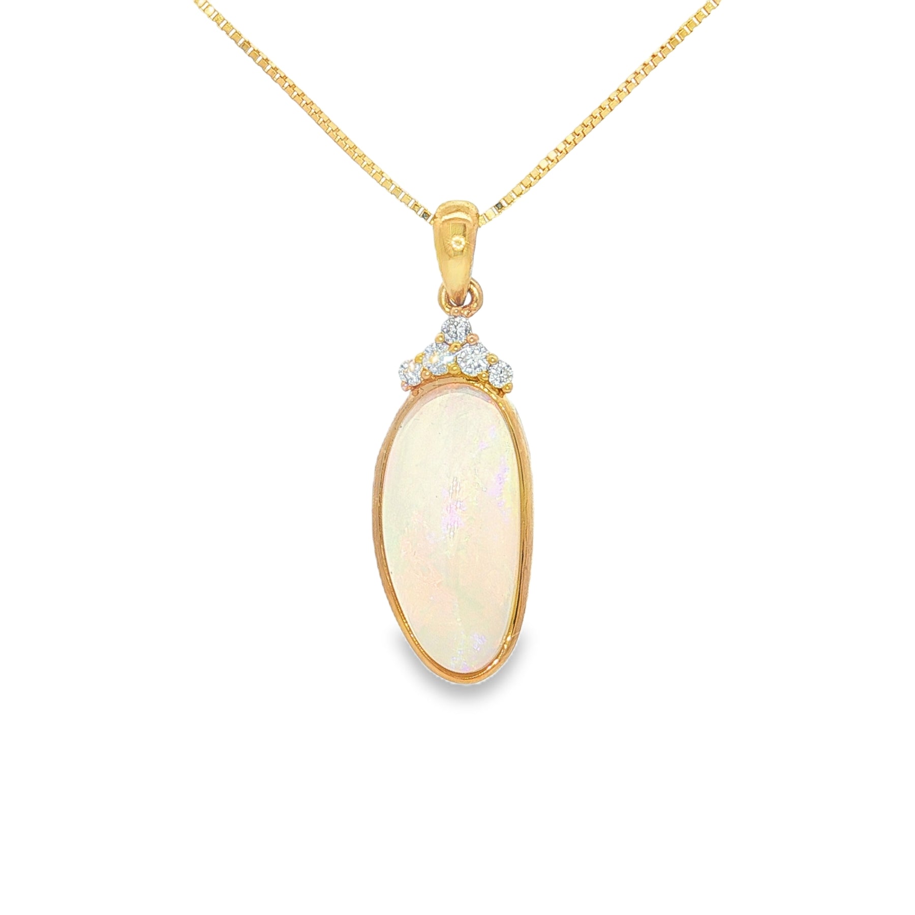 Discover timeless elegance with our exquisite 18k yellow gold pendant featuring a stunning 1.58ct opal at its center. This captivating piece showcases the opal's vibrant play of color, beautifully set in luxurious yellow gold. Suspended from a sleek 14k yellow gold box chain, this necklace adds a touch of sophistication to any outfit, whether for special occasions or everyday wear. Perfect as a gift or a personal treat, this pendant necklace is a true statement of style and elegance.