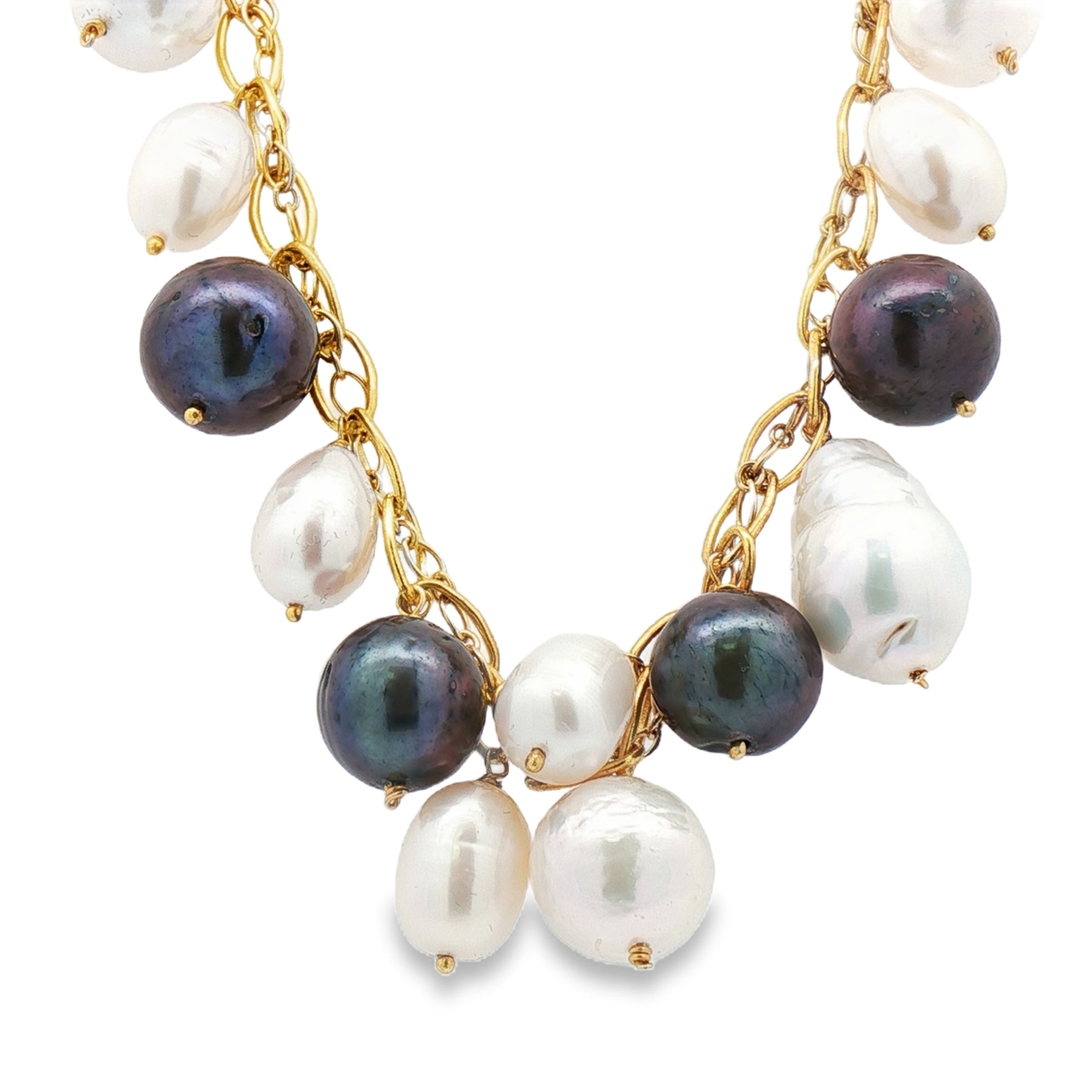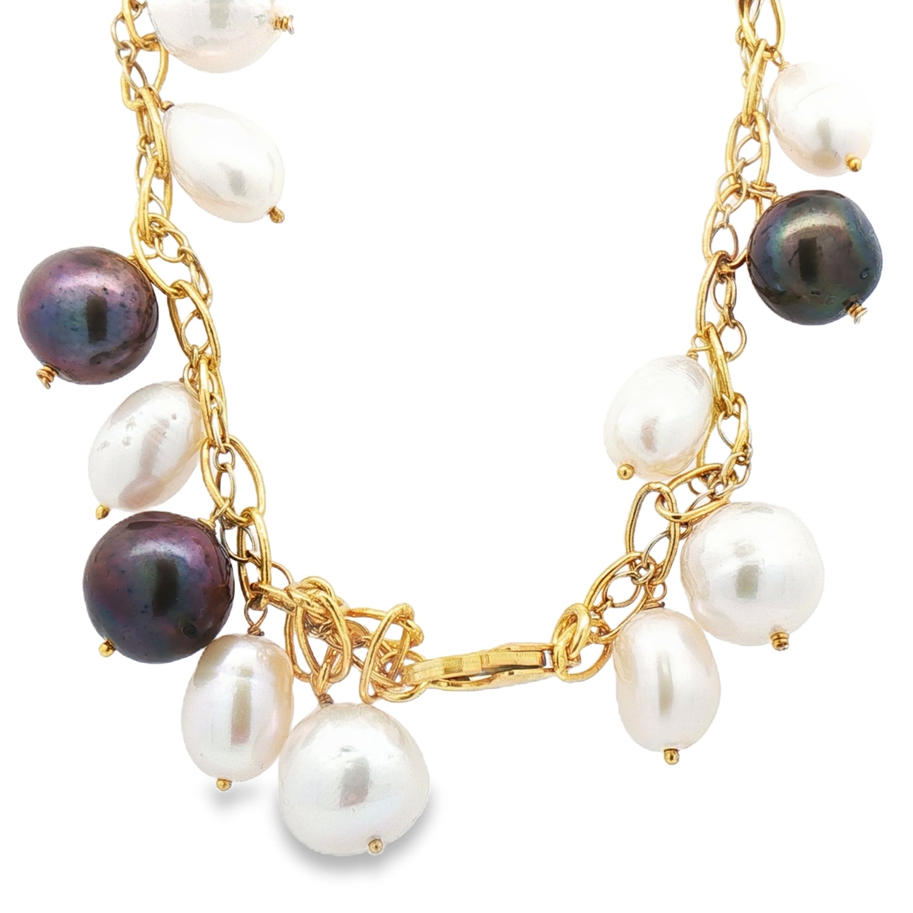 This 18" necklace is crafted in yellow gold plated sterling silver and features a striking mix of freshwater and Tahitian pearls. The contrasting tones create an elegant statement, finished with a secure lobster clasp for comfortable everyday or special-occasion wear.