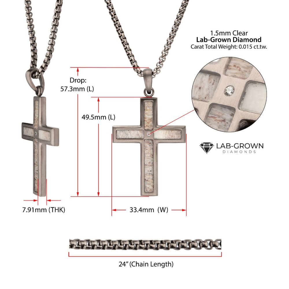 This menโs cross pendant features gunmetal IP stainless steel with genuine deer antler inlay and a .015ct lab-grown diamond center, paired with a 24" box chain for rugged everyday style.