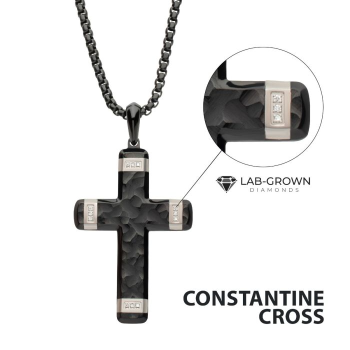 Matte Finish Black IP Carved Steel Large Cross Pendant with steel accents & Lab-Grown Diamonds, with Black Box Chain. 24"