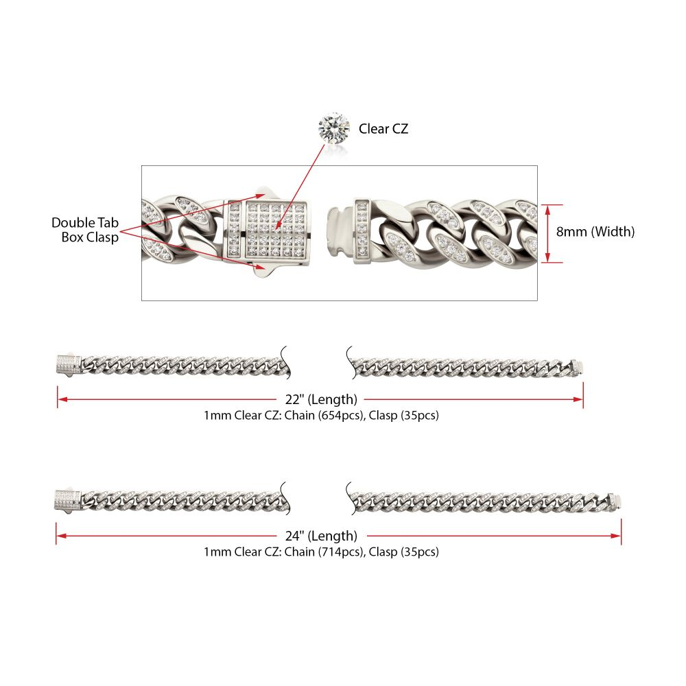 This bold 22" Miami Cuban chain brings high-end shine with everyday durability. Crafted in polished stainless steel, each 8mm link is set with precision-cut clear cubic zirconia for a bright, modern look. The secure double tab box clasp adds both style and confidence, making this the perfect statement chain for day or night. Details: āš™ļø Metal: Stainless steel šŸ“ Length: 22" šŸ“ Width: 8mm links šŸ’Ž Stones: 1mm clear cubic zirconia, CNC set šŸ”’ Closure: Double tab box clasp