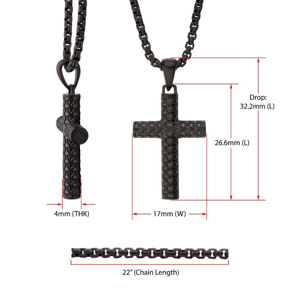 This bold men’s cross pendant features a rugged scale-textured design crafted in durable black IP matte-finished stainless steel. Paired with a strong 22" box chain, this piece delivers a powerful, modern look with exceptional wearability. A standout accessory for everyday style or meaningful gifting.