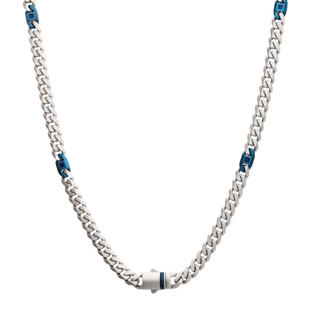 Men’s ocean steed necklace features a matte steel beveled Cuban chain with blue IP accent links and black sapphire details, inspired by Poseidon’s legendary steed and built for bold, modern style.