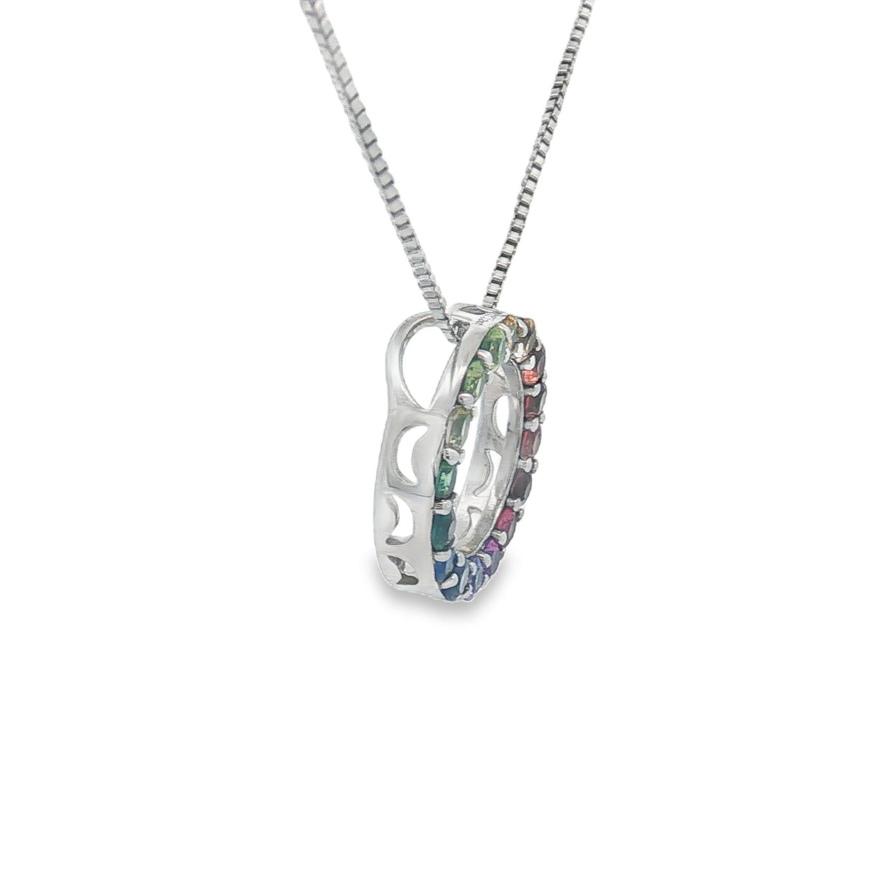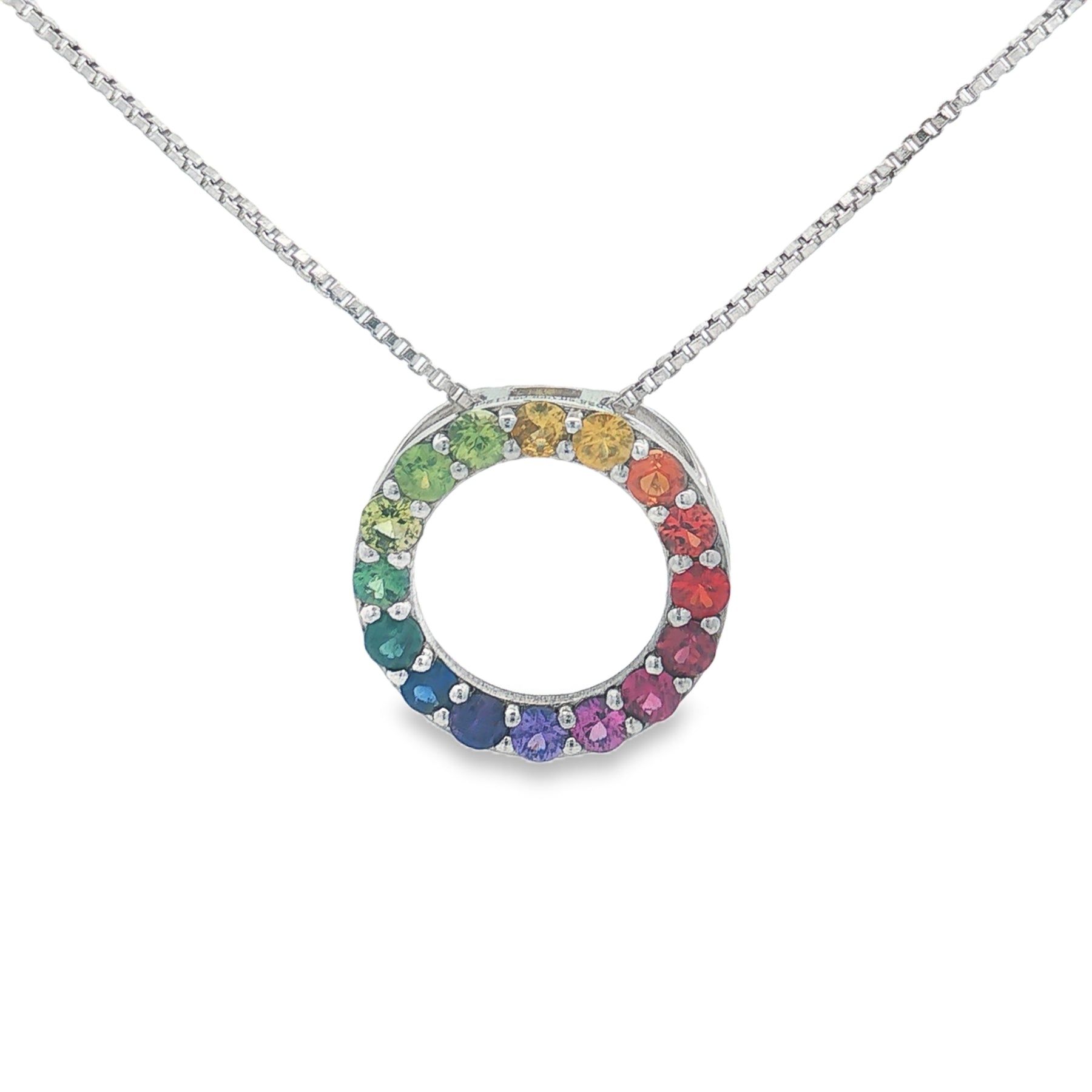 This vibrant sterling silver necklace features a full circle of 1.12ct of natural rainbow sapphires, carefully prong-set to create a dazzling, color-shifting spectrum. Finished with an 18" box chain and a secure spring-ring clasp, this piece brings together elegance, personality, and everyday wearability.