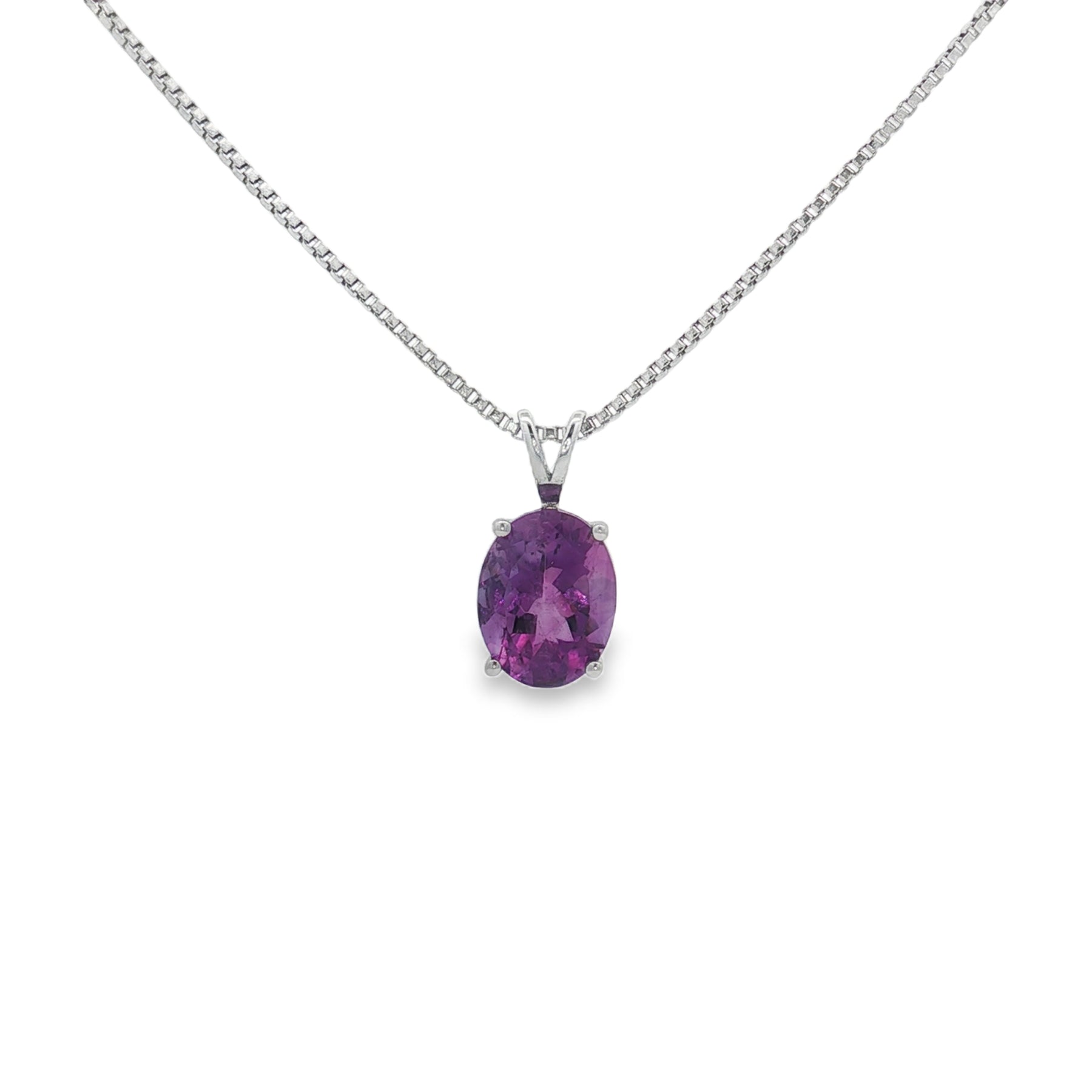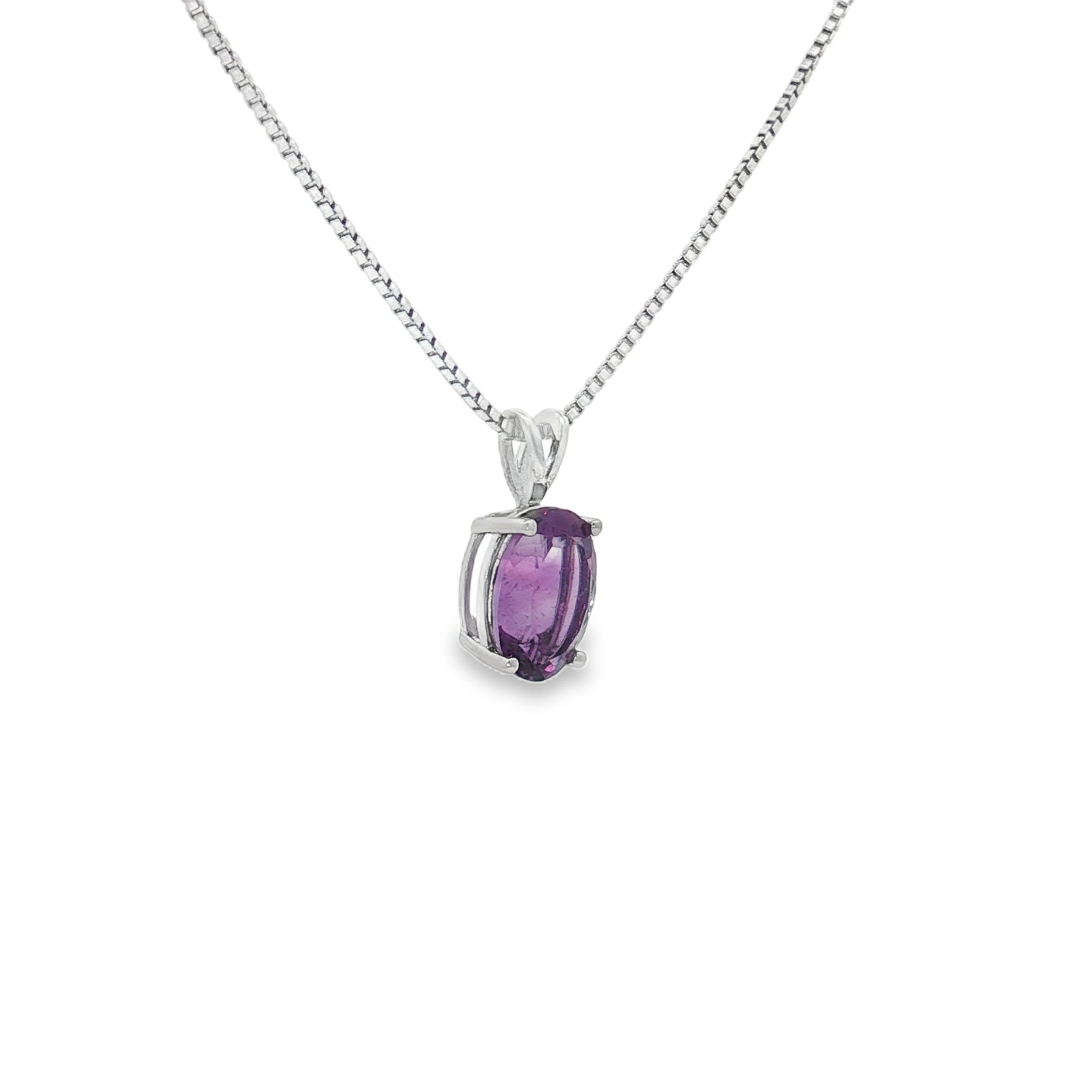 This sterling silver necklace brings timeless elegance with a vibrant pop of color. Crafted with a genuine 1.65ct oval-cut amethyst, the pendant hangs gracefully from an 18" sterling silver chain with a secure spring ring clasp. The vivid purple hue makes it a standout piece, perfect for both everyday wear and special occasions.