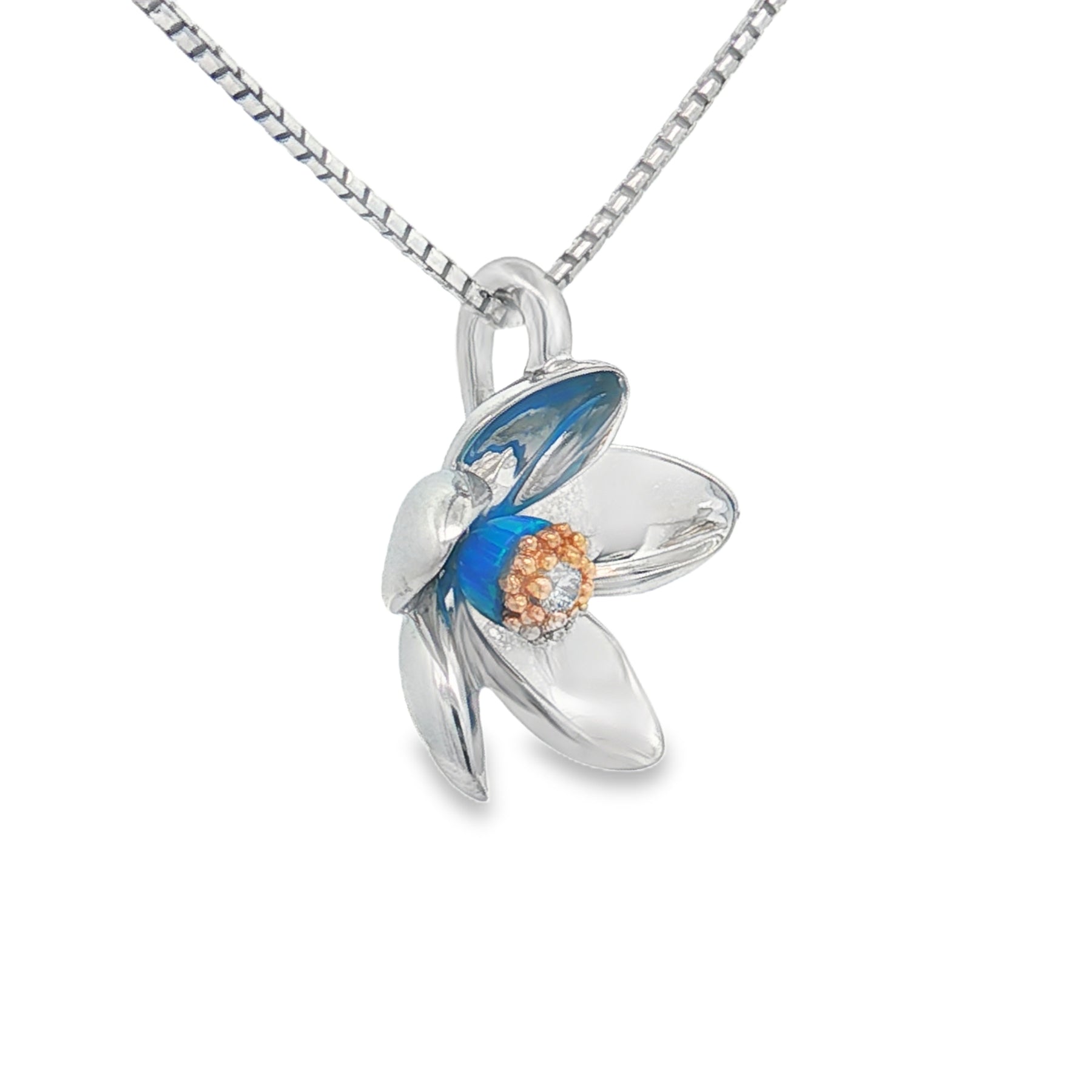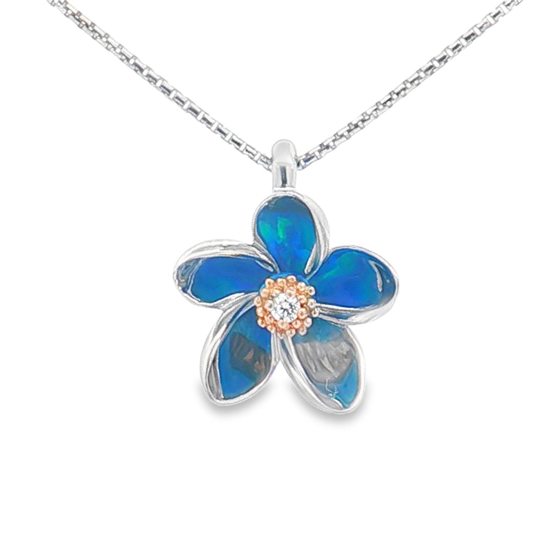 This beautiful pendant features a vibrant plumeria flower crafted in sterling silver with 14K yellow gold accents, highlighted by a sparkling .03ct diamond at its center. The petals shimmer with tropical color, creating a bright, island-inspired look. Suspended from an 18" sterling silver chain with a secure spring ring clasp, it’s a charming everyday piece or a meaningful gift. Details: πŸͺ™ Metal: Sterling silver & 14K yellow gold 🌺 Design: Plumeria flower πŸ’Ž Diamond: .03ct πŸ“ Chain Length: 18" πŸ”’ Clasp: Spring ring πŸ’¬ Sizing Note: Use our web chat or text us at 937-898-8670 for sizing options.