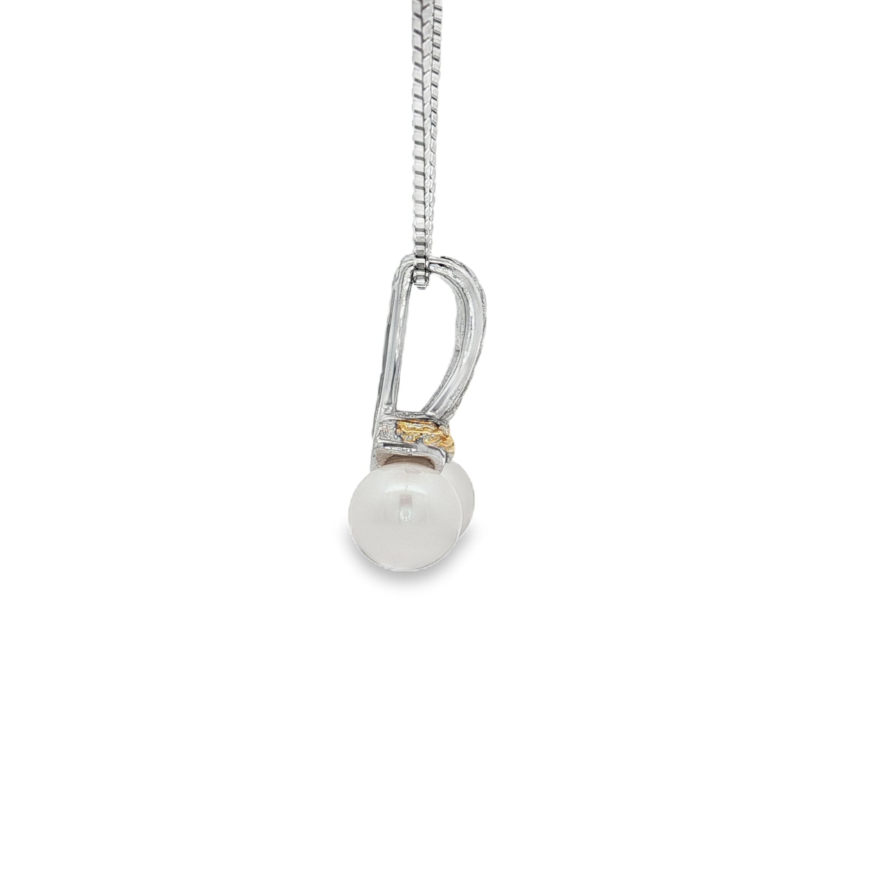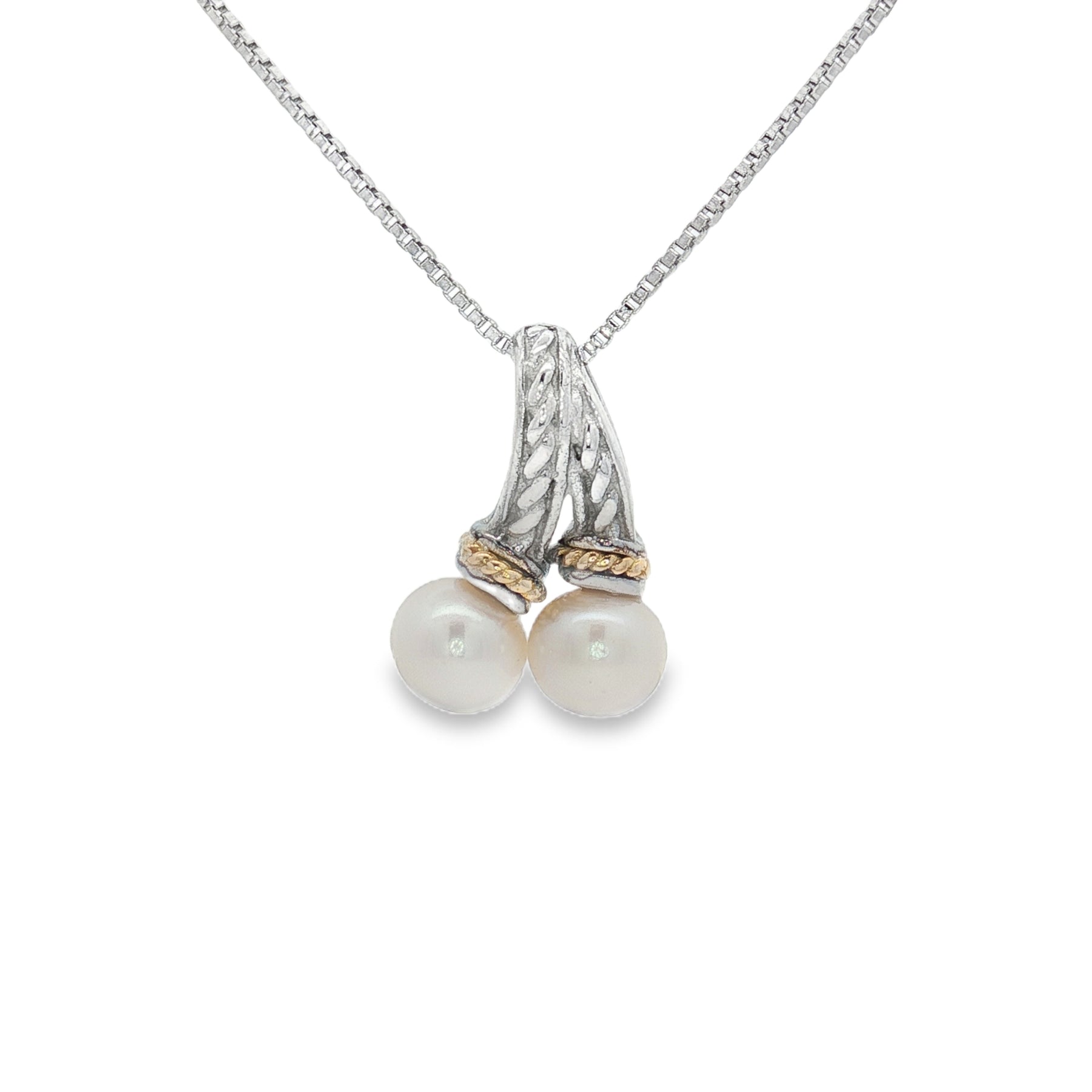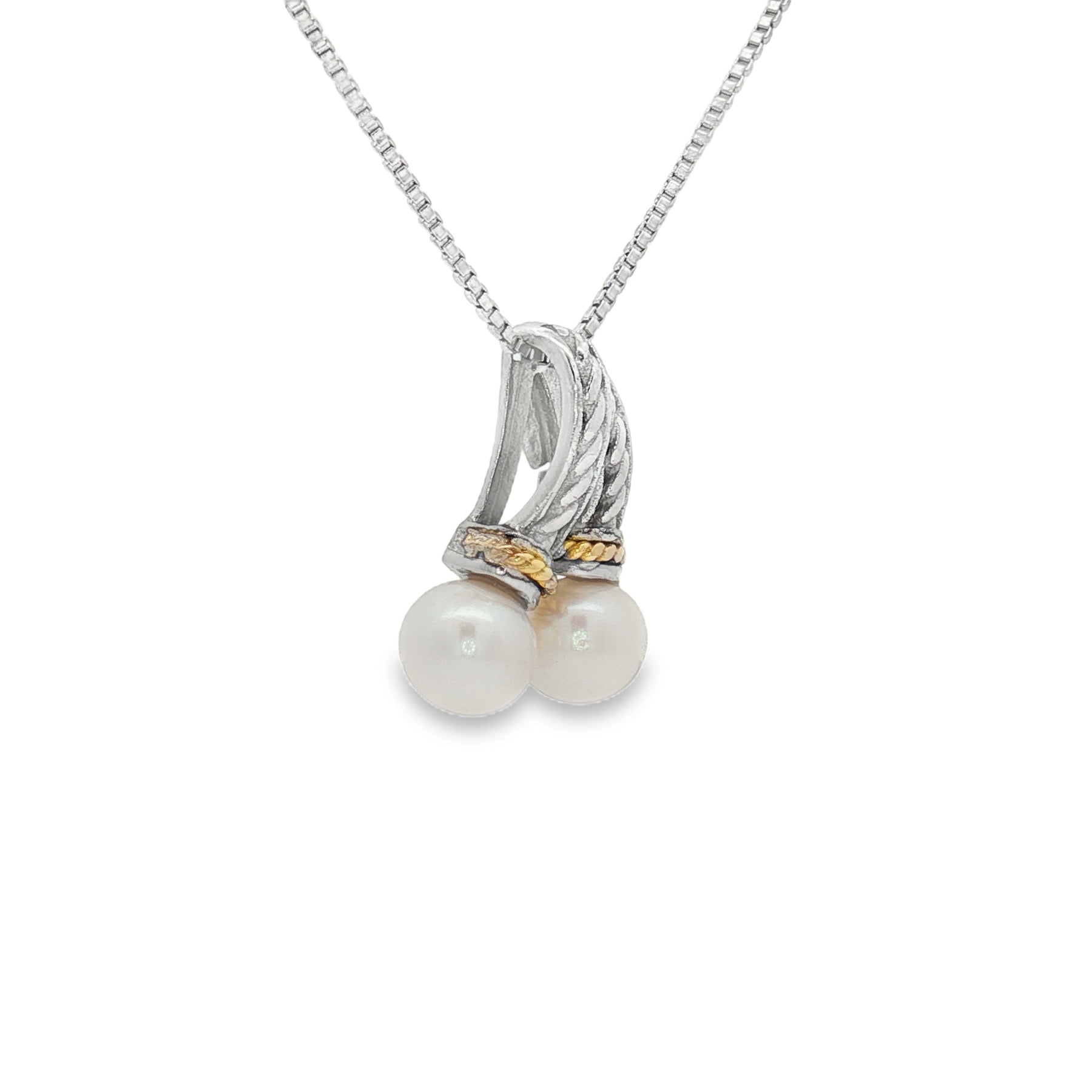 A timeless design blending elegance with sophistication, this pendant showcases the natural beauty of pearls with intricate silver and gold detailing. Crafted in sterling silver and accented with 18K yellow gold, it features two luminous pearls set gracefully beneath a detailed bail. The pendant is suspended from an 18" chain secured with a spring ring clasp.