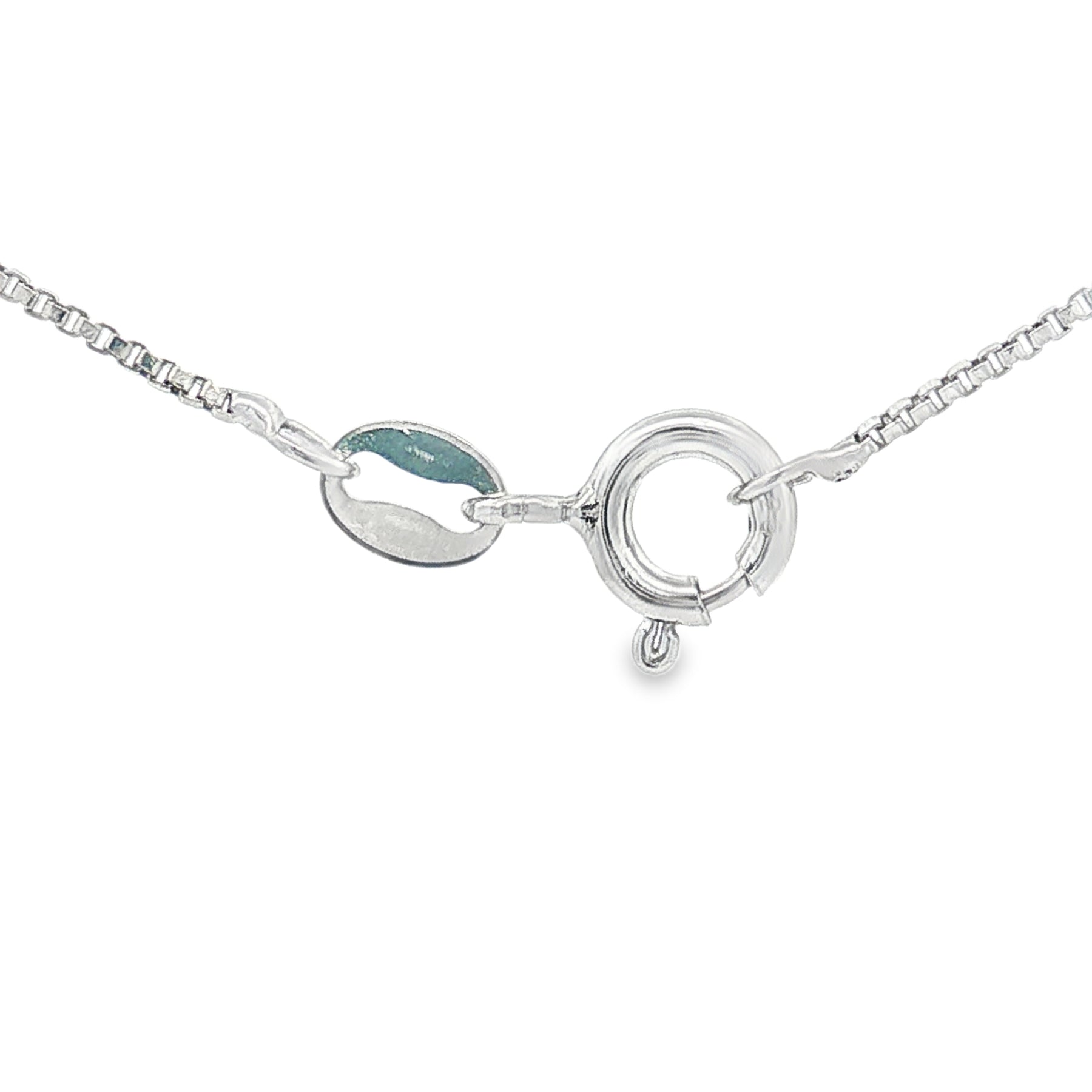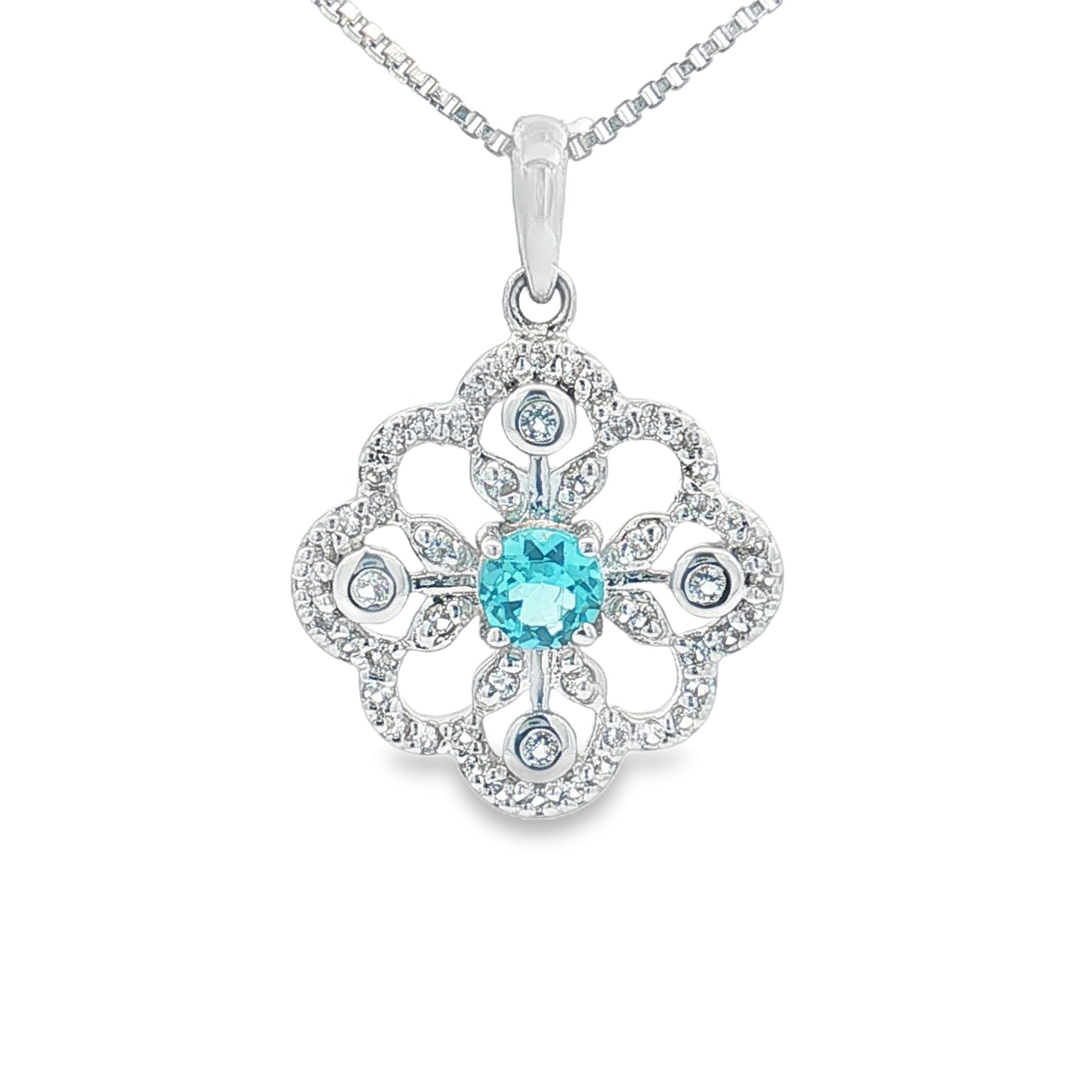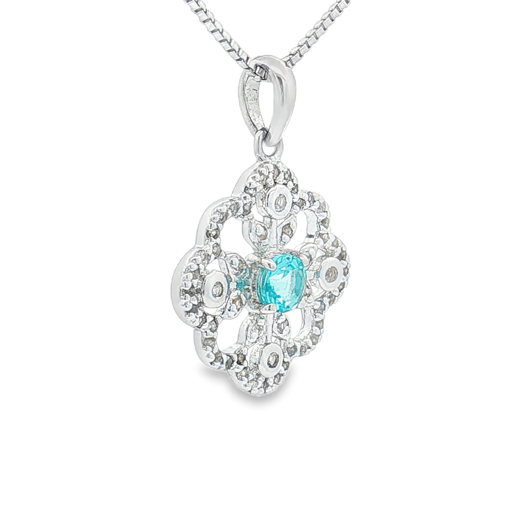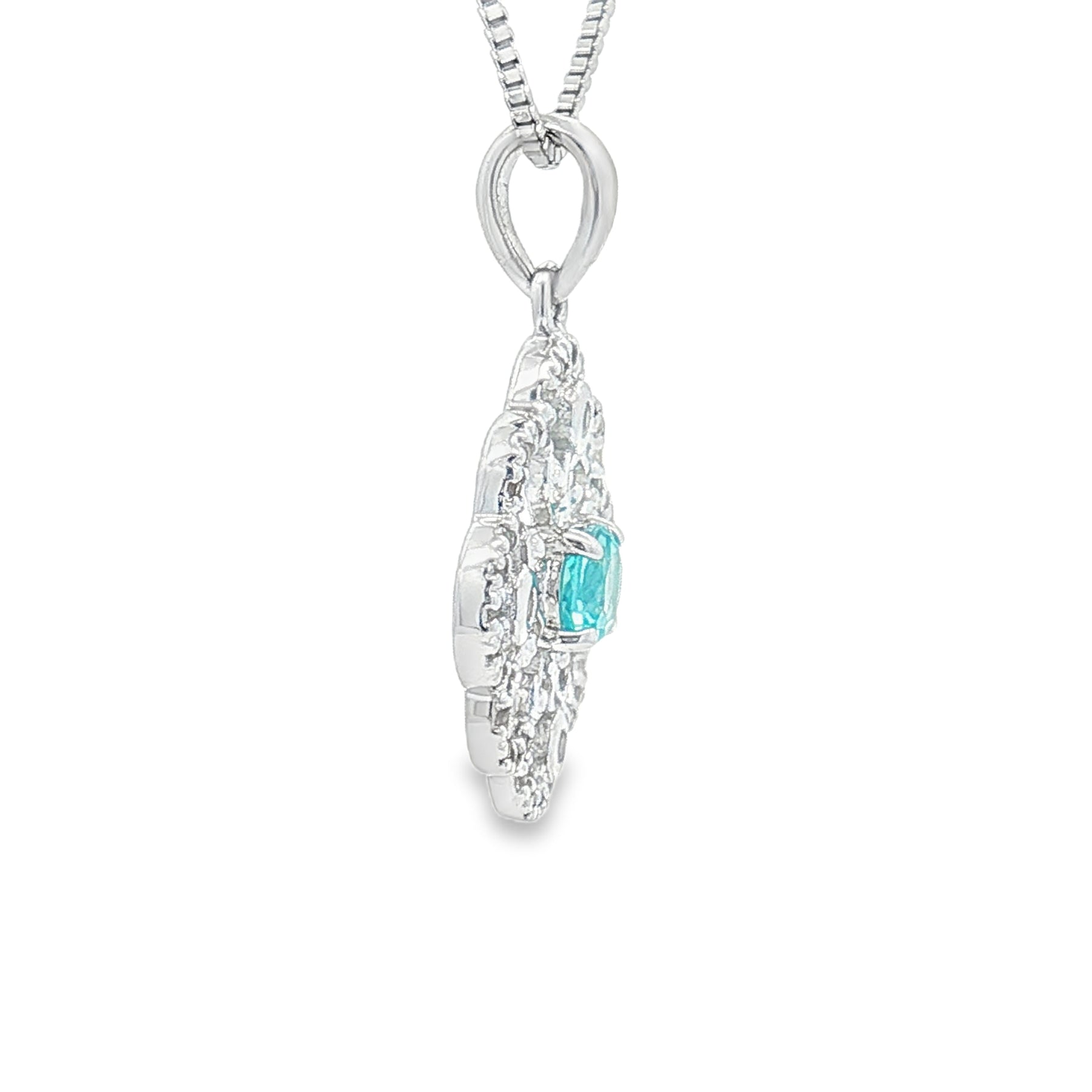 This elegant sterling silver pendant features a brilliant .95ct lab-grown Paraiba garnet at its center, surrounded by an ornate, vintage-inspired openwork design. Accented with shimmering white stones for added sparkle, the cool blue center stone delivers a vibrant pop of color. Completed with an 18" chain and secure spring ring clasp, this piece brings a refined, timeless beauty to any collection.