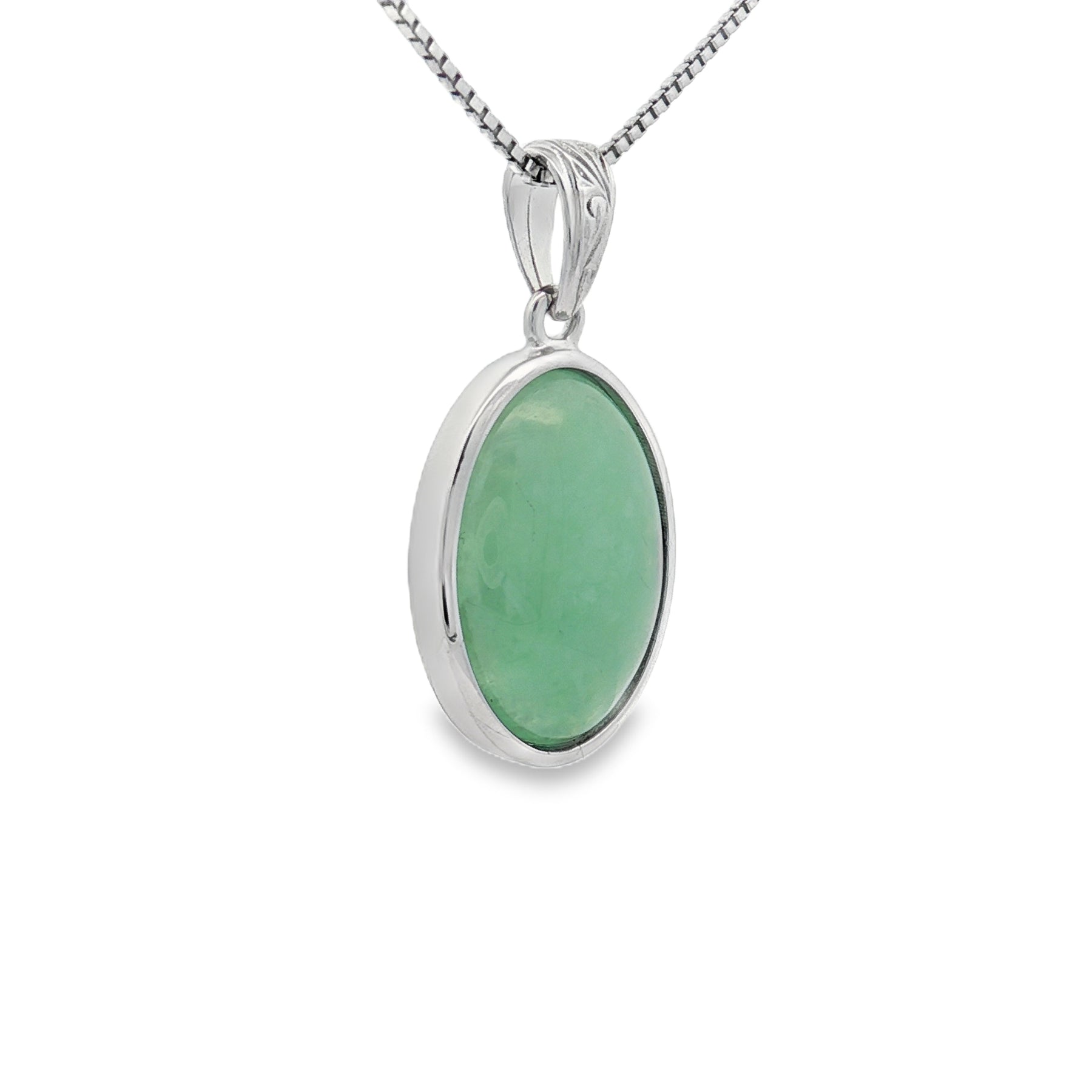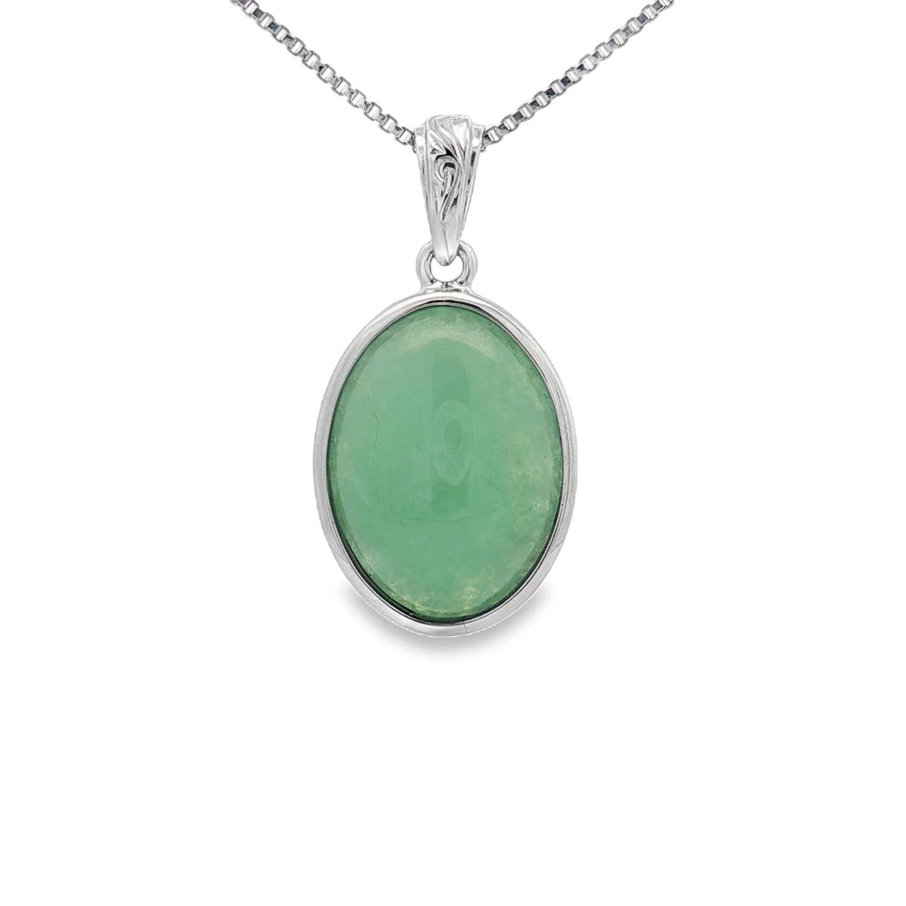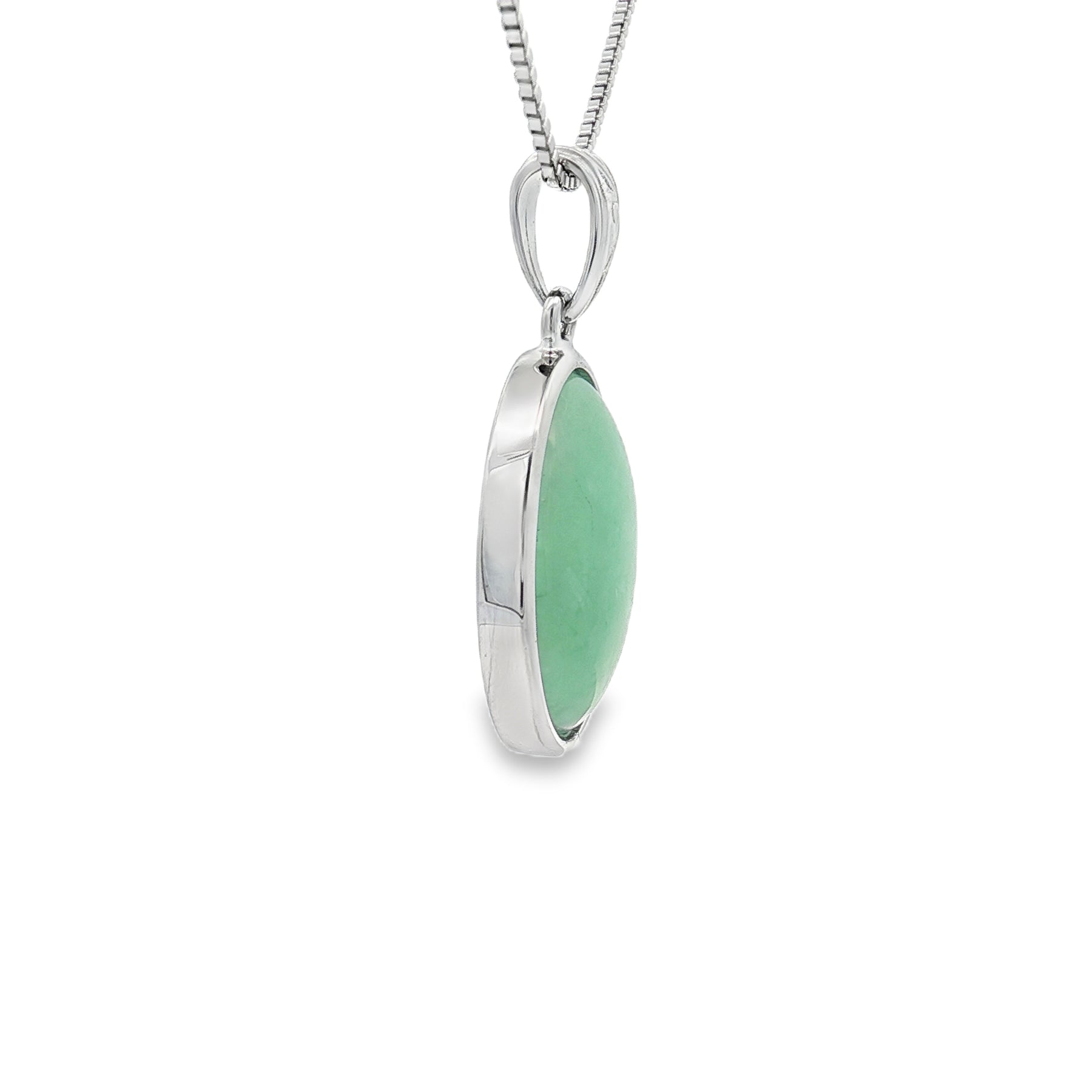 Bring natural beauty and timeless charm to your collection with this sterling silver jade pendant. Featuring a polished oval jade cabochon, the pendant rests in a simple silver bezel that enhances the stoneโs rich green tones. Suspended from an 18" chain with a spring ring clasp, itโs a versatile piece perfect for both everyday wear and special occasions.