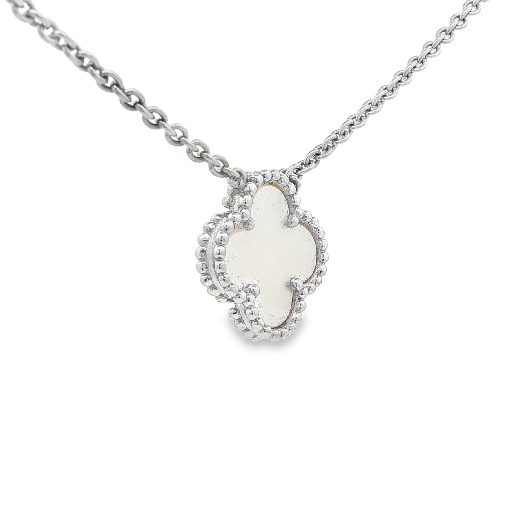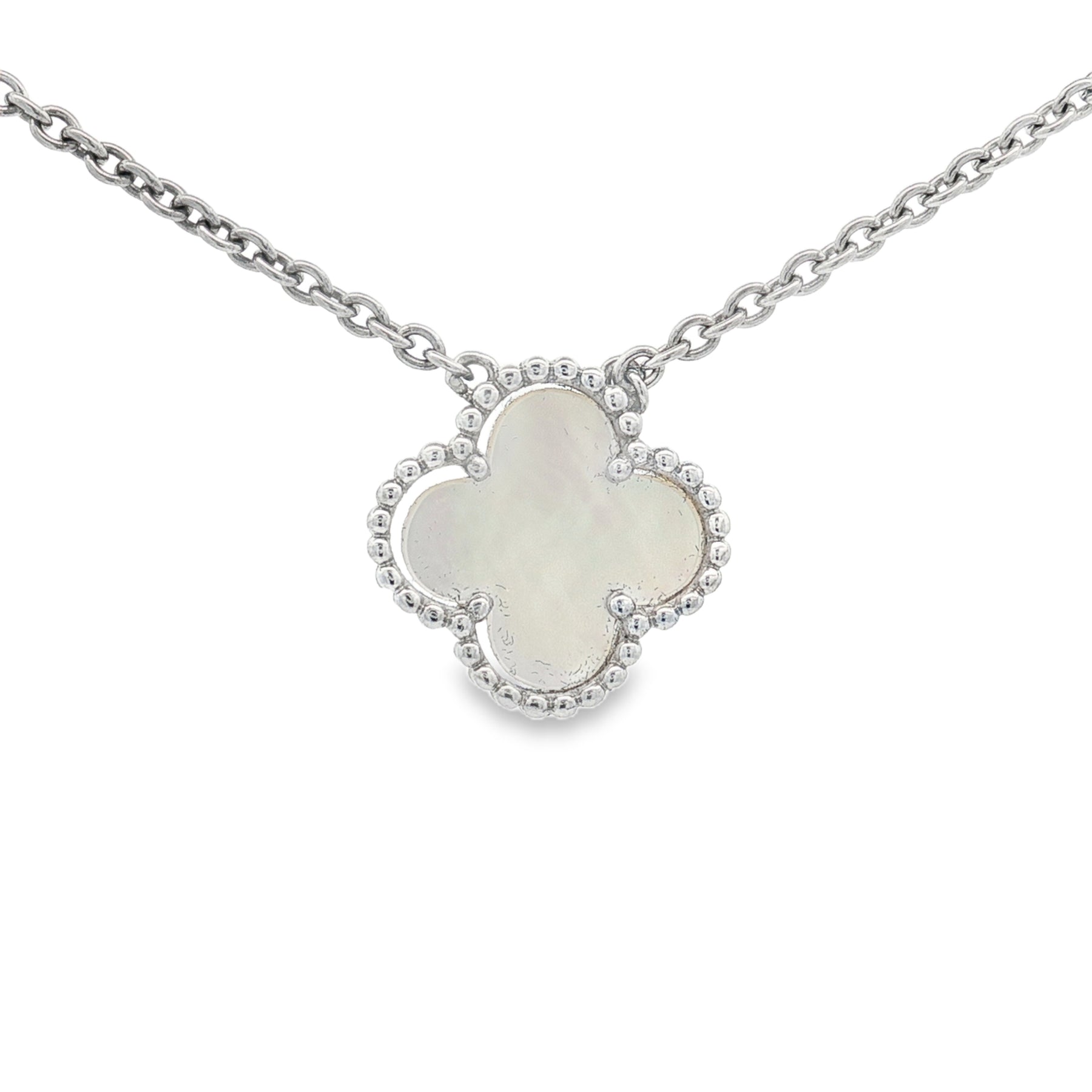 This elegant 18-inch sterling silver necklace features a luminous mother of pearl clover pendant, symbolizing harmony and timeless grace. The iridescent surface reflects soft shades of white and cream, creating a natural shimmer that complements any skin tone.