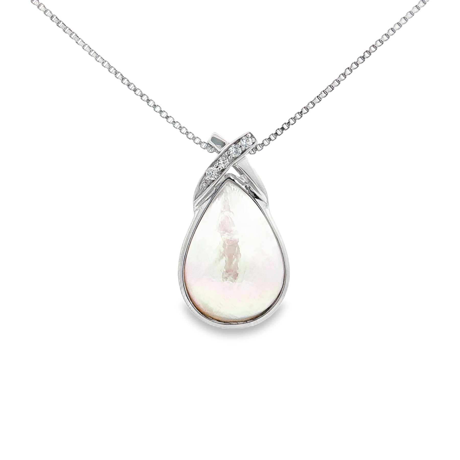 Classic elegance meets modern sparkle in this sterling silver pendant. A luminous pearl, gracefully shaped into a teardrop design, is accented with brilliant cubic zirconia set in an elegant crossover detail. Suspended from an 18" chain with a spring ring clasp, this pendant offers timeless sophistication for any occasion.