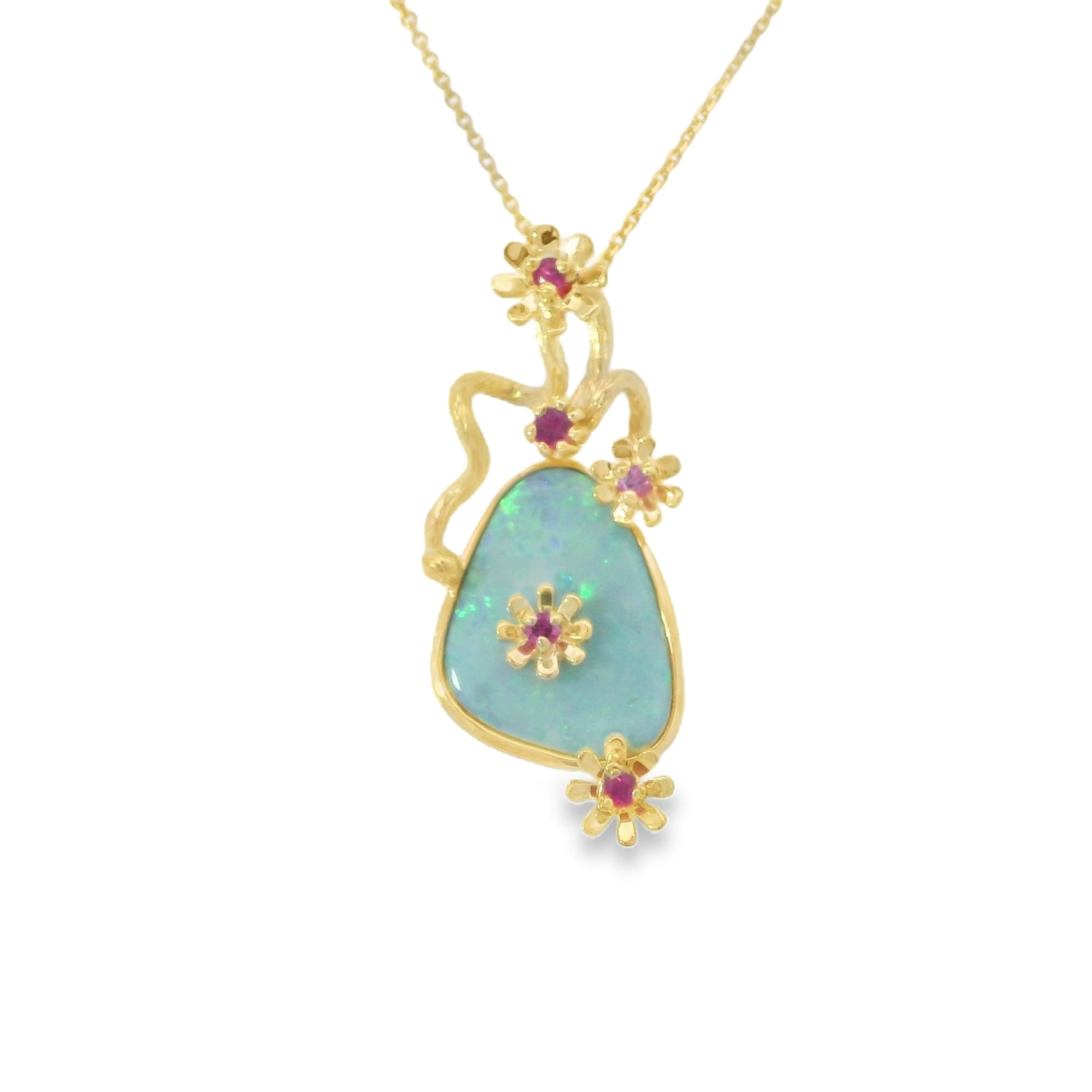 Embrace the beauty of nature with this exquisite boulder opal pendant. The centerpiece is a stunning boulder opal, radiating vibrant flashes of color, encased in a floral-inspired 14K gold setting. Surrounding the opal are delicate flowers adorned with brilliant rubies, adding a touch of elegance and charm. This pendant hangs gracefully on an 18" diamond-cut cable chain, providing a shimmering finish to this artistic piece. Perfect for anyone who appreciates unique, handcrafted jewelry that celebrates the beauty of gemstones and nature's inspiration.
