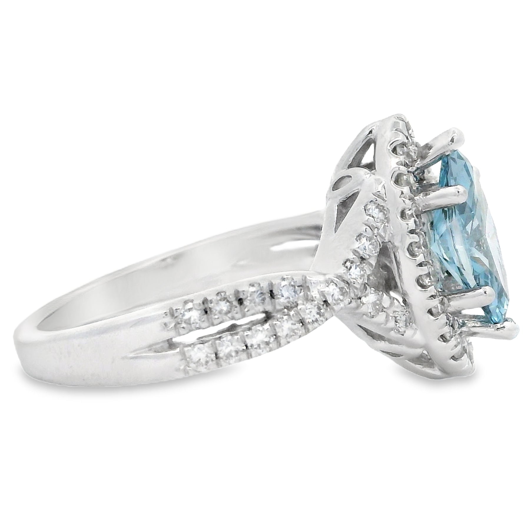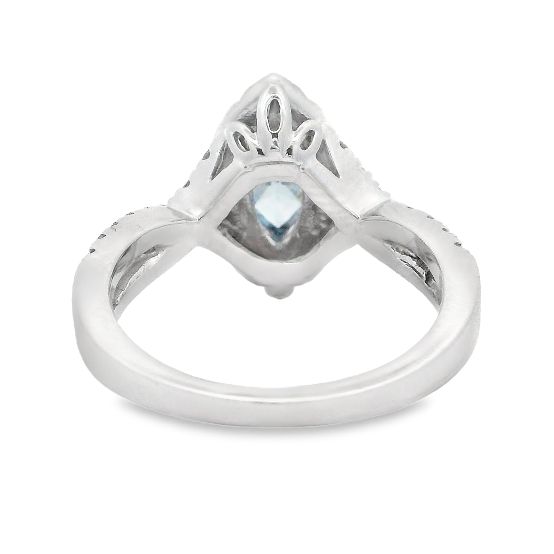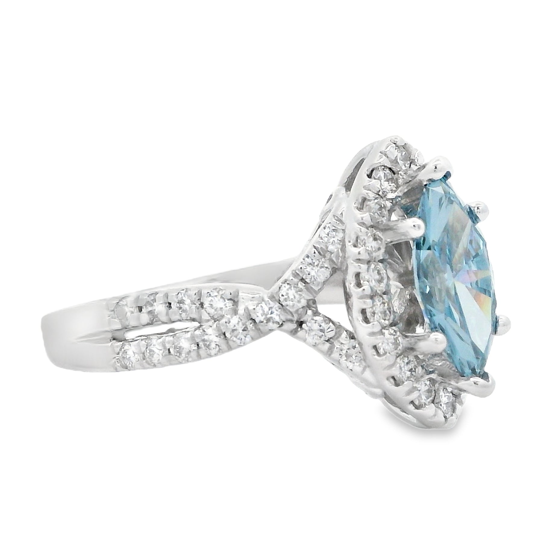 This stunning 14K white gold ring features a 1.01 carat fancy vivid blue lab grown diamond with VVS2 clarity as its centerpiece. Wrapped in a halo of sparkling white mined diamonds and set in a split shank design, this ring delivers dramatic brilliance from every angle. Finger size 7. Use our web chat or text us at 937-898-8670 for sizing options.