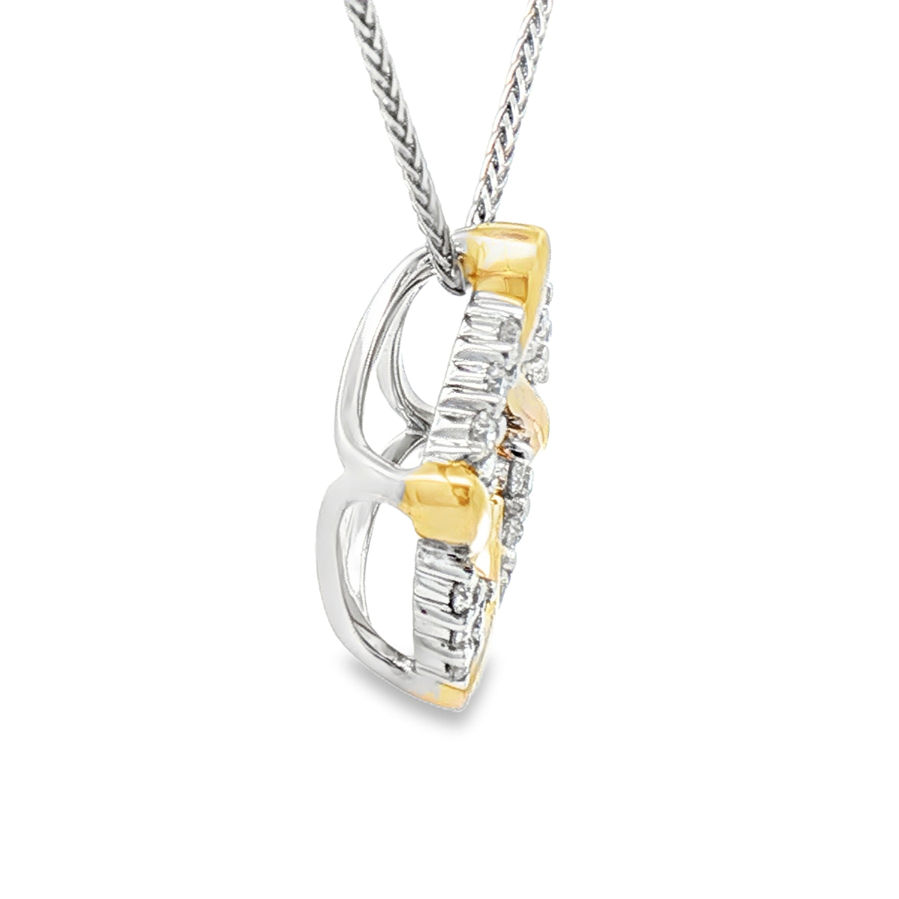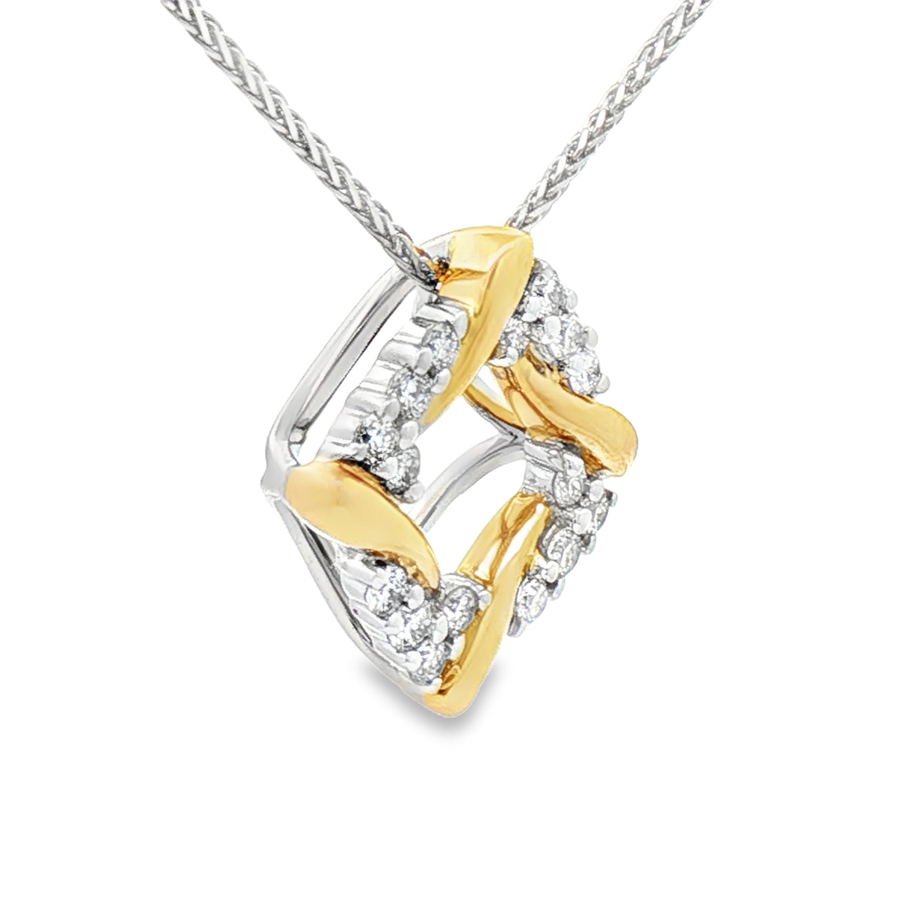 This elegant pendant is crafted in 14K yellow and white gold and features .2ct total weight of natural diamonds, graded G color and SI2 clarity. The open square design blends polished yellow gold accents with shimmering diamond-set white gold, creating a modern yet timeless look. The pendant is suspended from an 18" chain with a lobster clasp for secure, comfortable wear.
