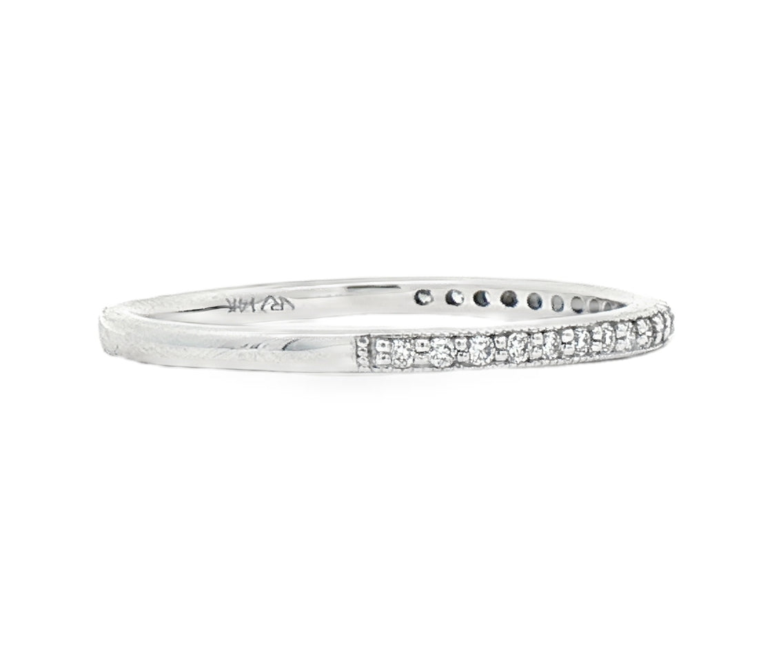 Classic and refined. This slim 14K white gold diamond band is the perfect everyday piece or stacking ring. Set with .1 carats total weight of natural diamonds, it delivers subtle sparkle and timeless style. Whether worn as a wedding band, anniversary ring, or stacked with other favorites, itβs a versatile treasure made to last.