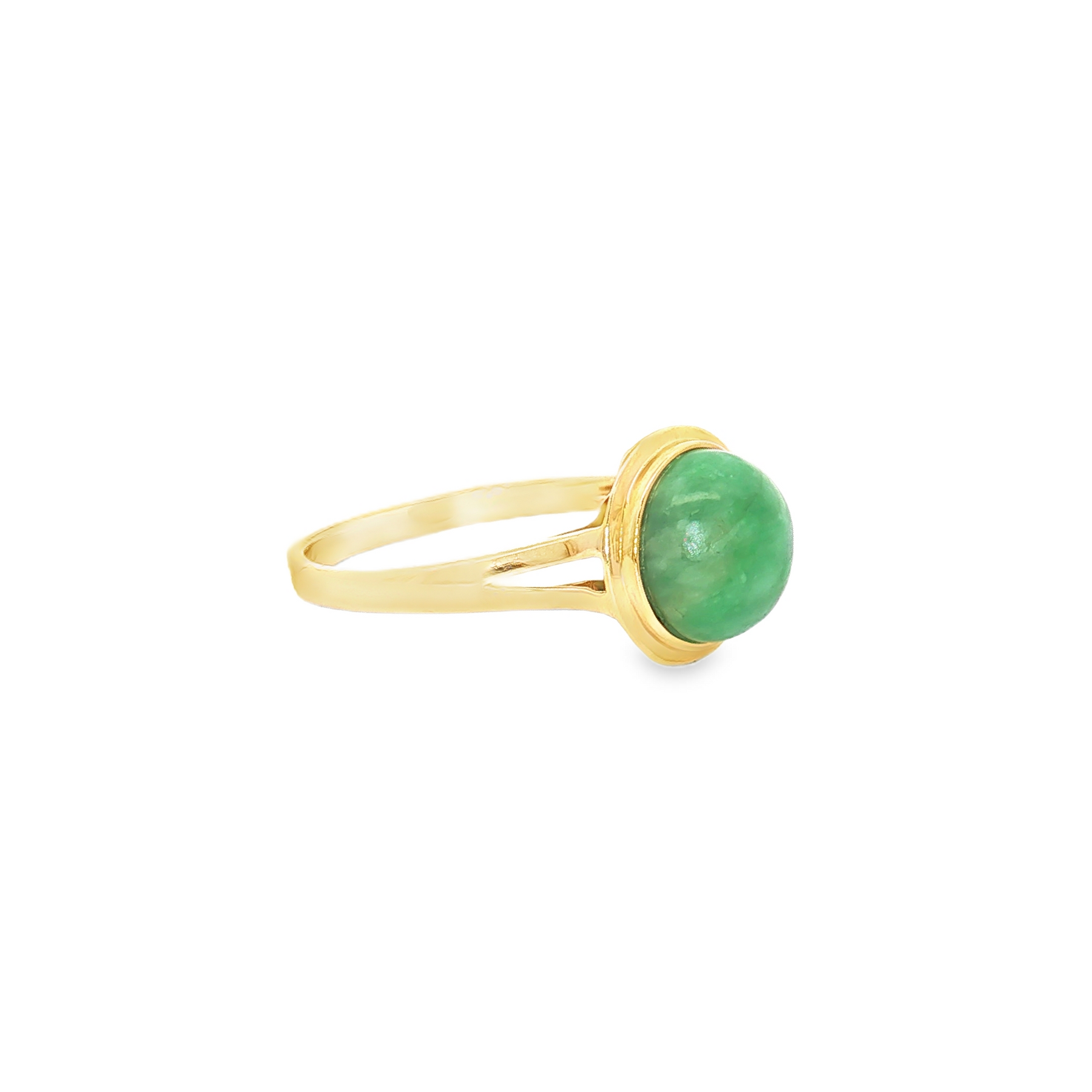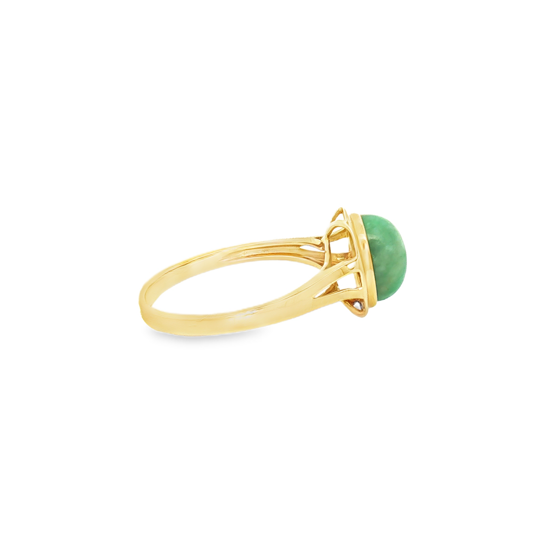 A striking design with natural elegance — this 14K yellow gold ring showcases a smooth 1.90ct jade cabochon in a bold bezel setting. The vibrant green hue of the jade pairs beautifully with the warm yellow gold, creating a timeless ring that exudes both serenity and strength.