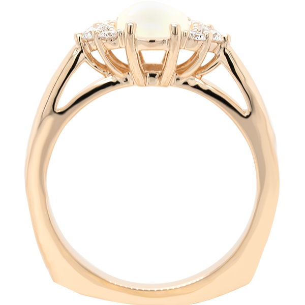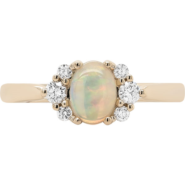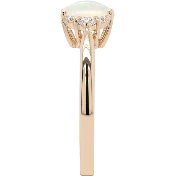 This glowing design features a .53ct Ethiopian opal with rich play-of-color, set in 14K yellow gold and framed by a dazzling .18ctw of natural round diamonds. The asymmetrical diamond clusters add modern sparkle to this vintage-inspired silhouette—perfect for those who love unique gemstone rings with a touch of elegance.