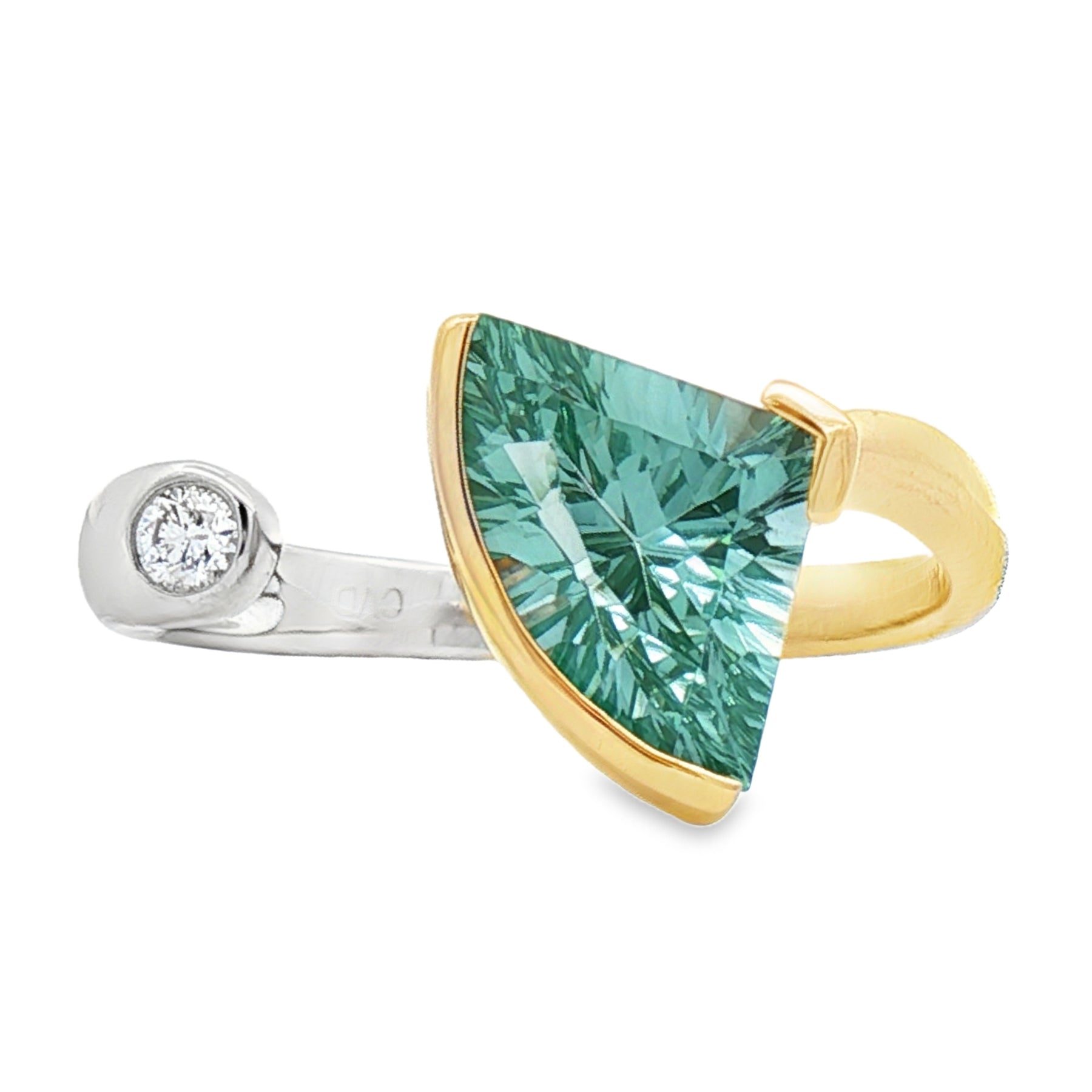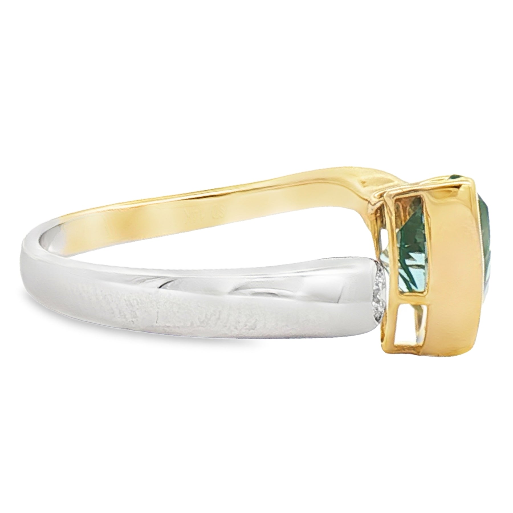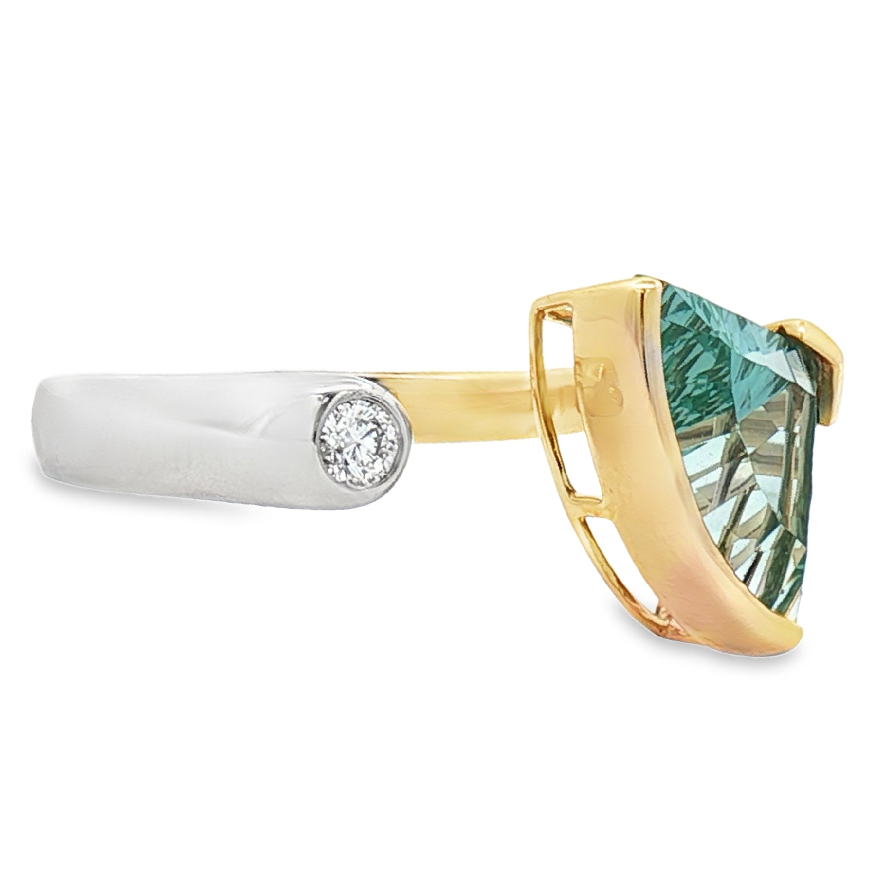 Crafted in 14K yellow and white gold, this striking ring features a 2.8 carat green sapphire accented by .06 carats total weight of diamonds. The bold trillion-cut center stone is framed in yellow gold, while a white gold diamond accent adds contrast and sparkle. Ring size 8.25.