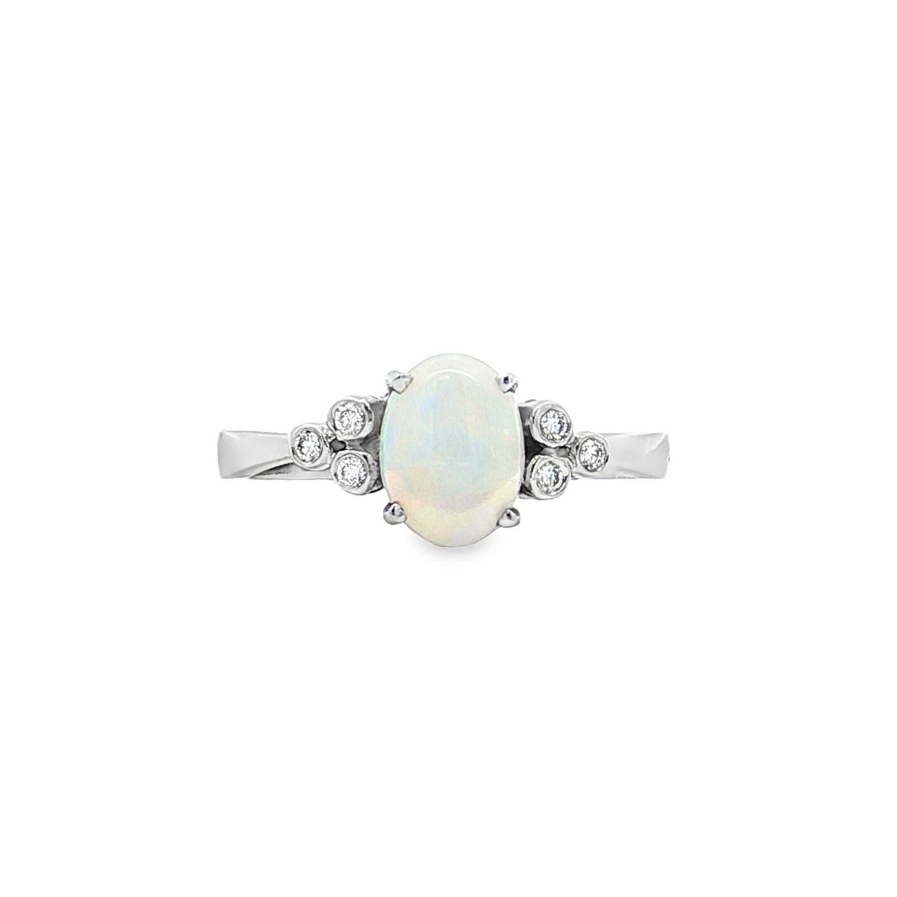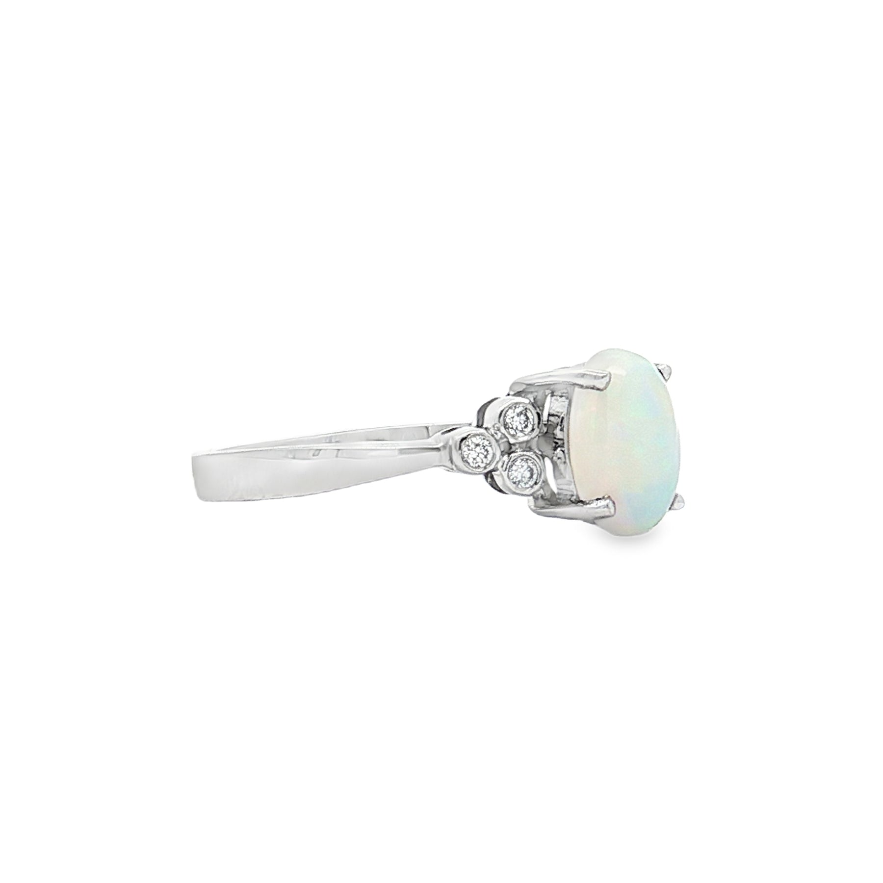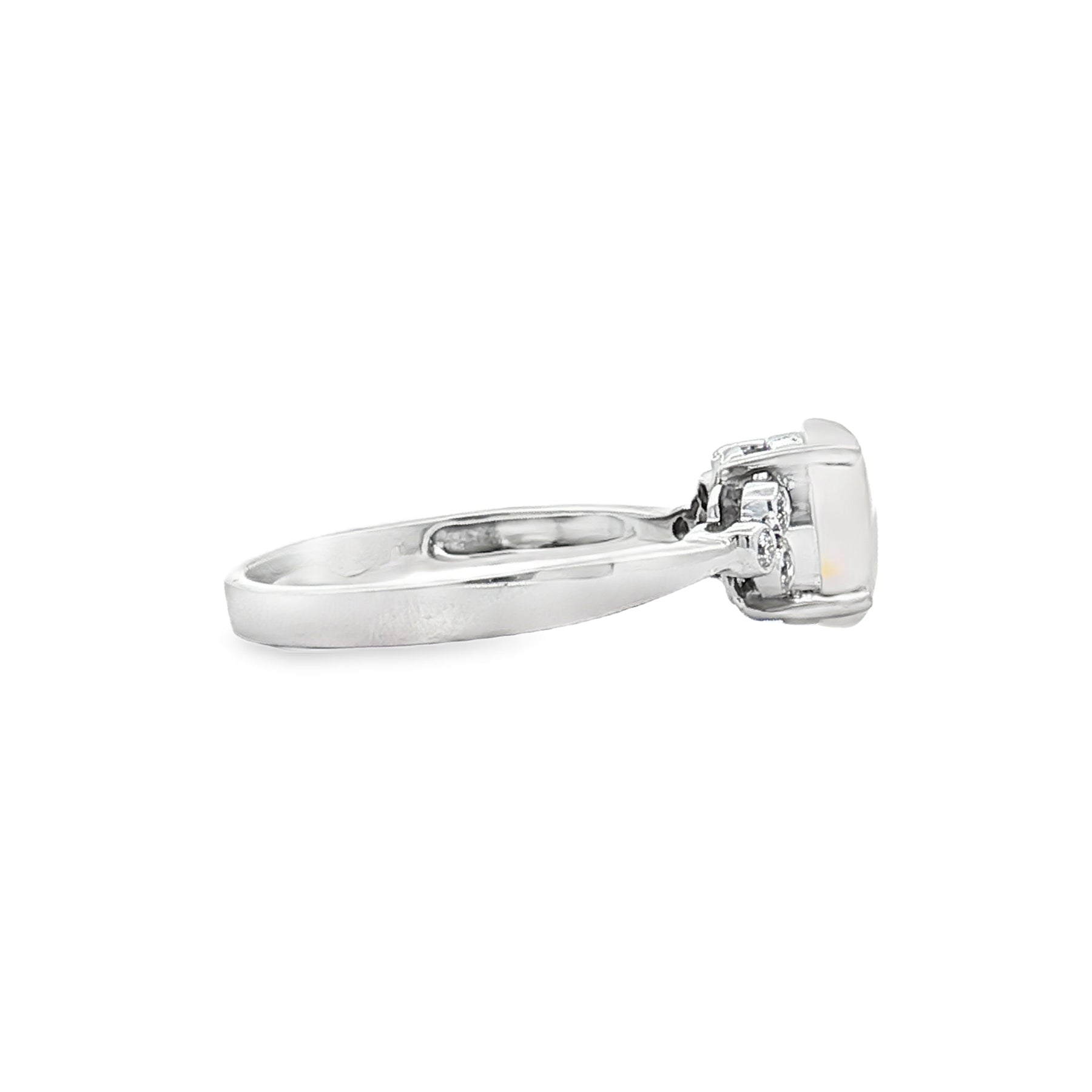 A luminous beauty that dances with color, this ring features a glowing opal at its heart, accented by sparkling diamonds on each side. Crafted in 14k white gold, the design blends timeless elegance with a touch of artistry.