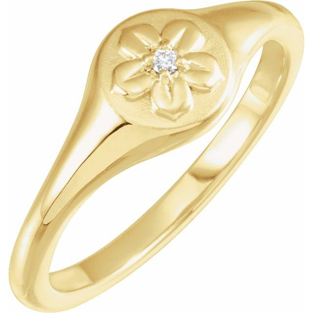 This 14K yellow gold ring features a delicate floral design centered with a genuine .02 carat diamond. The polished gold petals create a soft, organic look while the diamond adds a subtle touch of sparkle. Crafted in solid 14K gold and sized at 7, this ring is perfect for everyday wear or as a meaningful accent piece. The diamond is a natural, earth-mined stone, offering timeless beauty in a minimalist setting.