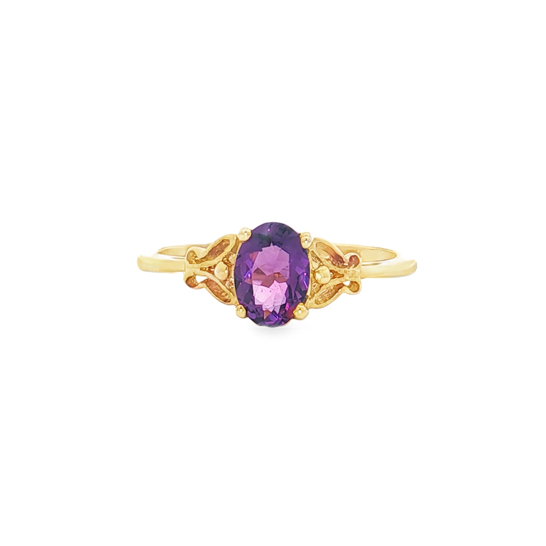 A regal touch of color meets timeless gold in this beautiful amethyst ring. Crafted in 14K yellow gold, the intricate detailing on the shoulders enhances the rich purple brilliance of the .8ct oval-cut amethyst. This ring balances elegance with a unique, vintage-inspired design, making it perfect for both everyday wear and special occasions.