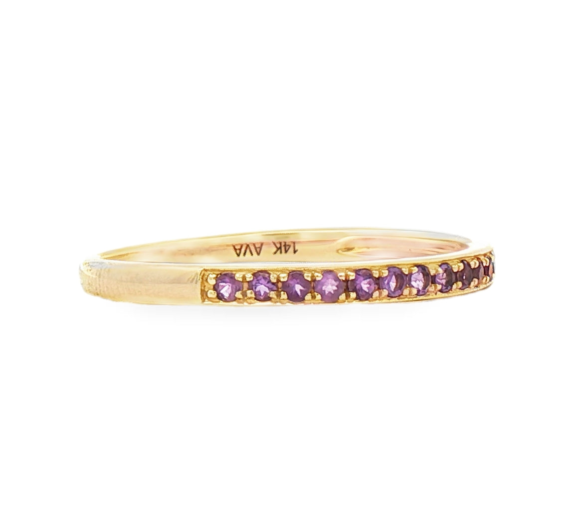 This refined 14K yellow gold band is accented with a row of round-cut amethyst gemstones, offering rich purple color in a sleek, elegant design. The vibrant amethysts are neatly set along the top of the band, creating a timeless look thatβs perfect for stacking or wearing on its own.