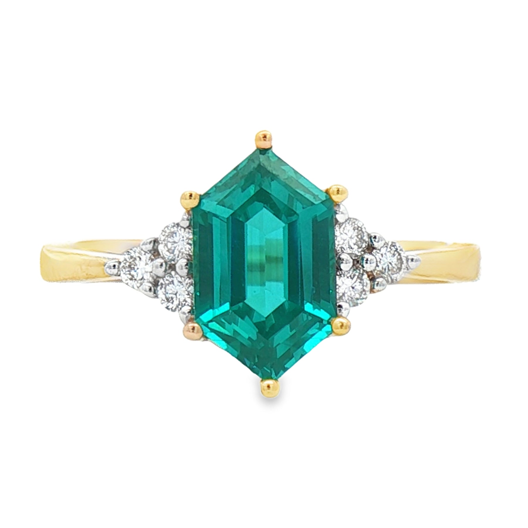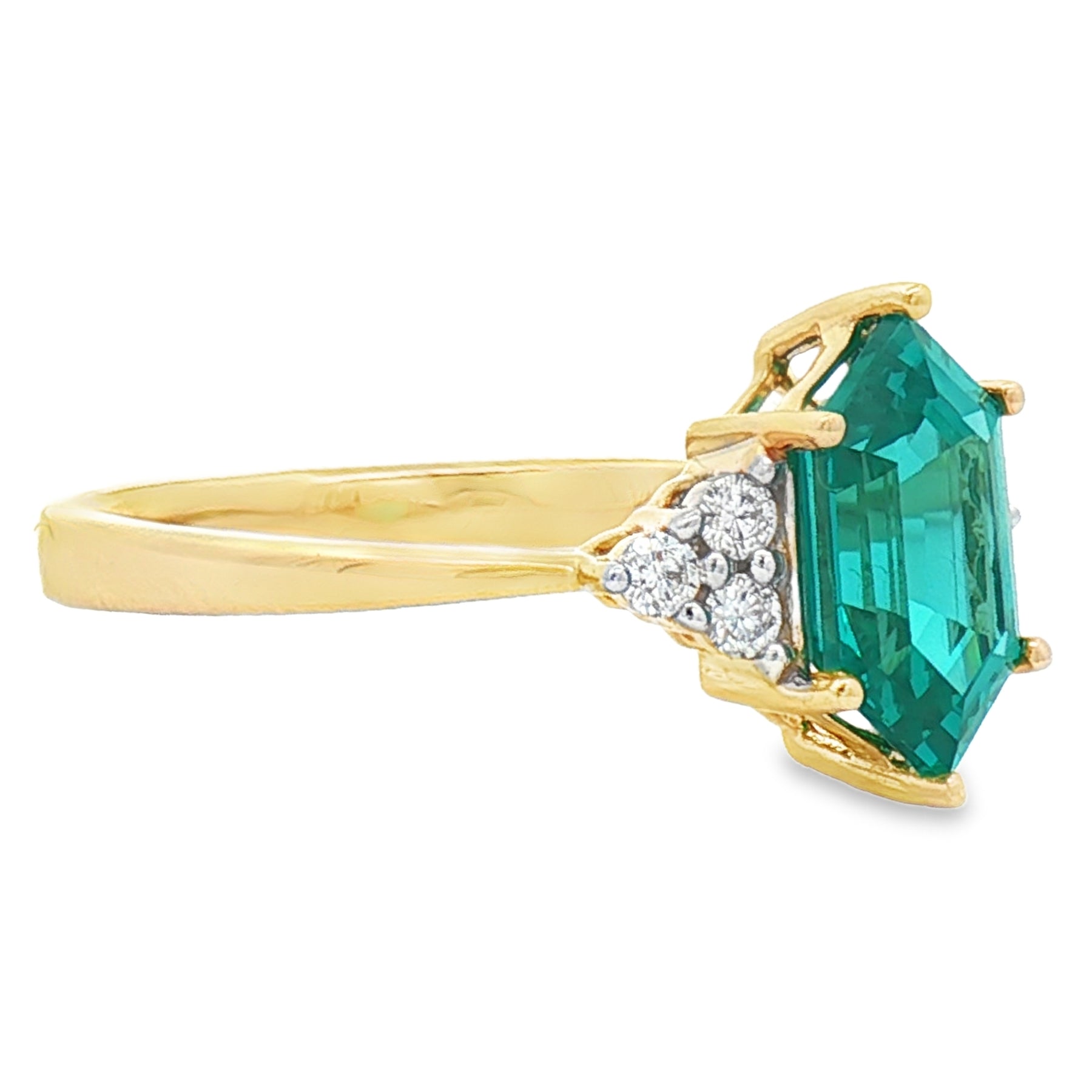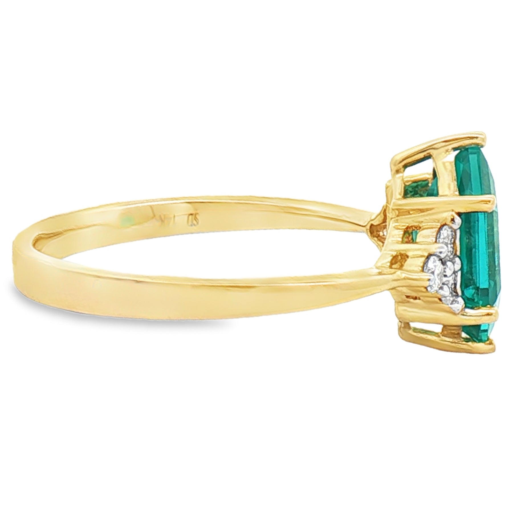 Crafted in 14K yellow gold, this ring features a striking 2.5 carat paraiba garnet center stone accented by .14 carats total weight of diamonds. The vibrant green emerald-cut garnet is framed by sparkling diamond clusters on each side, creating a bold yet elegant design. Ring size 7.5.