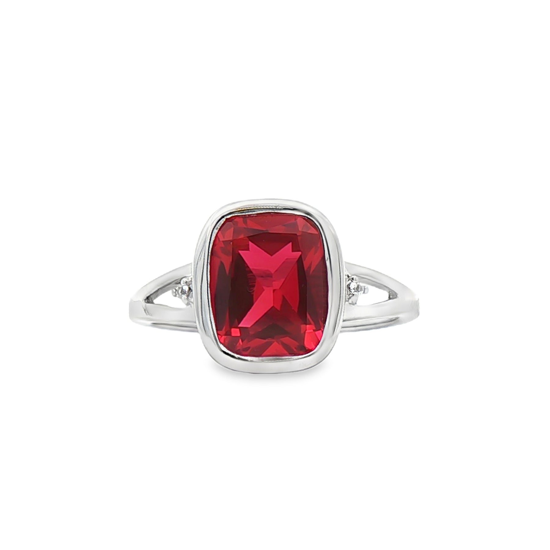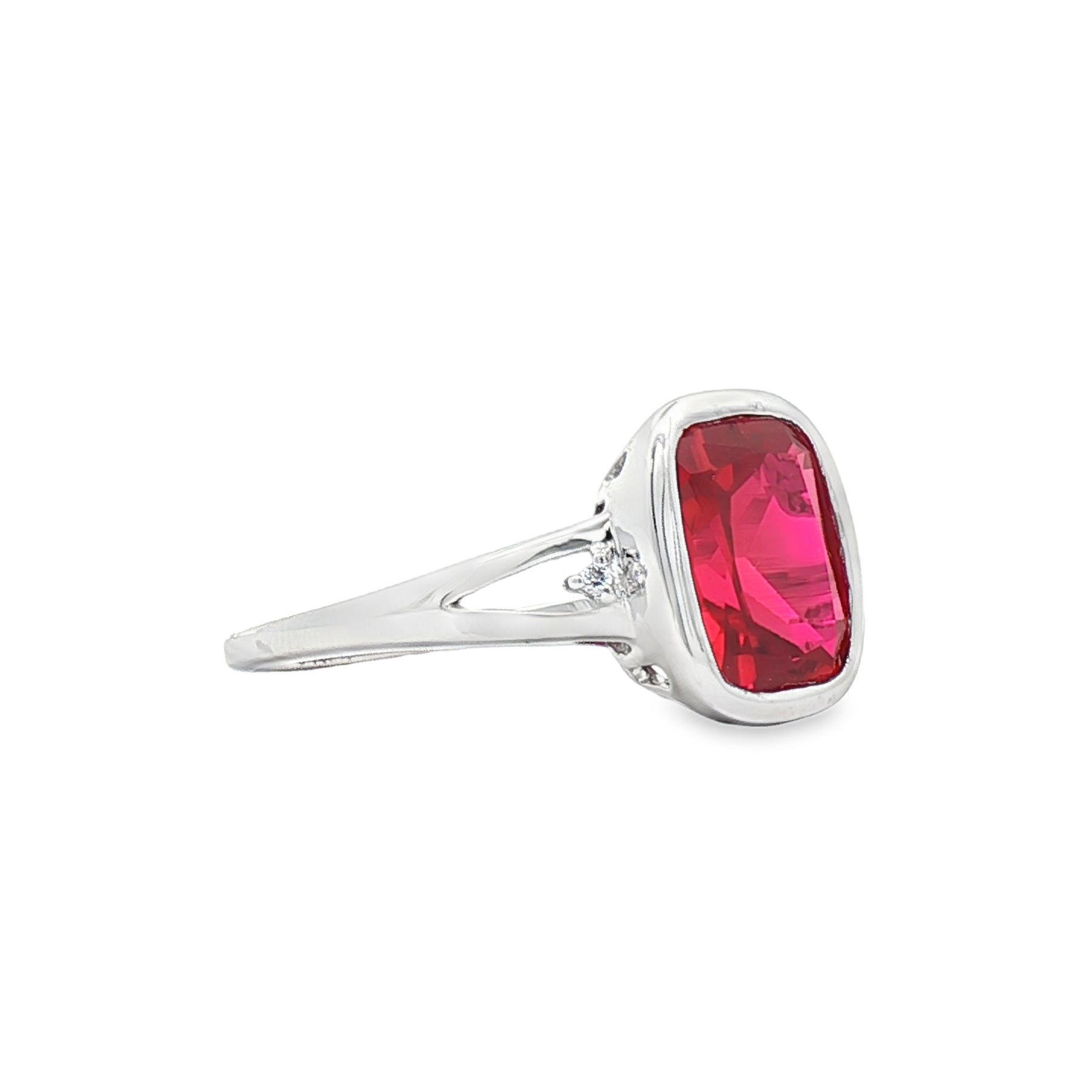This ring is crafted in polished sterling silver and features a vibrant 3.2 carat lab-grown ruby at the center. The rectangular ruby displays rich red color and striking brilliance, framed in a smooth bezel-style setting for a clean, modern look. Subtle accent details along the band add dimension without distracting from the bold center stone. Sized at 7, this ring offers a refined statement with timeless appeal.