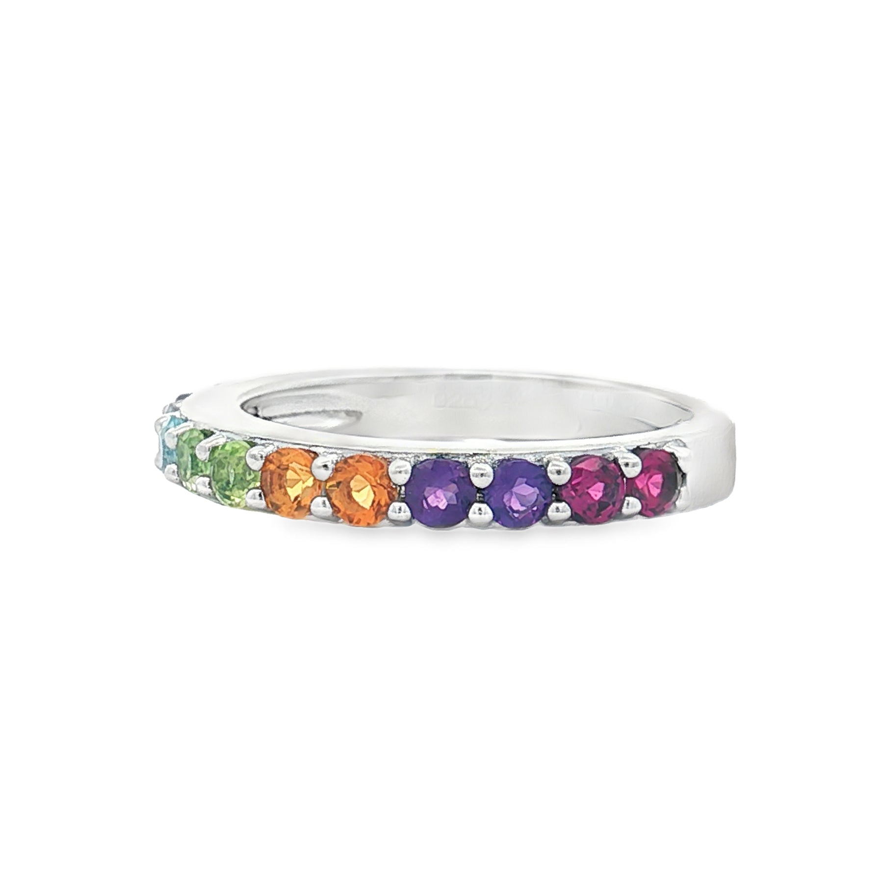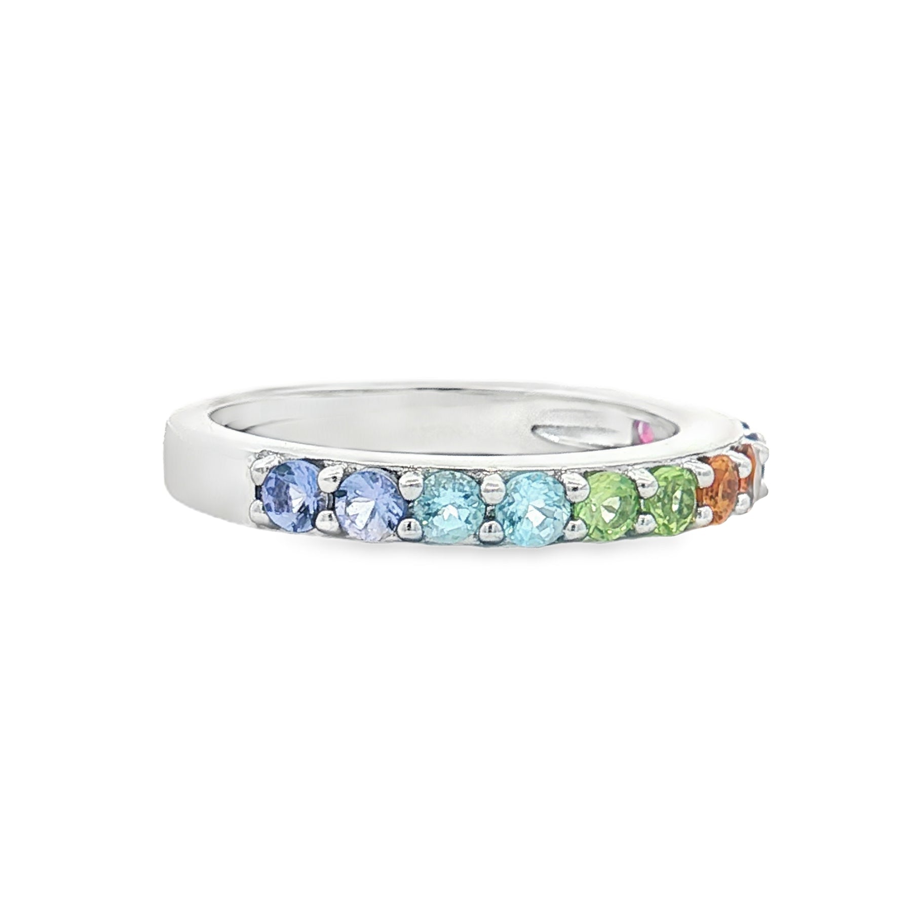 Celebrate color and elegance with this stunning sterling silver multi-gemstone ring, featuring a brilliant lineup of tanzanite, citrine, amethyst, garnet, peridot, and blue topaz. Each gemstone is round-cut and set in a sleek sterling silver band, creating a dazzling rainbow of hues that radiates joy and sophistication.