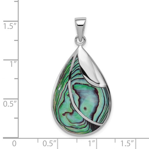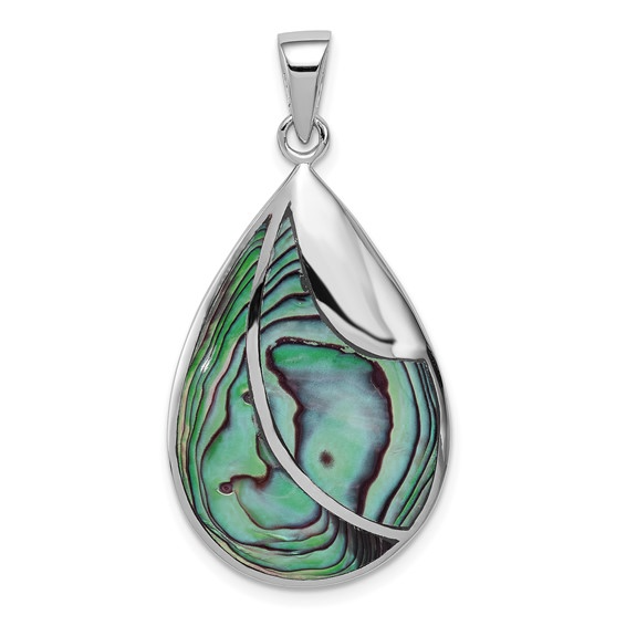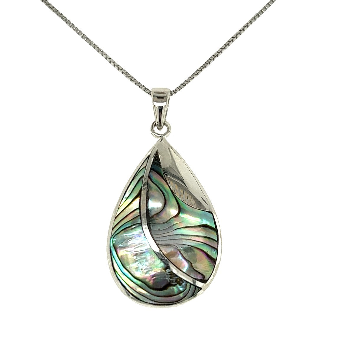 Infused with the mystery and movement of the sea, this striking teardrop necklace features genuine abalone shell inlaid in polished sterling silver. The vibrant iridescence of the shell—shifting between green, blue, violet, and deep ocean hues—is beautifully framed by sleek silver accents. Finished with rhodium plating for added brilliance and tarnish resistance, this piece is both naturally eye-catching and timeless in design. Suspended on an 18" sterling silver chain, it’s ready to wear or gift.