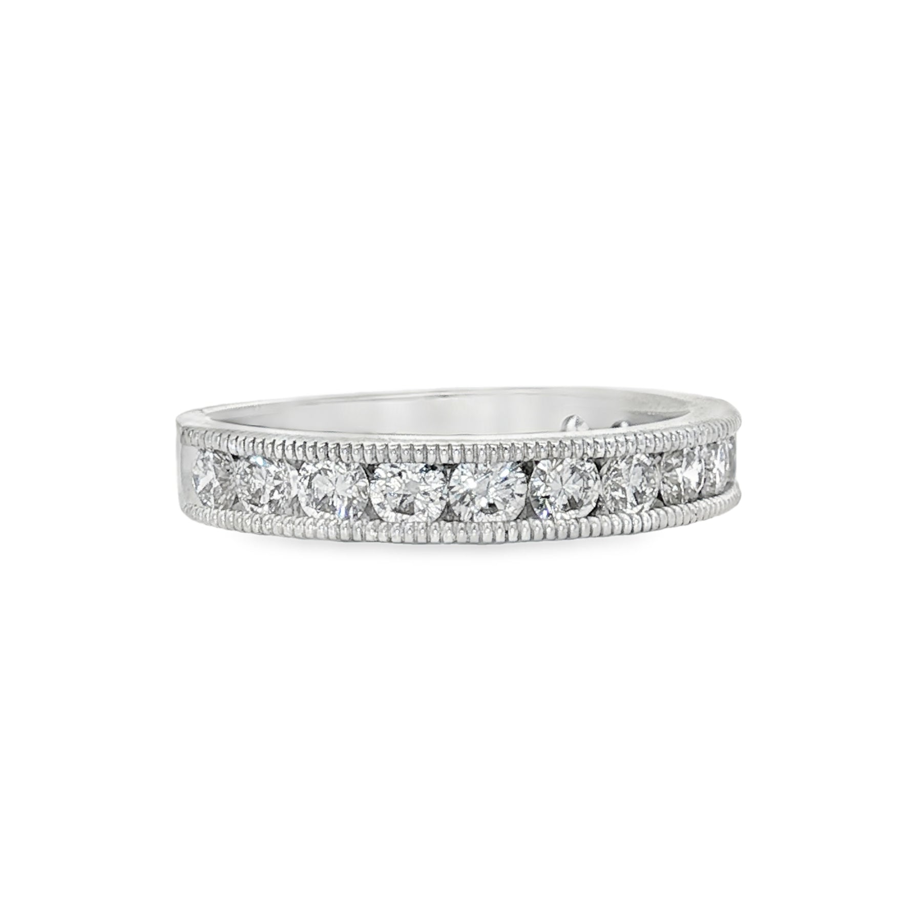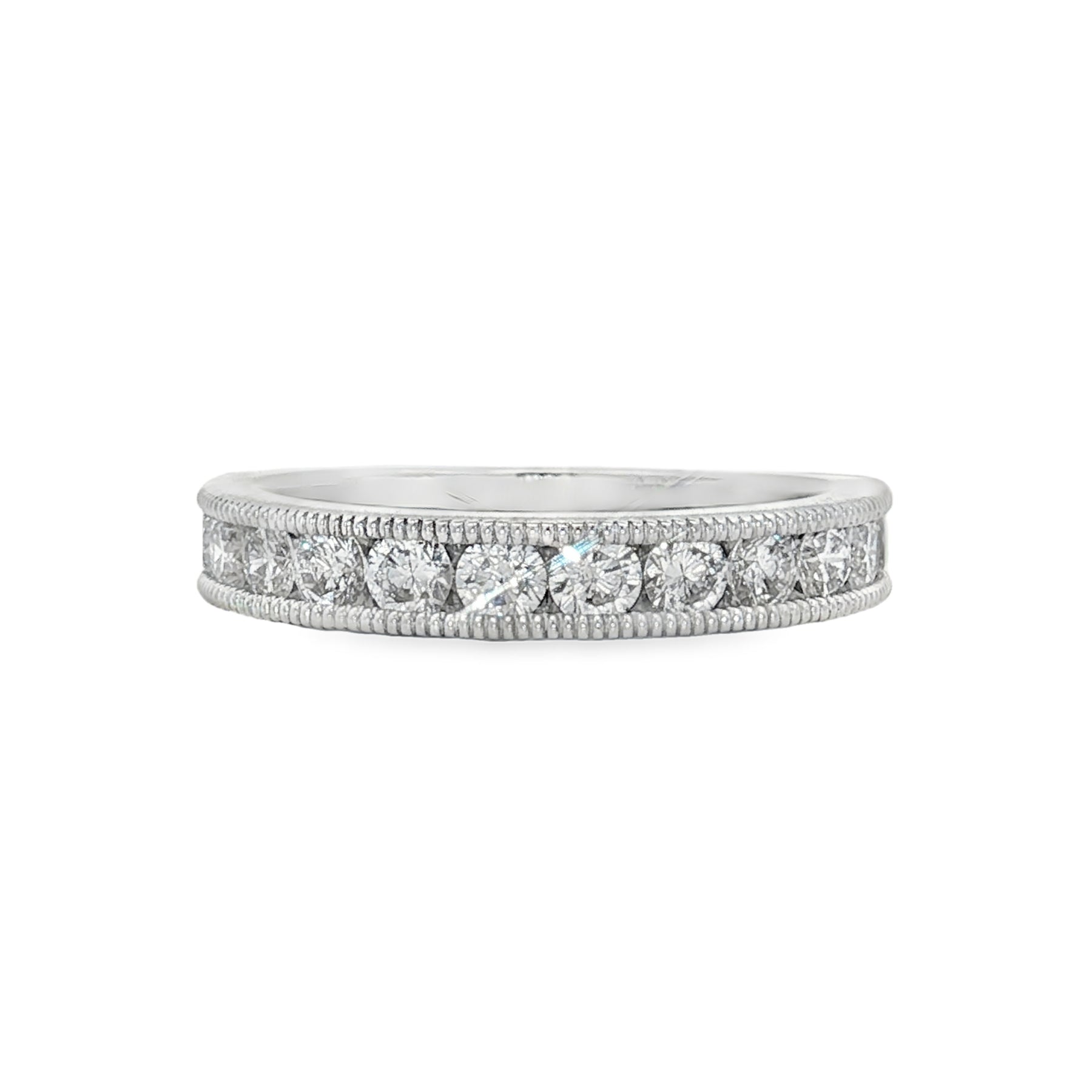 14K white gold 14 lab grown diamonds 1.00 carat total weight VS SI1 high low half round taper channel mill grain wedding band. size 7