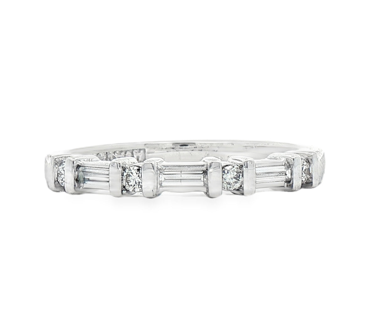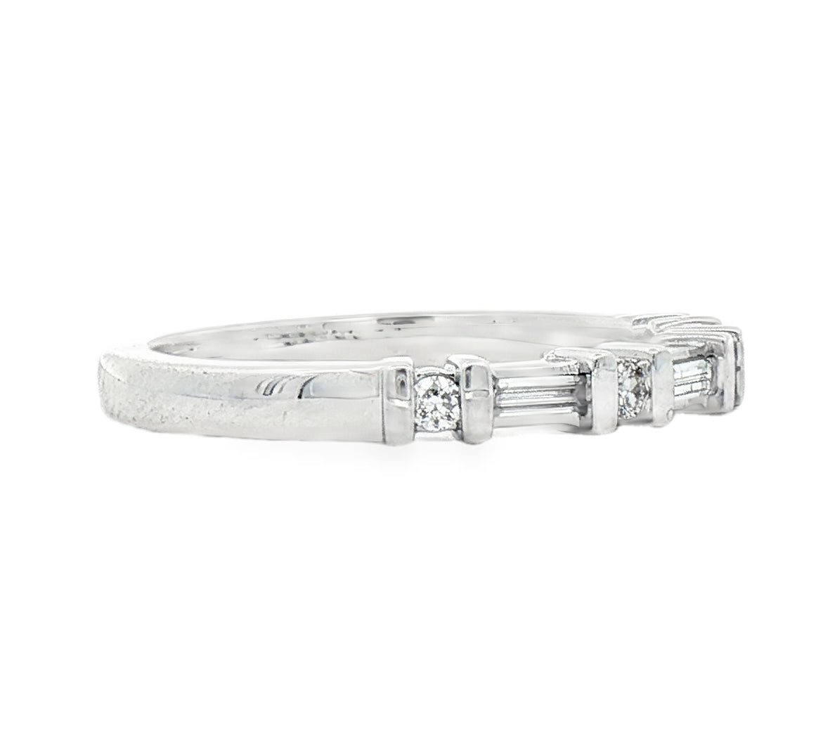 This 14K white gold wedding band features .55ct total weight of natural baguette-cut and round diamonds, offering a sleek, structured look with refined sparkle. The clean channel-style design highlights the geometric beauty of the baguette diamonds while maintaining a low-profile, comfortable fit. Ring size 6.5.