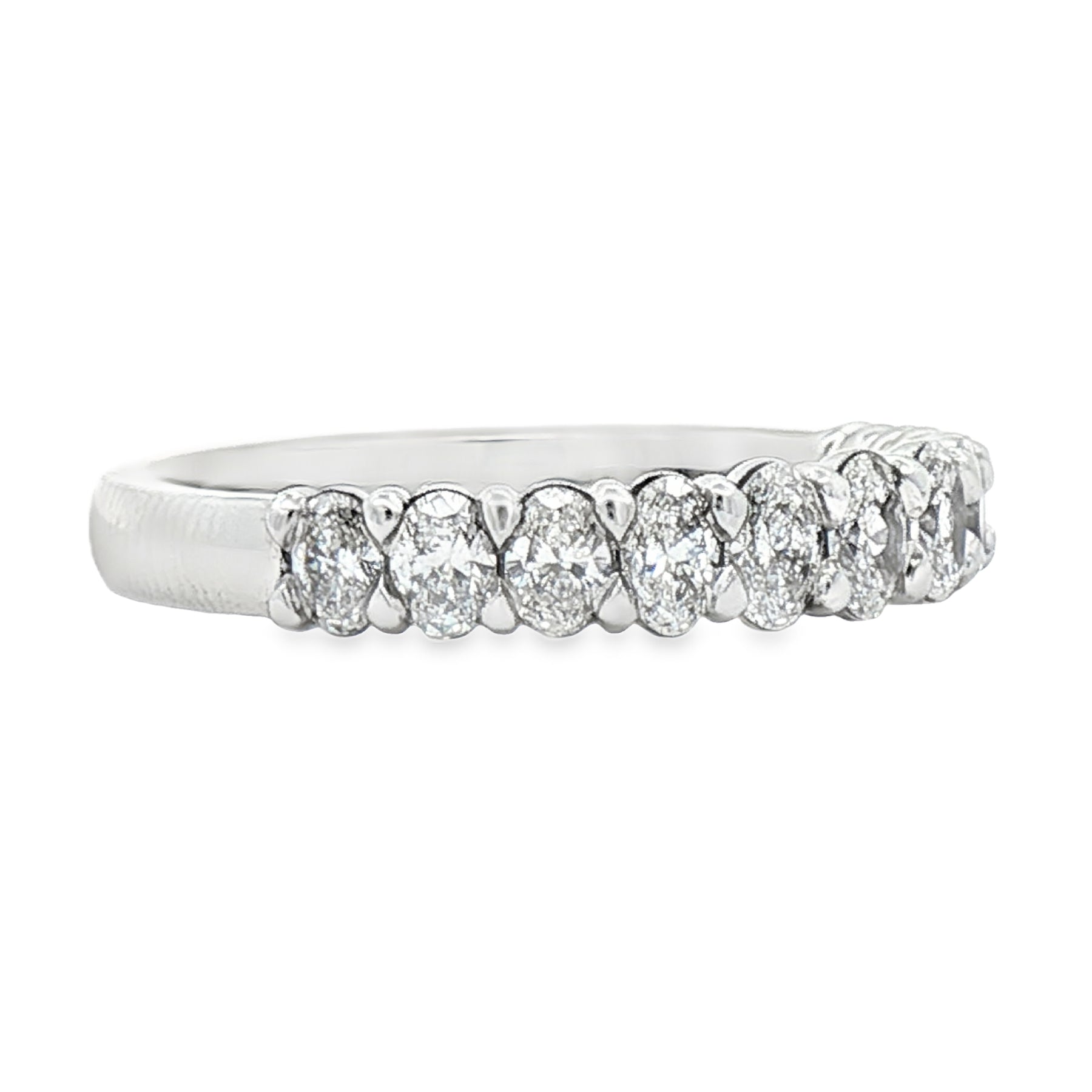 This elegant 14K white gold ring features .89 carats total weight of lab-grown oval cut diamonds, set in a continuous shared-prong band that delivers exceptional sparkle and refined symmetry. The oval diamonds create a soft, romantic look with brilliant light return, making this ring ideal as a wedding band, anniversary ring, or a stackable statement piece. Finished in polished 14K white gold and sized at 6.5, it offers timeless versatility and modern appeal.