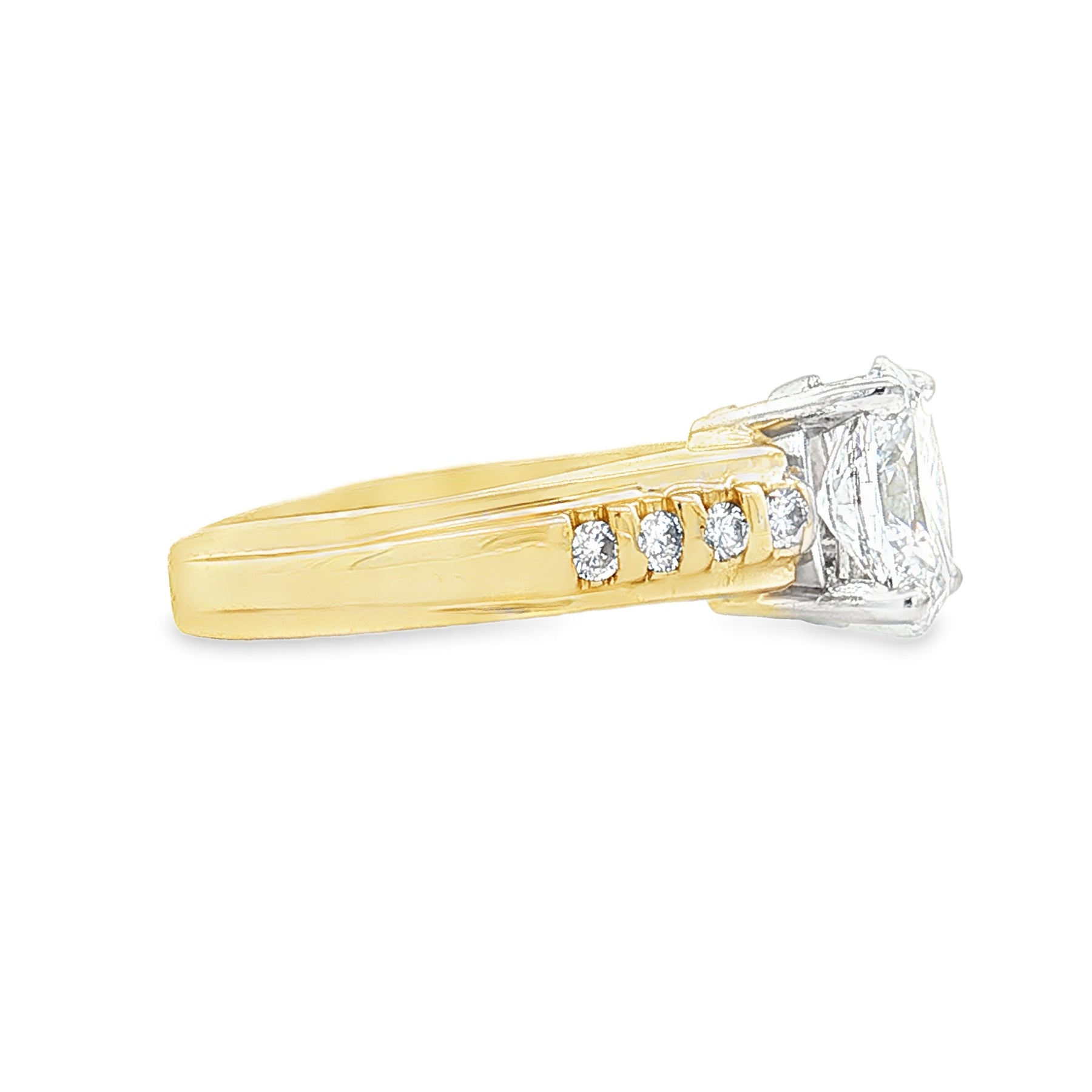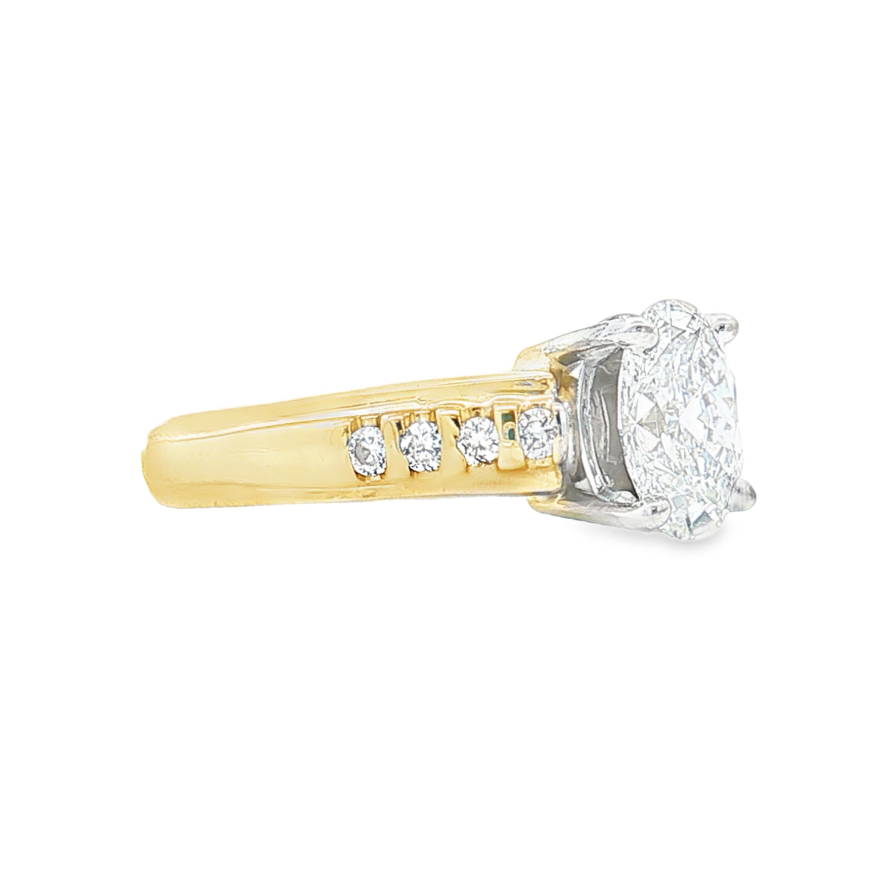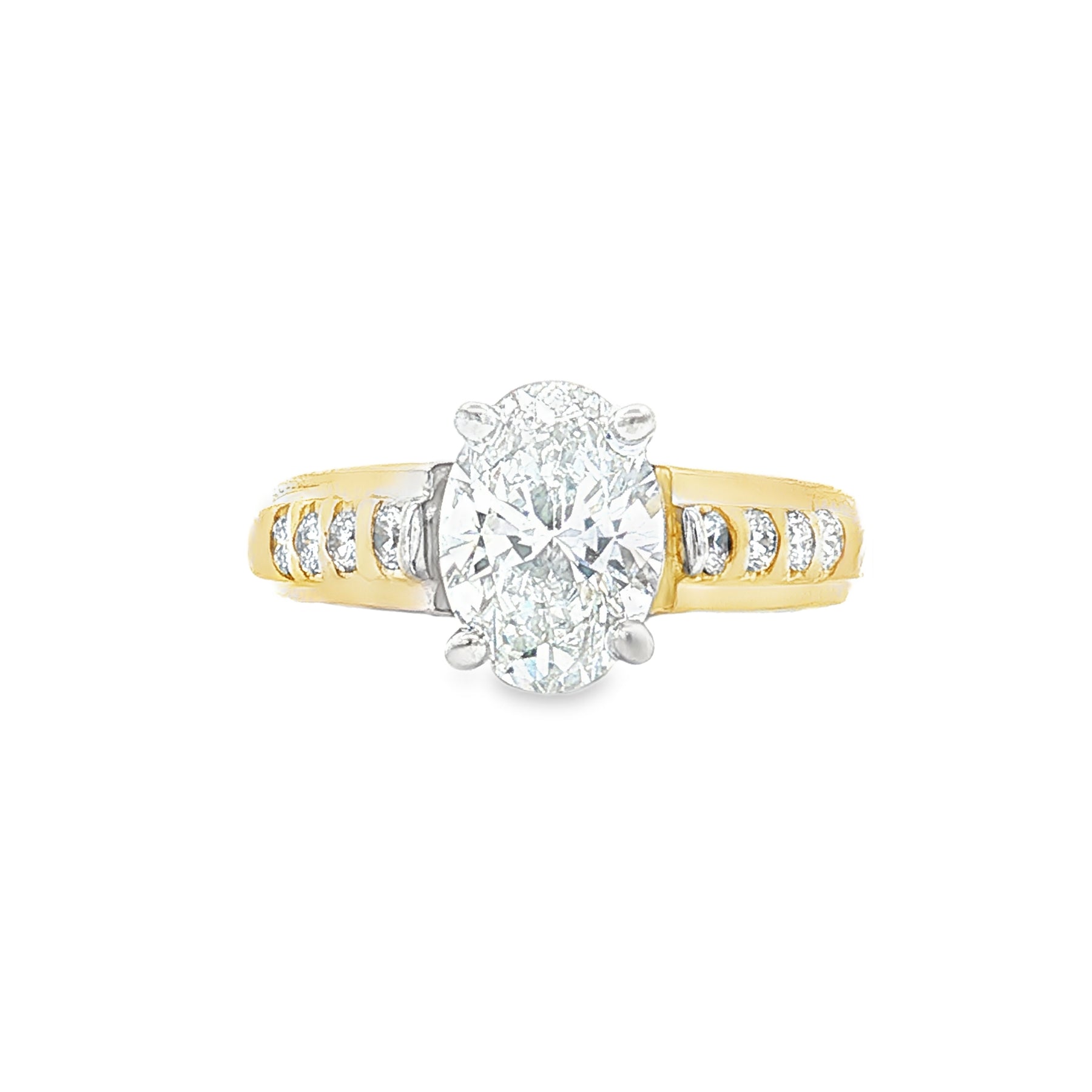 This elegant second-hand estate ring features a stunning 1.28ct oval lab-grown diamond at its center, graded F color and VS1 clarity, set in a polished 14K two-tone white and yellow gold design. Additional lab-grown diamonds totaling .2ct (SI2 clarity, I color) accent the band for added brilliance.