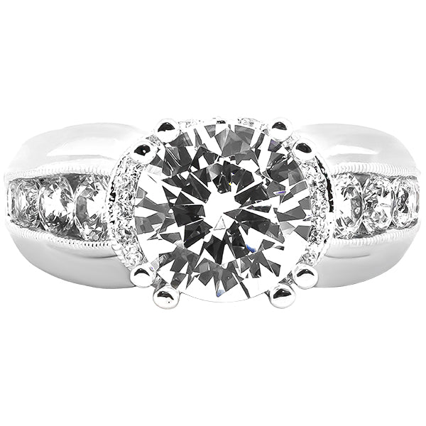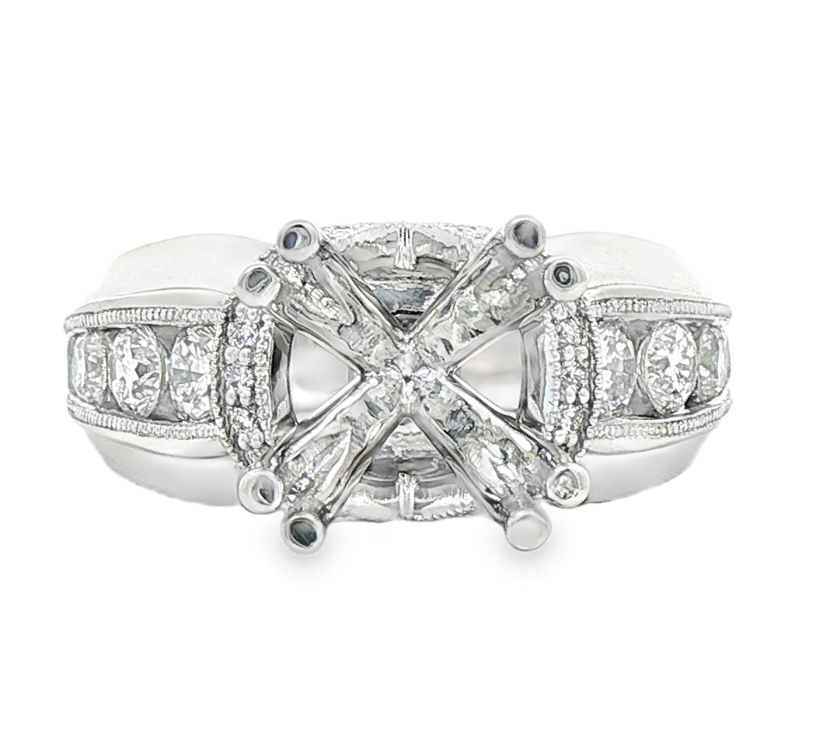 This 14K white gold semi-mount engagement ring features 1.14 carats total weight of natural round brilliant diamonds graded G color and I1 clarity, set along the band to deliver bold brilliance and classic elegance. Designed to showcase a statement center stone, the setting is made to hold a 9.5mm round center diamond, allowing for a fully customized finished ring.