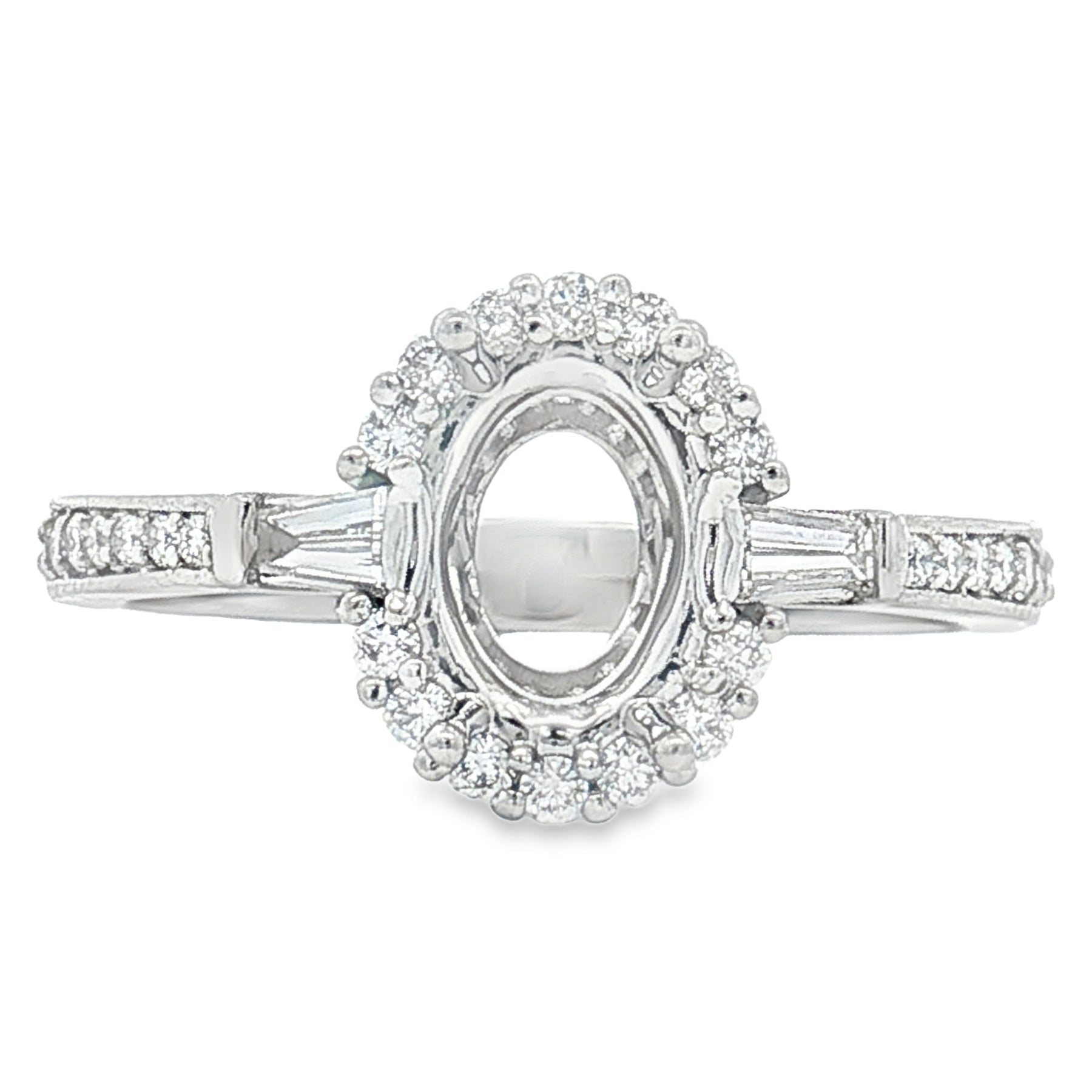This 14K white gold engagement ring semi mount is crafted to showcase a stunning oval center stone, designed to hold a 1ct oval diamond. The ring is accented with .38ct total weight of round brilliant cut diamonds, adding brilliance and dimension to the elegant halo and shoulders. Finished in polished white gold, this semi mount offers a refined and timeless setting ready for your center stone of choice. Ring size is 6.75.