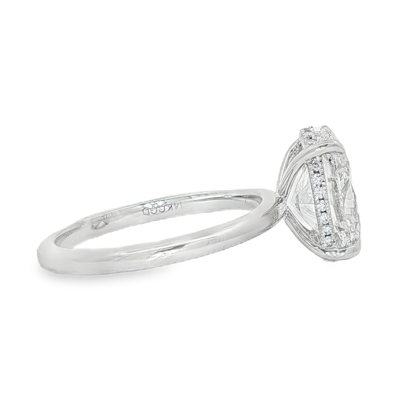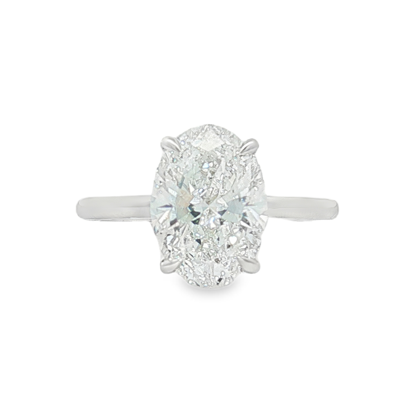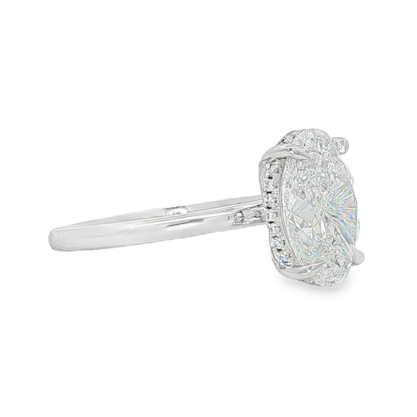 Crafted in timeless elegance, this 14K white gold ring features a dazzling 3ct oval cut lab grown diamond accented by a hidden halo. With its VS+ clarity and E-F color, this diamond captures remarkable brilliance and fire, making it a centerpiece that symbolizes love and devotion. The sleek white gold band enhances the stoneβs natural sparkle, creating a sophisticated and refined silhouette.