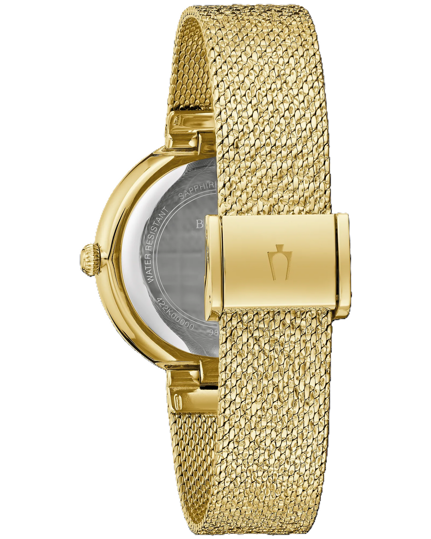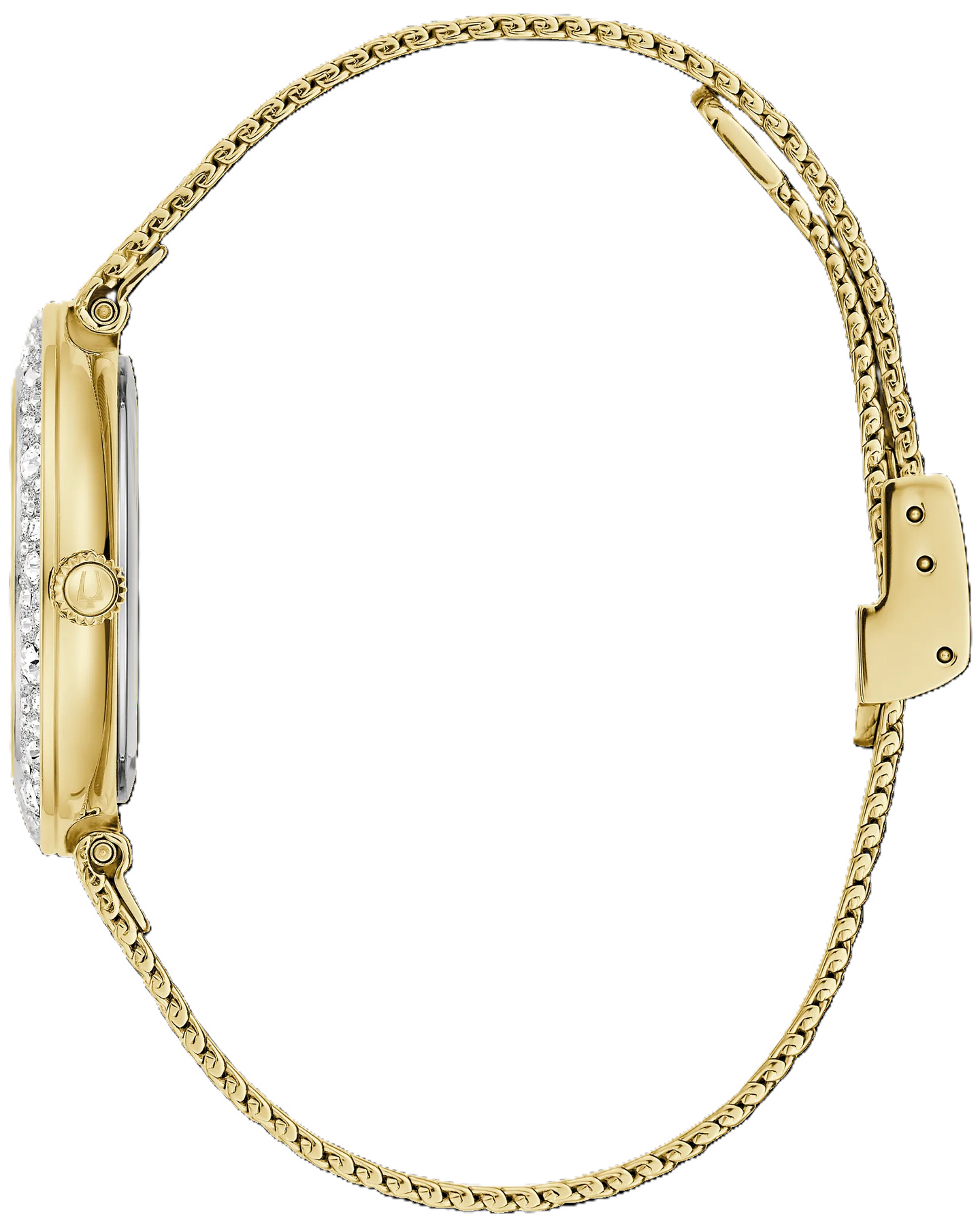 This luxurious Bulova ladies’ Phantom timepiece shines with glamorous warmth, featuring a gold-tone stainless steel case set with 103 Austrian crystals along the bezel. The champagne dial is equally captivating with its refined texture, 11 crystal hour markers, and polished gold-tone hands. A shimmering gold-tone fine mesh bracelet completes the design, offering exceptional comfort with its adjustable sliding buckle.