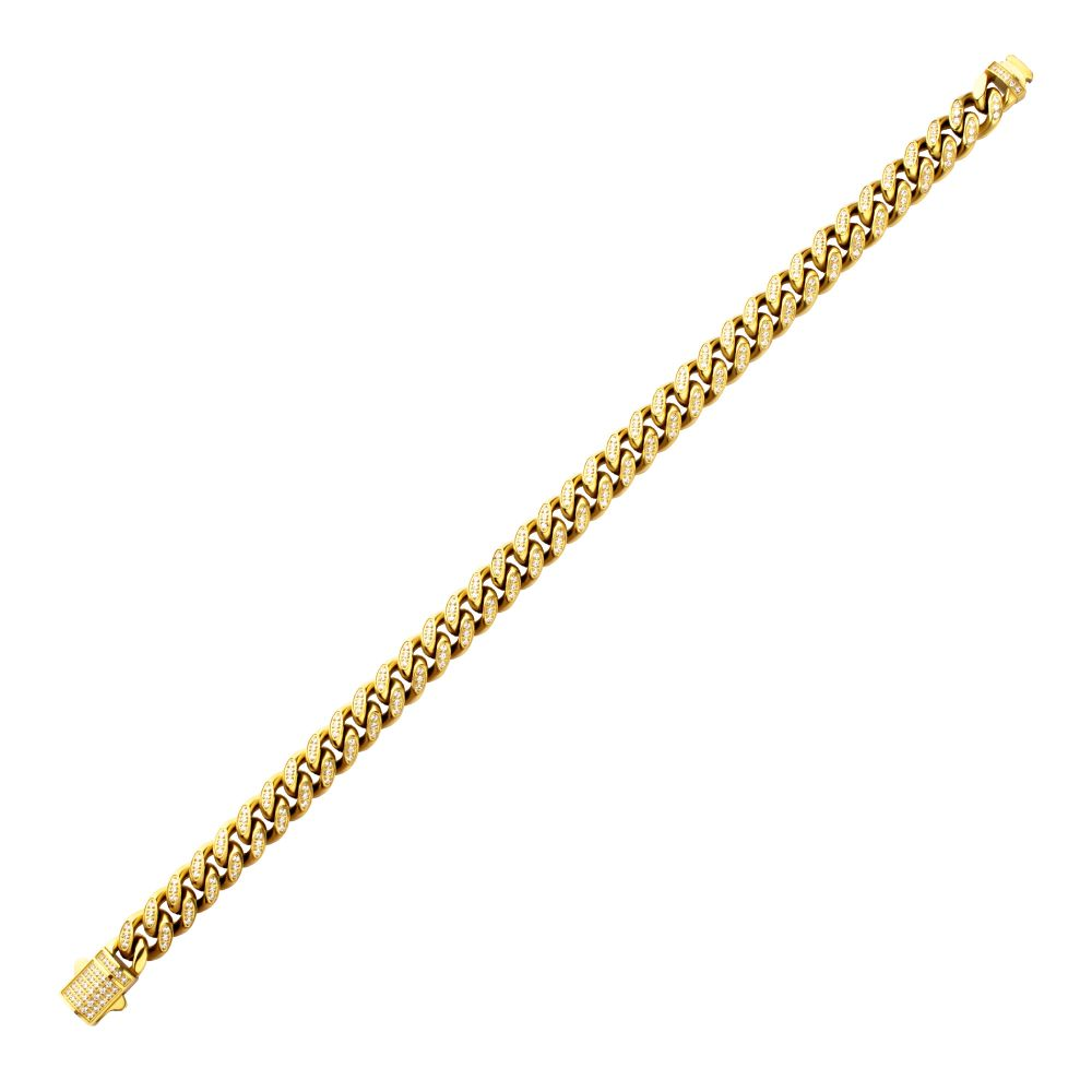 This 8" men's Miami Cuban bracelet delivers bold shine with a refined edge. Crafted in durable 18K gold IP stainless steel, each 8mm link is accented with 1mm clear cubic zirconia set using precision CNC techniques. The Double Tab Box Clasp adds both security and style, making this bracelet a standout piece that elevates any outfit.